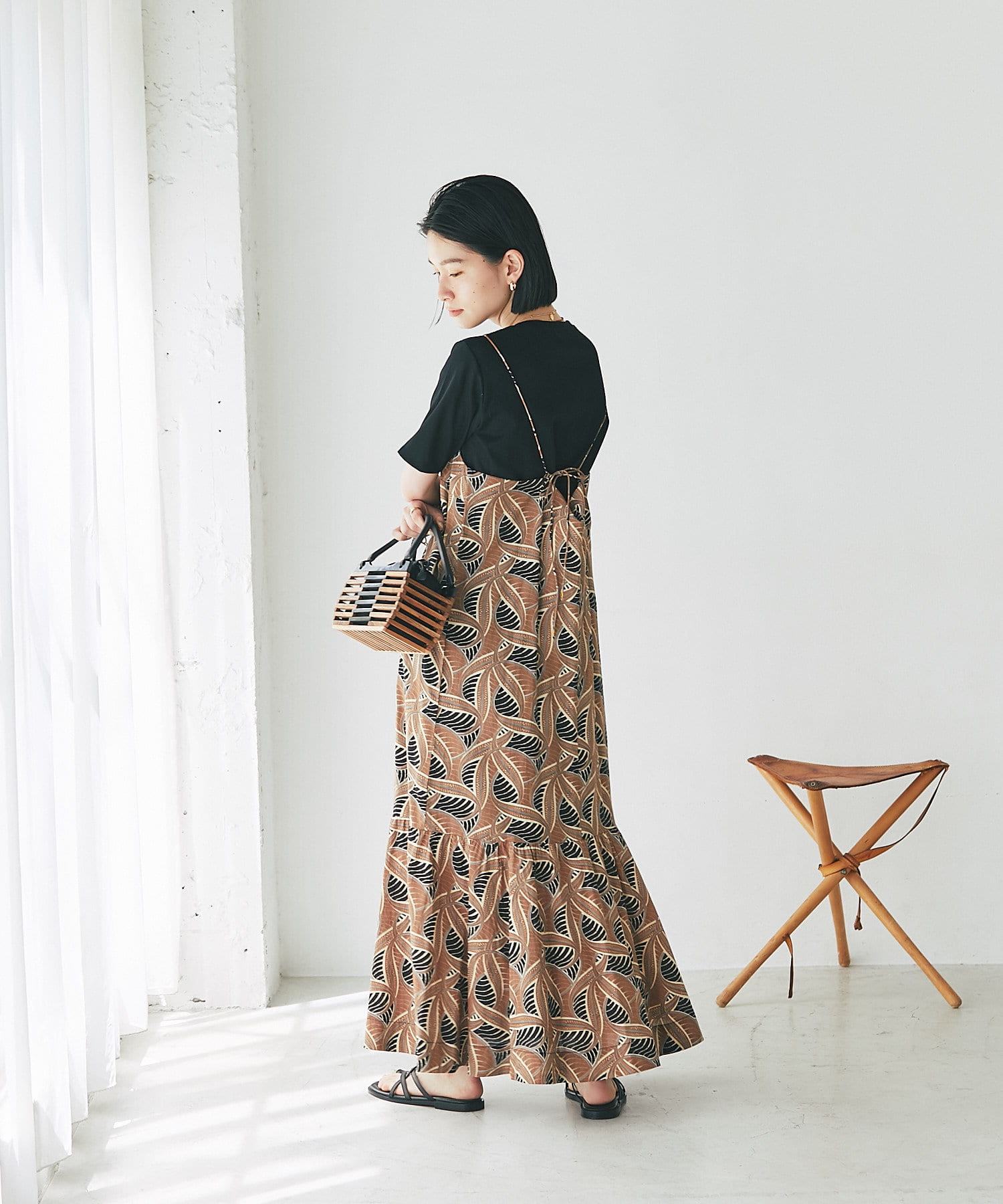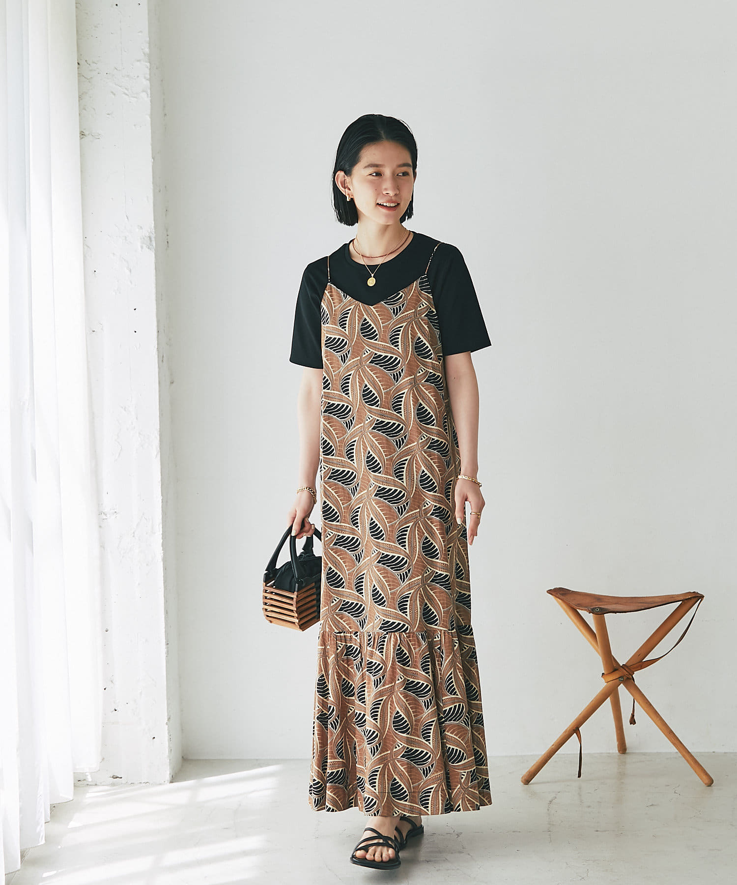ワンピースを主役にしたシンプルなコーディネートがおすすめ。Tシャツ+スニーカー、キャップでカジュアルスタイルを楽しんだり、カップ付きキャミソール+サンダル、かごバッグのリラクシーなスタイルも様になります。小物で雰囲気が変わるので、お気に入りの組み合わせで個性が出せるアイテムです。