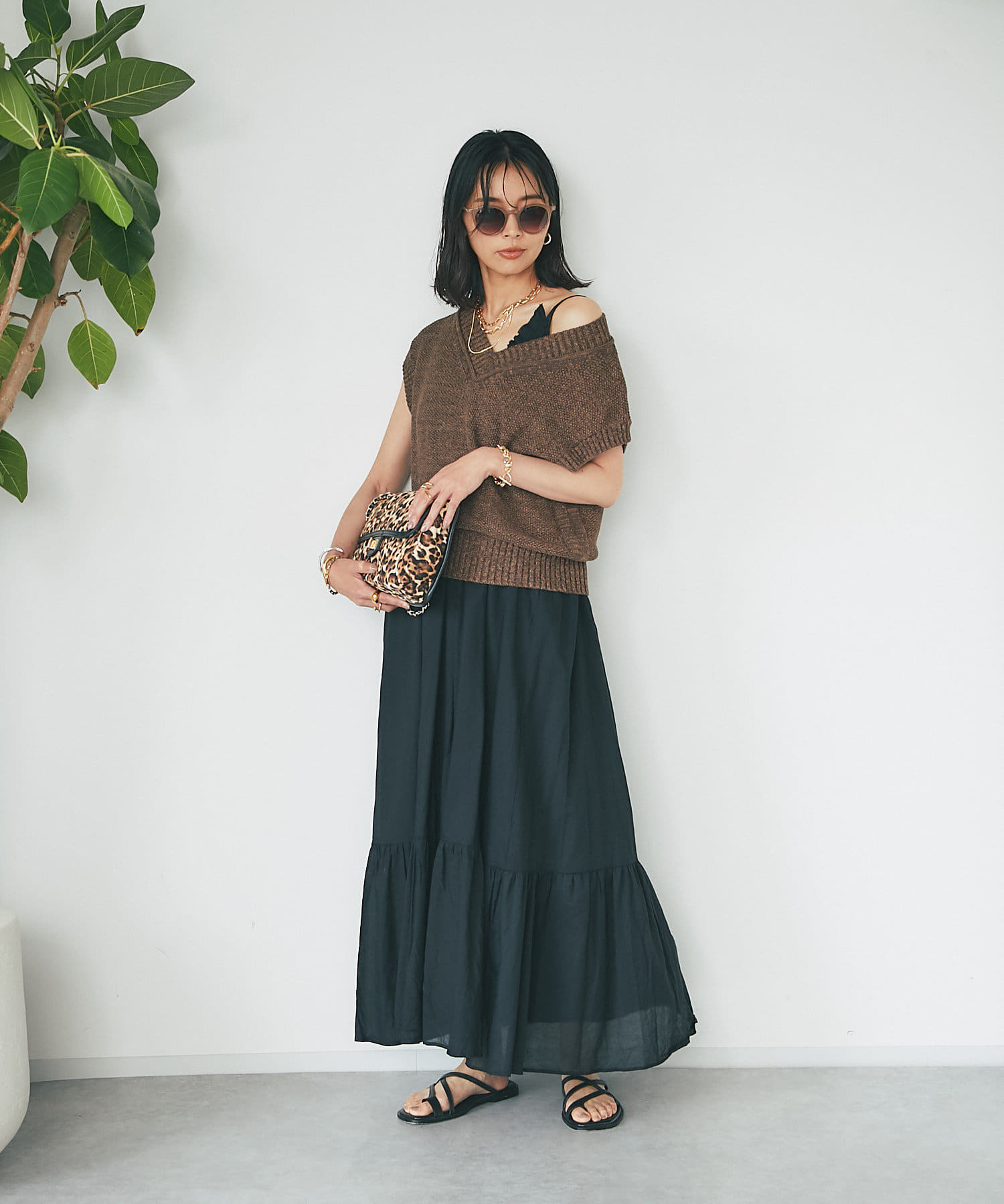 155㎝の方の場合、フラットなシューズと合わせた状態でマキシ丈にて着用可能です。坂道や階段を歩く際には裾が床に触れる可能性があるため、マキシ丈や裾が気になる方はヒールや厚底の靴を合わせていただくのがおすすめです。