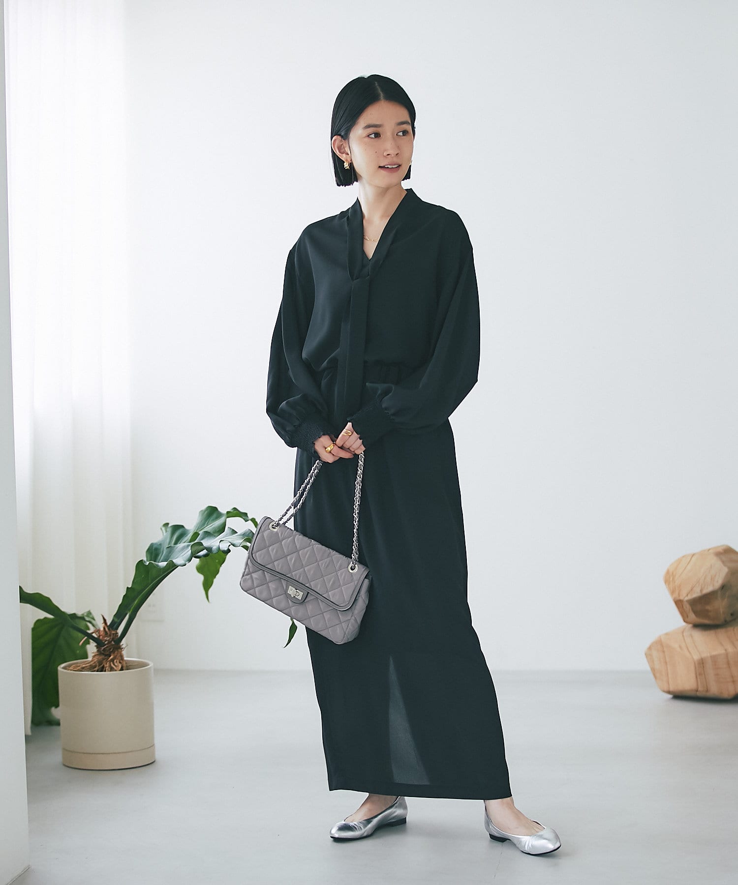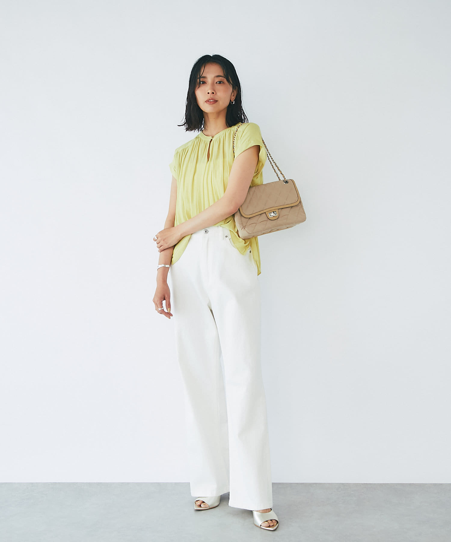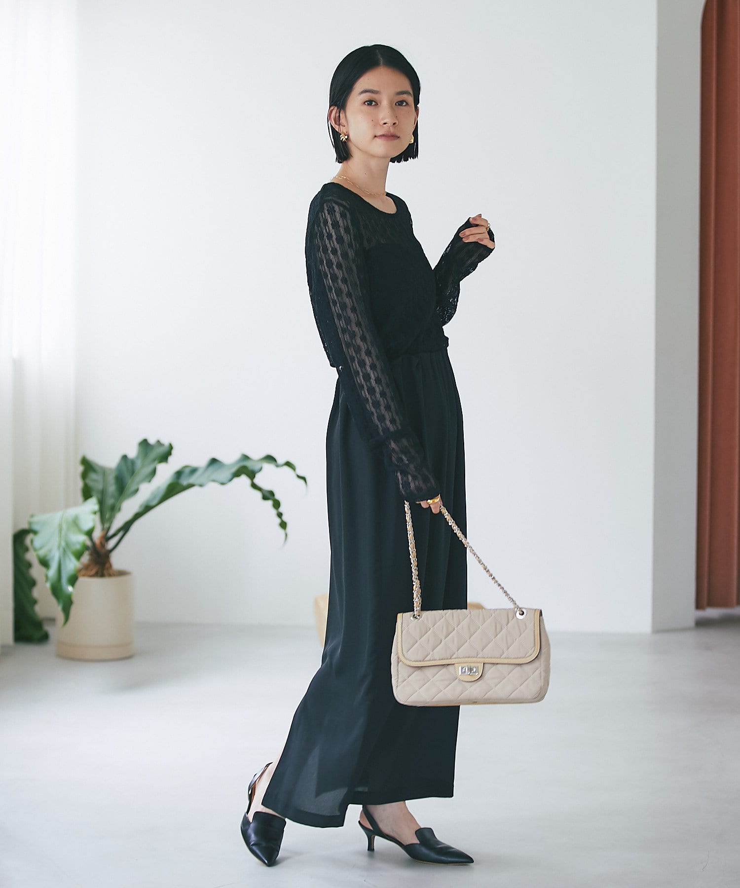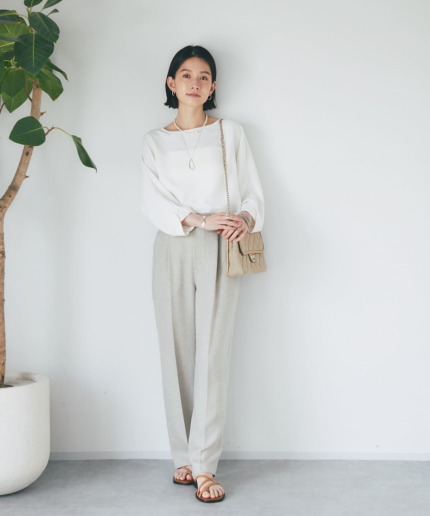 ニュアンスカラーが品のあるスタイリングに仕上げる