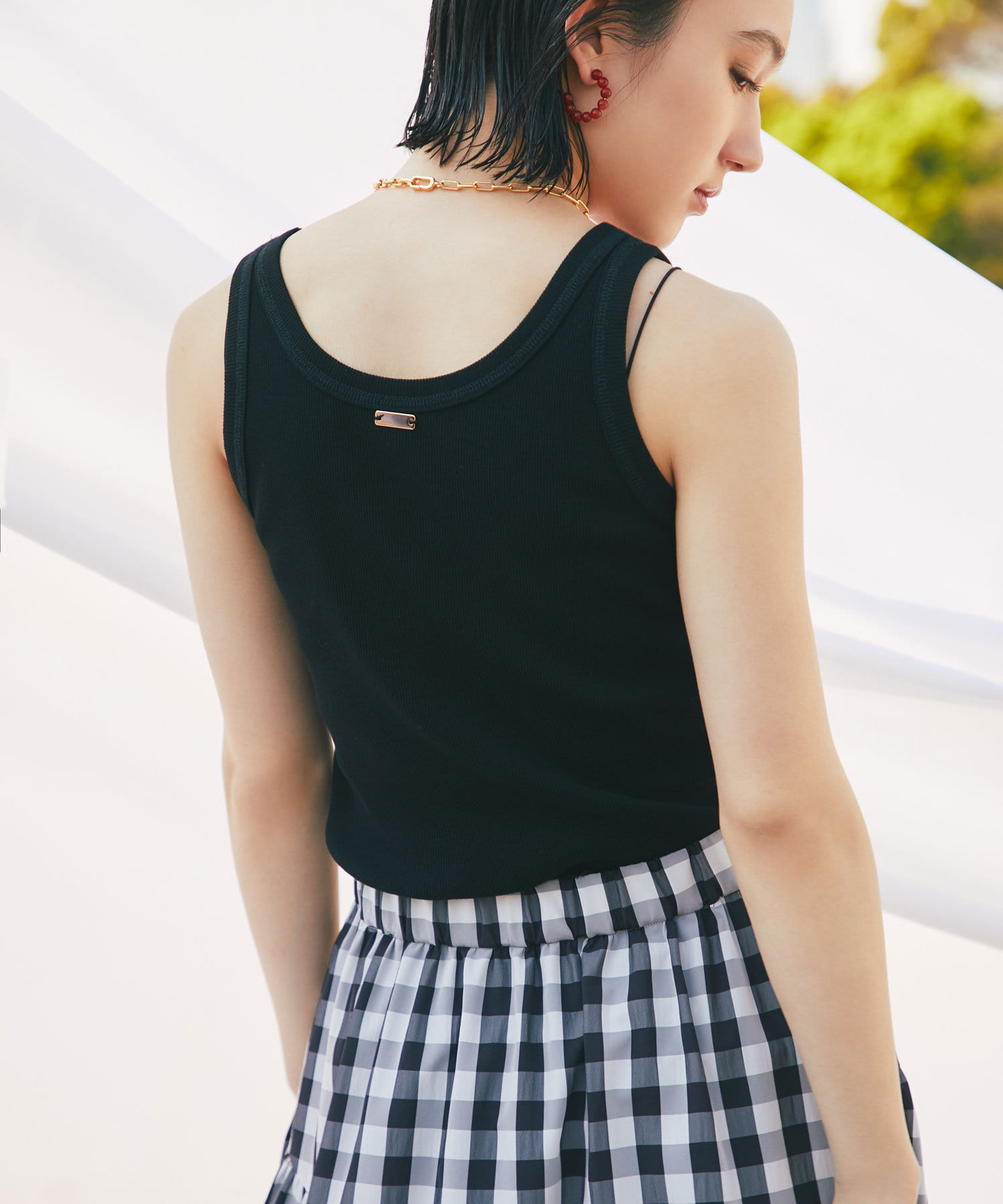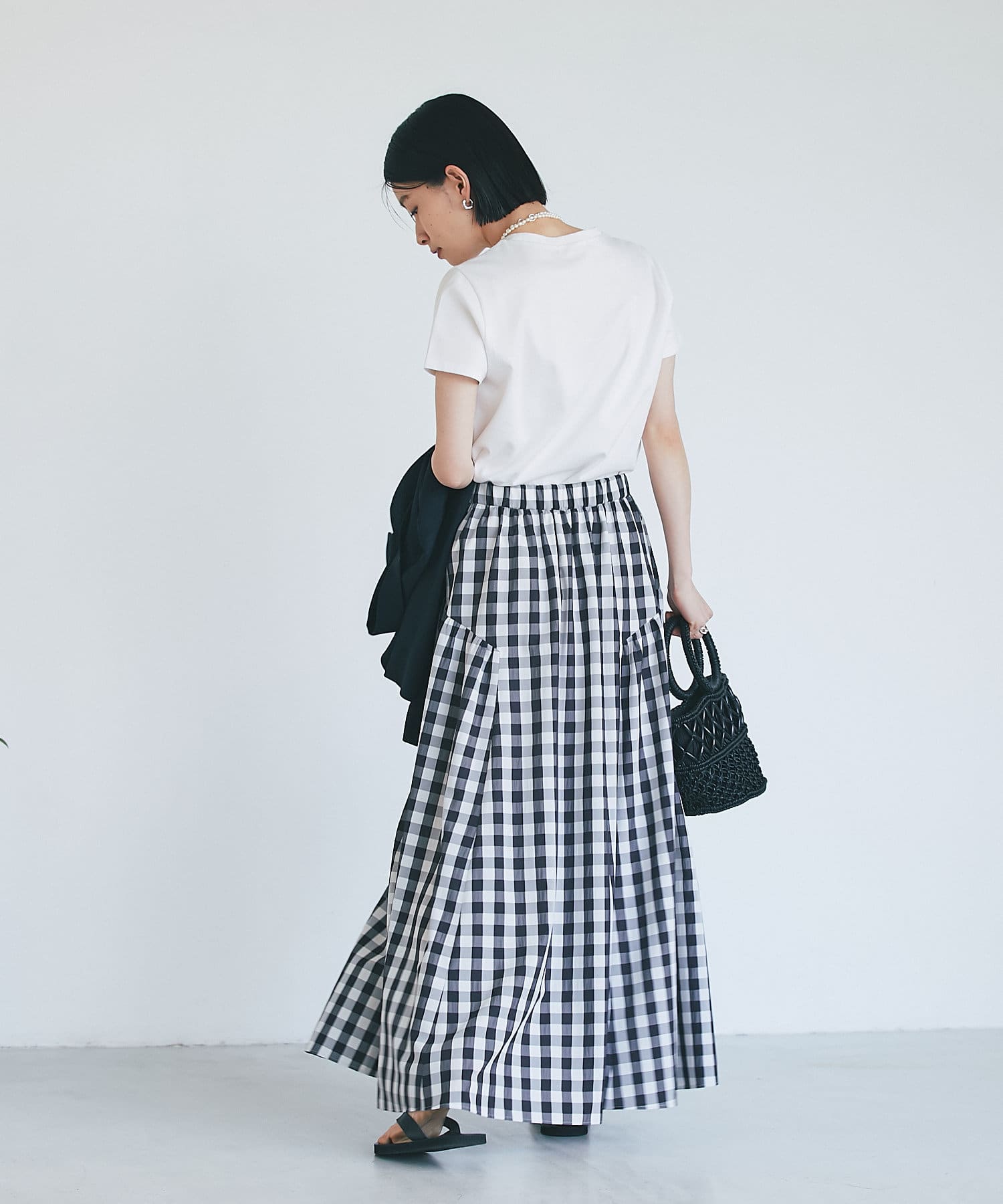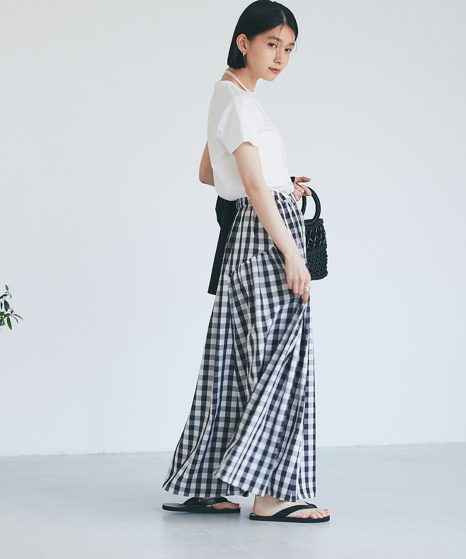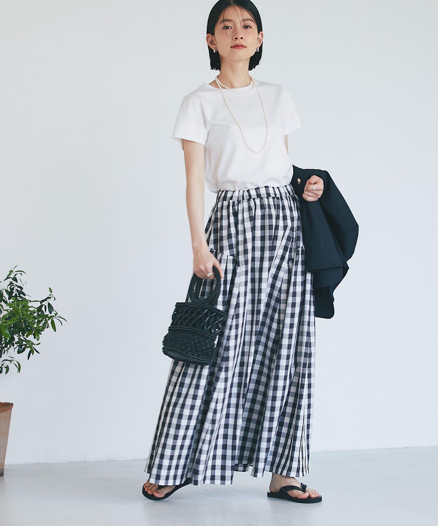 ギンガムチェックはレディライクなイメージがありますが、さらっと軽い素材感で甘すぎないためカジュアルにも着られます。