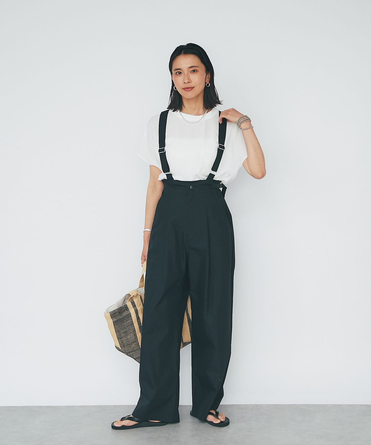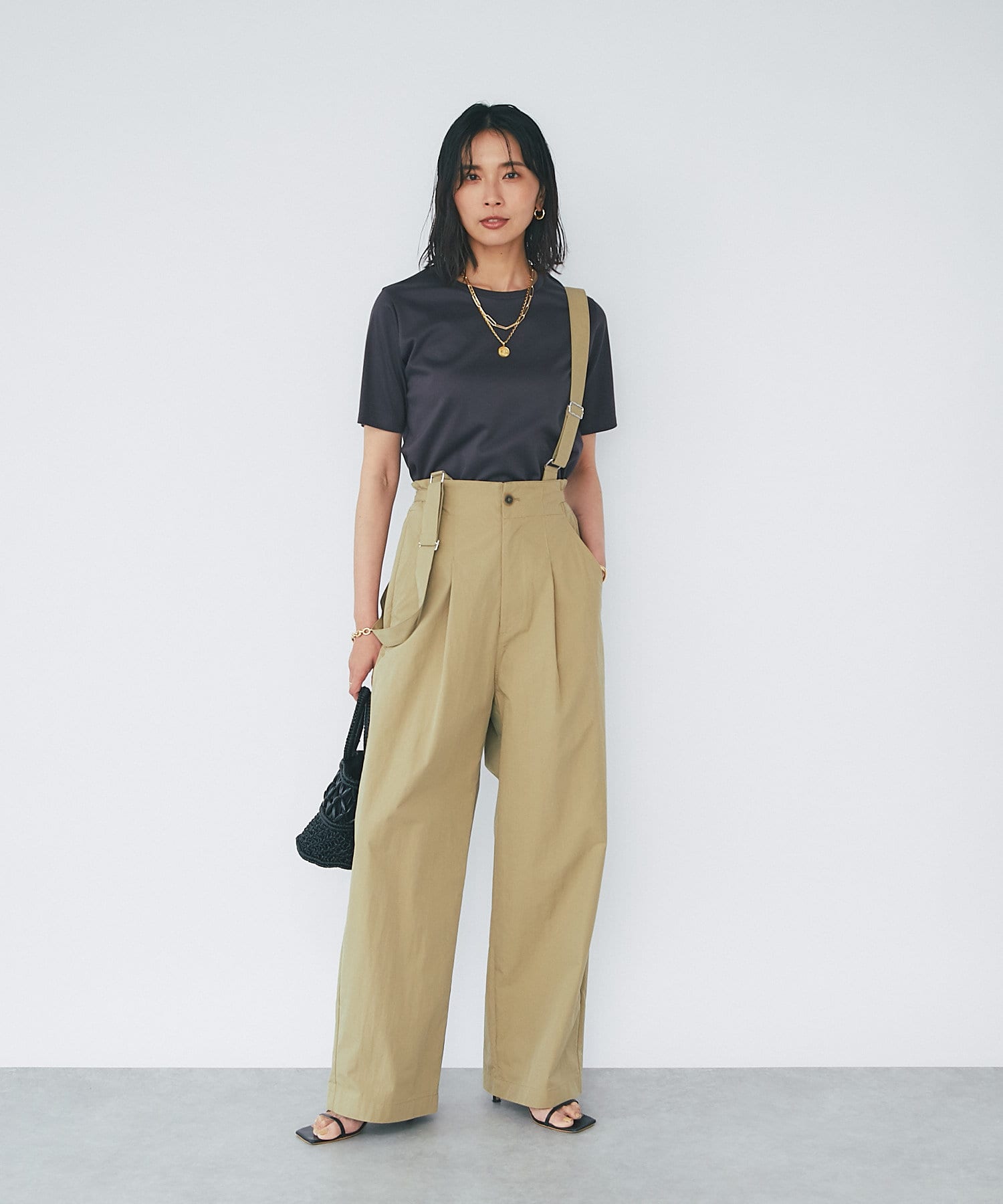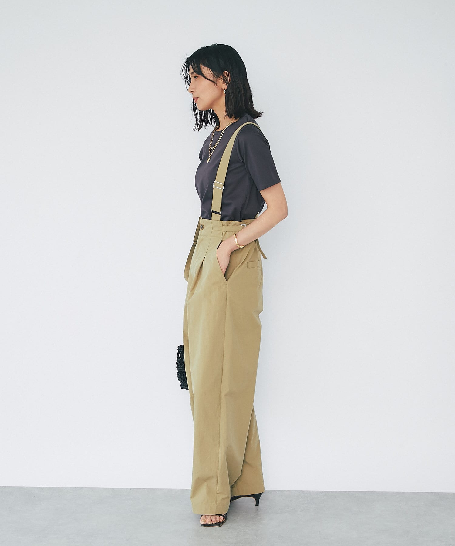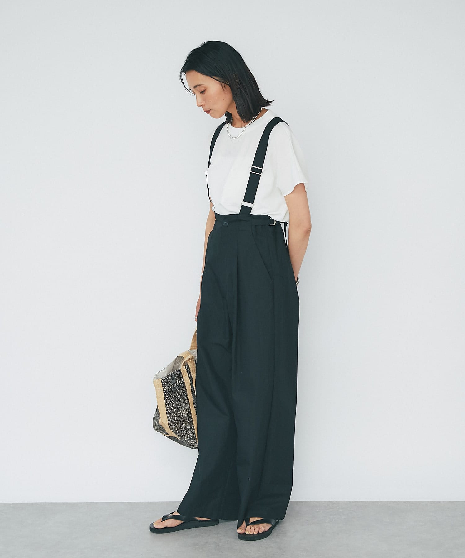 サスペンダーがこなれ感をプラスしてくれるワイドパンツ。