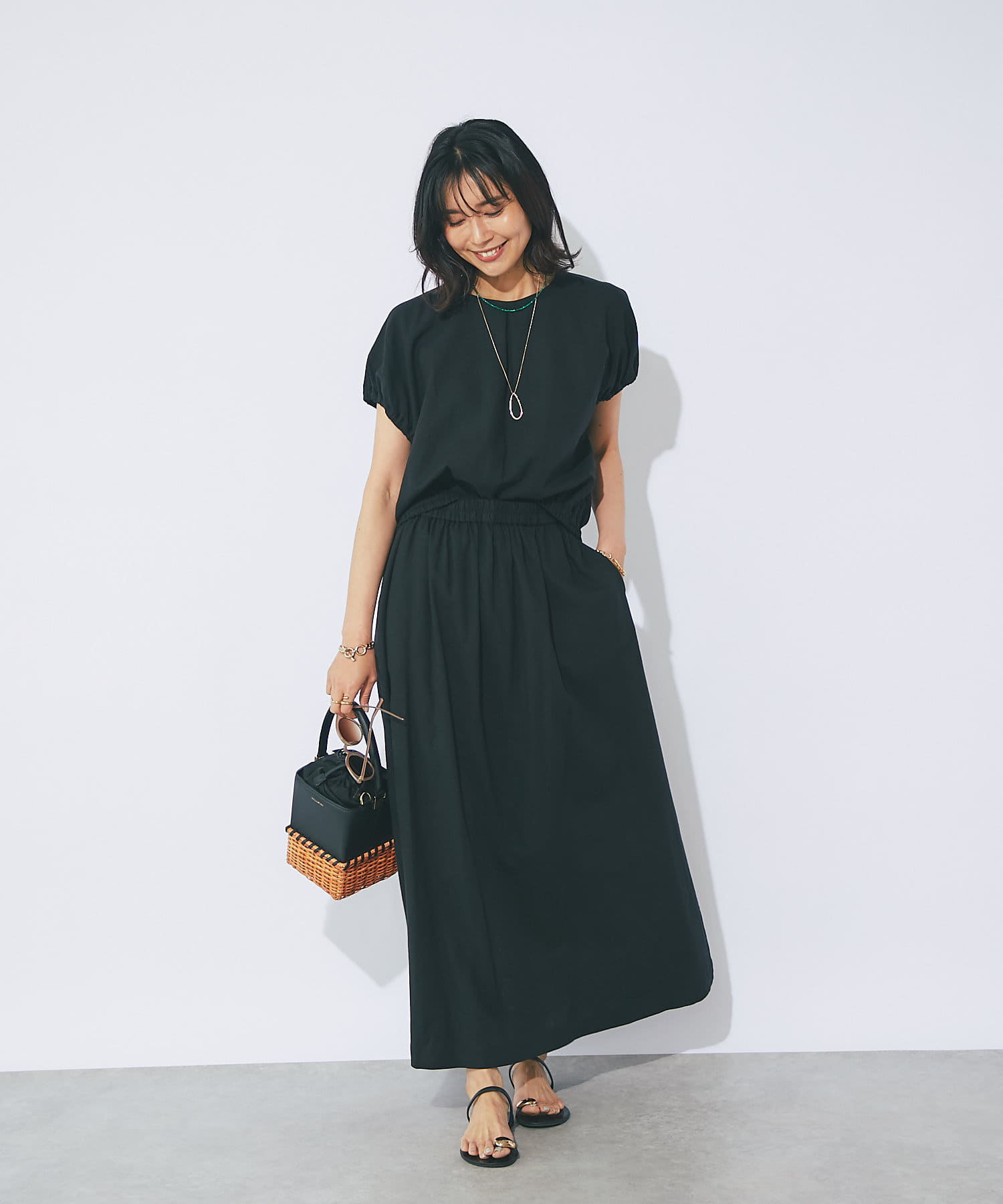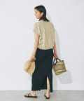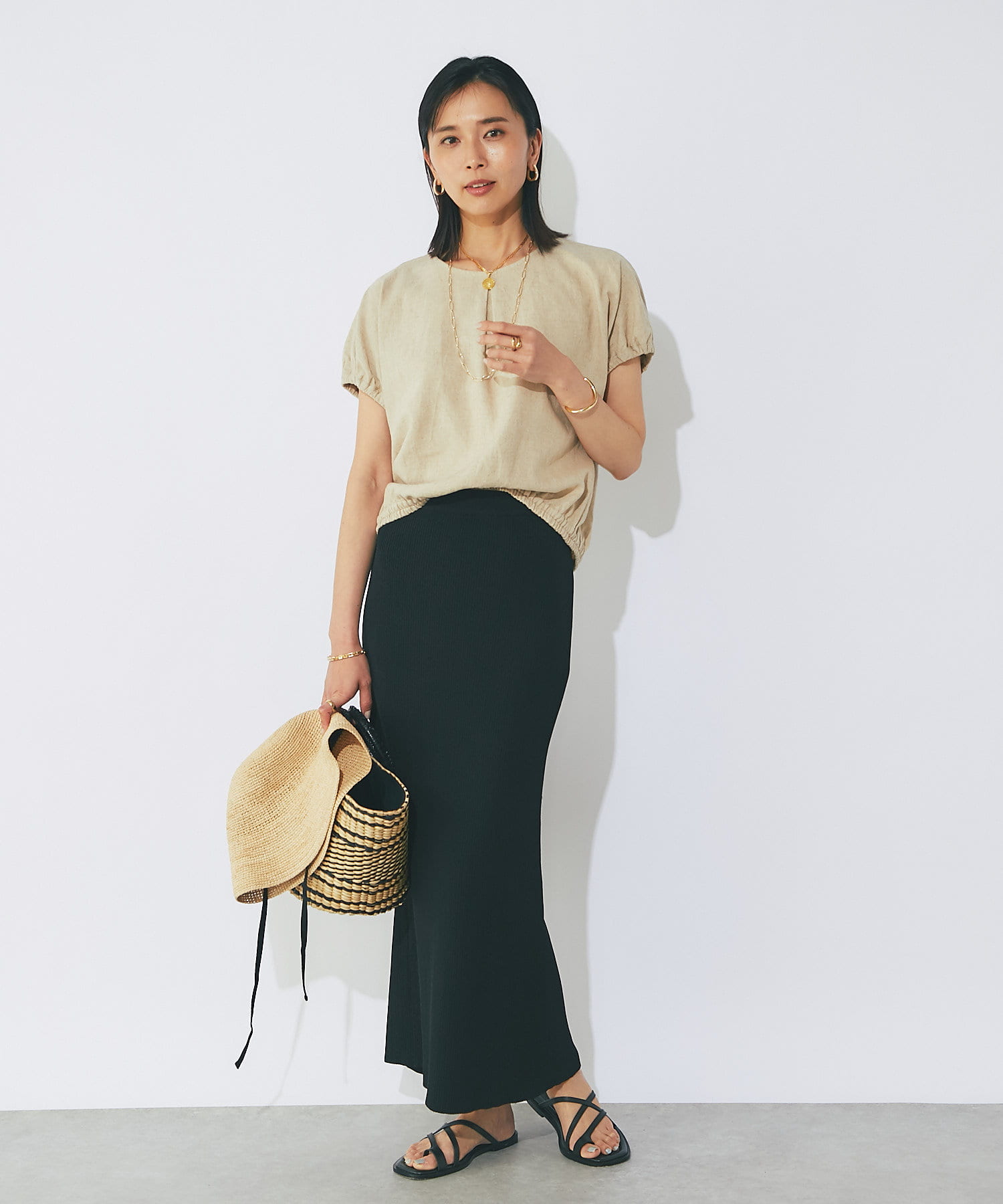 より女性らしくまとめたい日は、ブラックやベージュなど、ベーシックなカラーのIラインのロングスカートを合わせていただくのがオススメです。