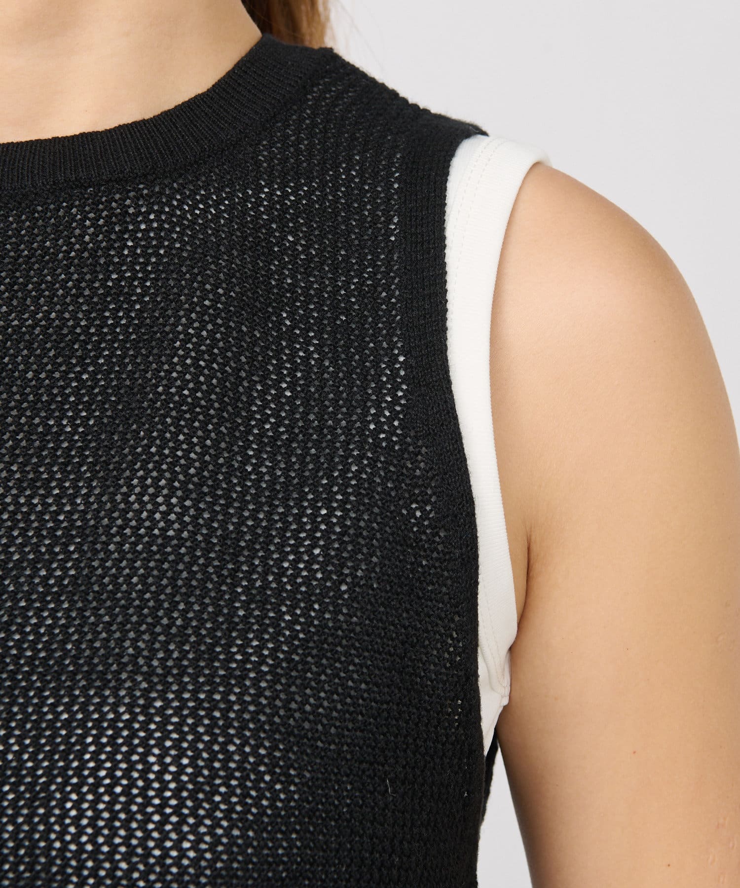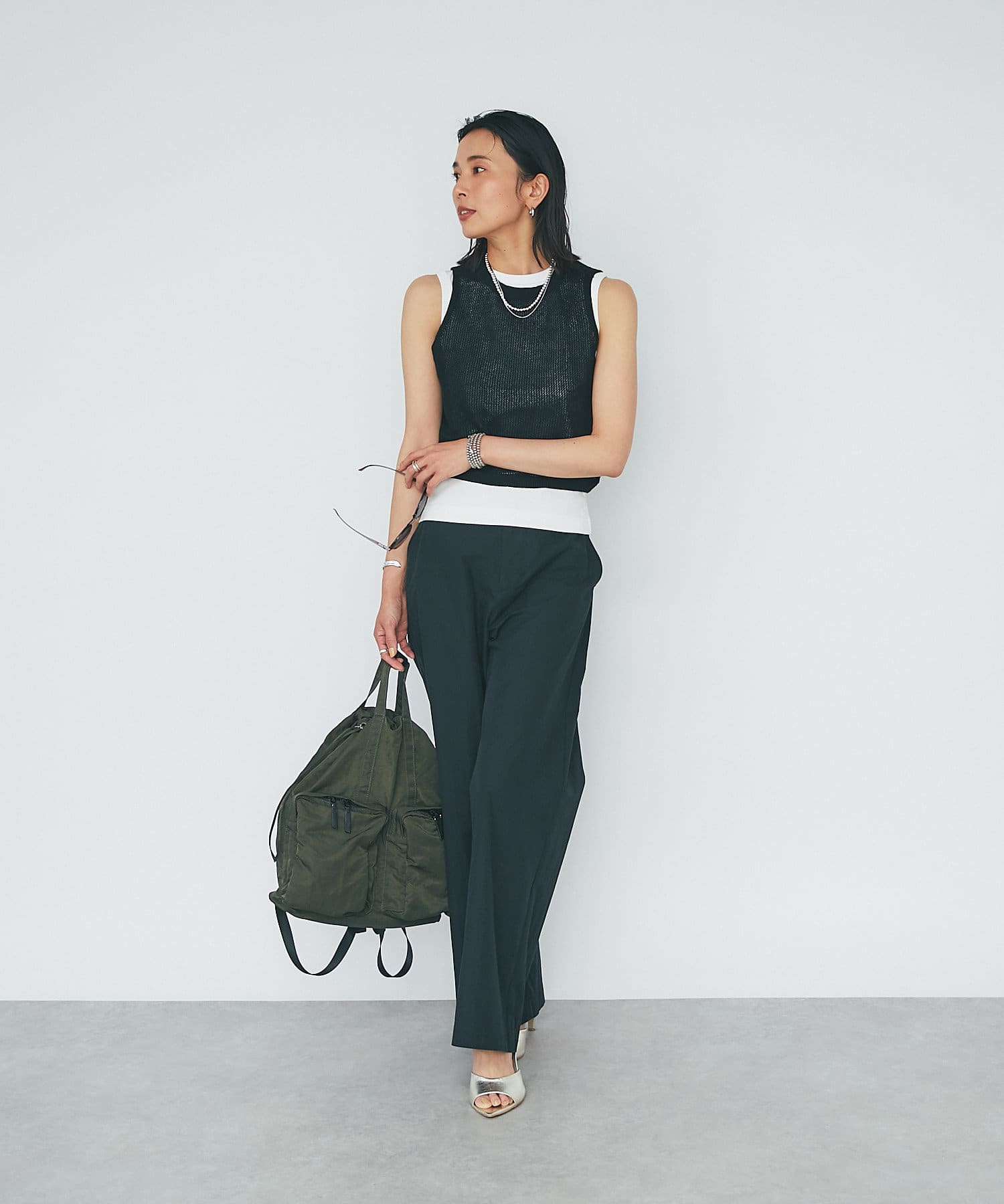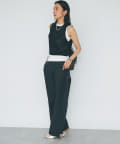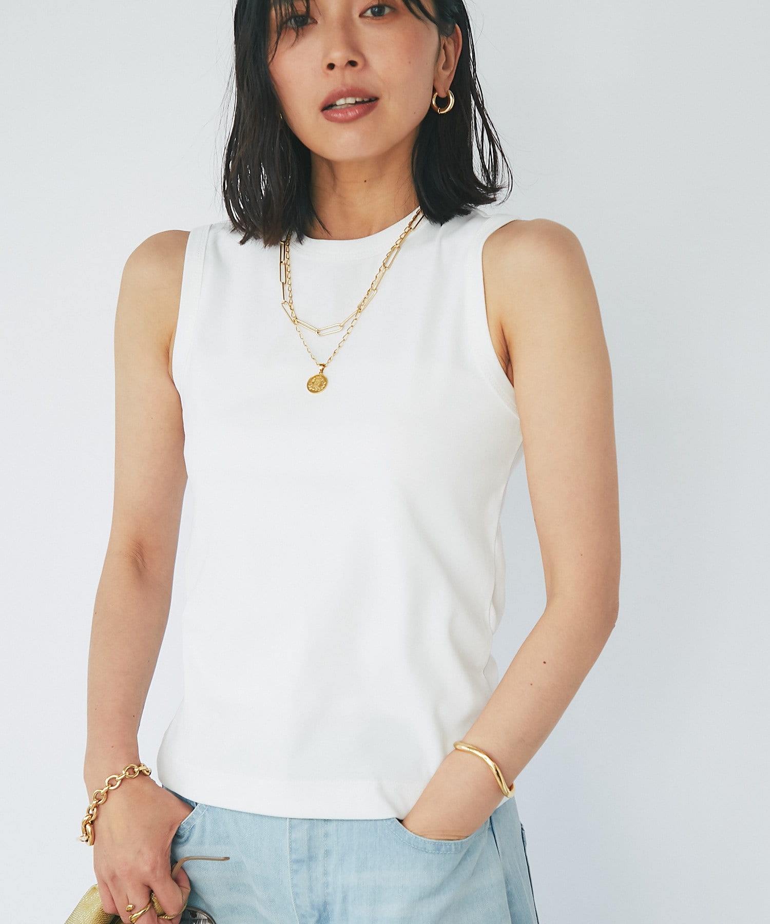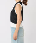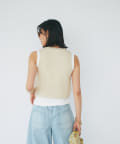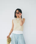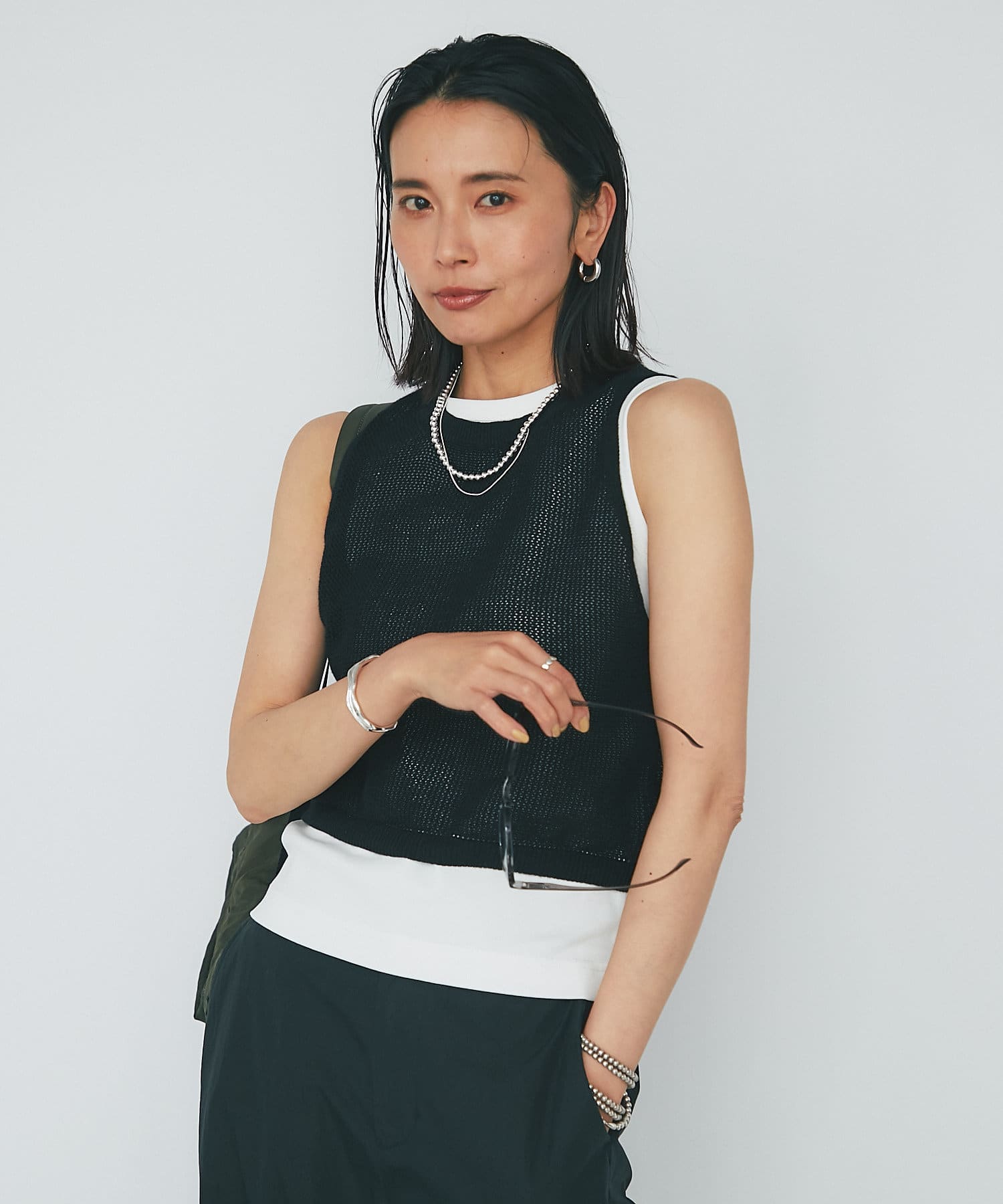 すっきりとしたシルエットのノースリカットソーと、旬のクロップド丈のニットベストがセットになって登場です。