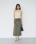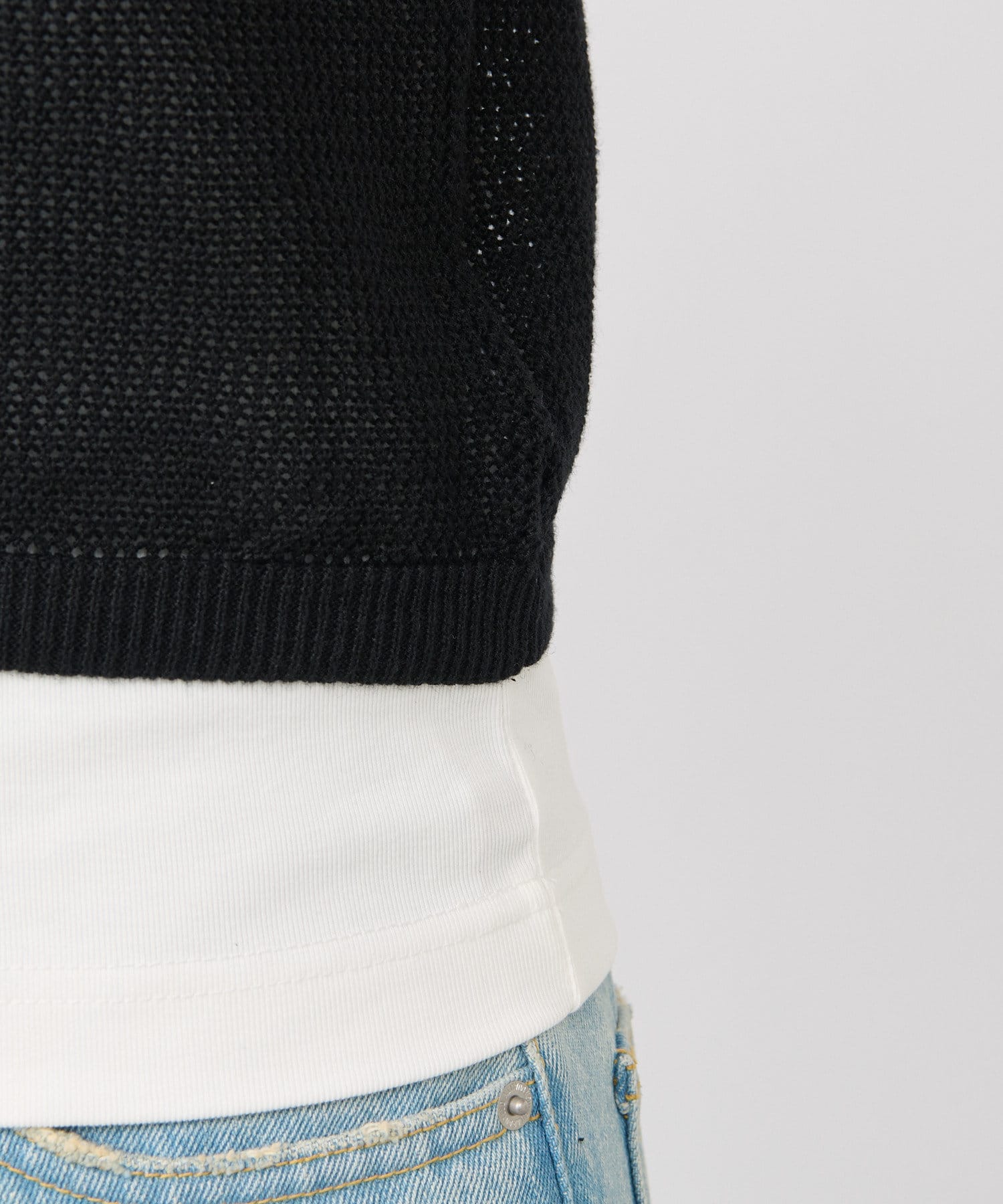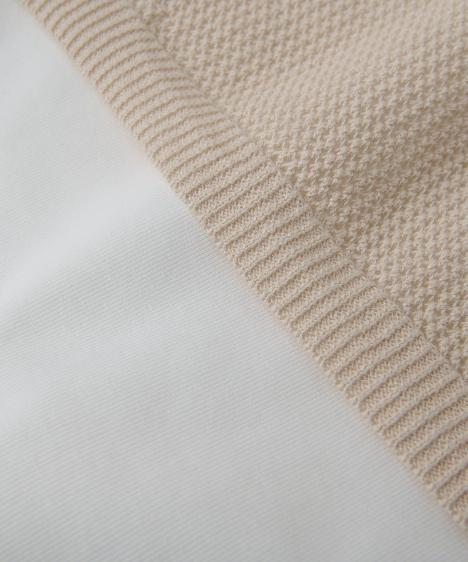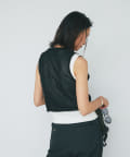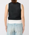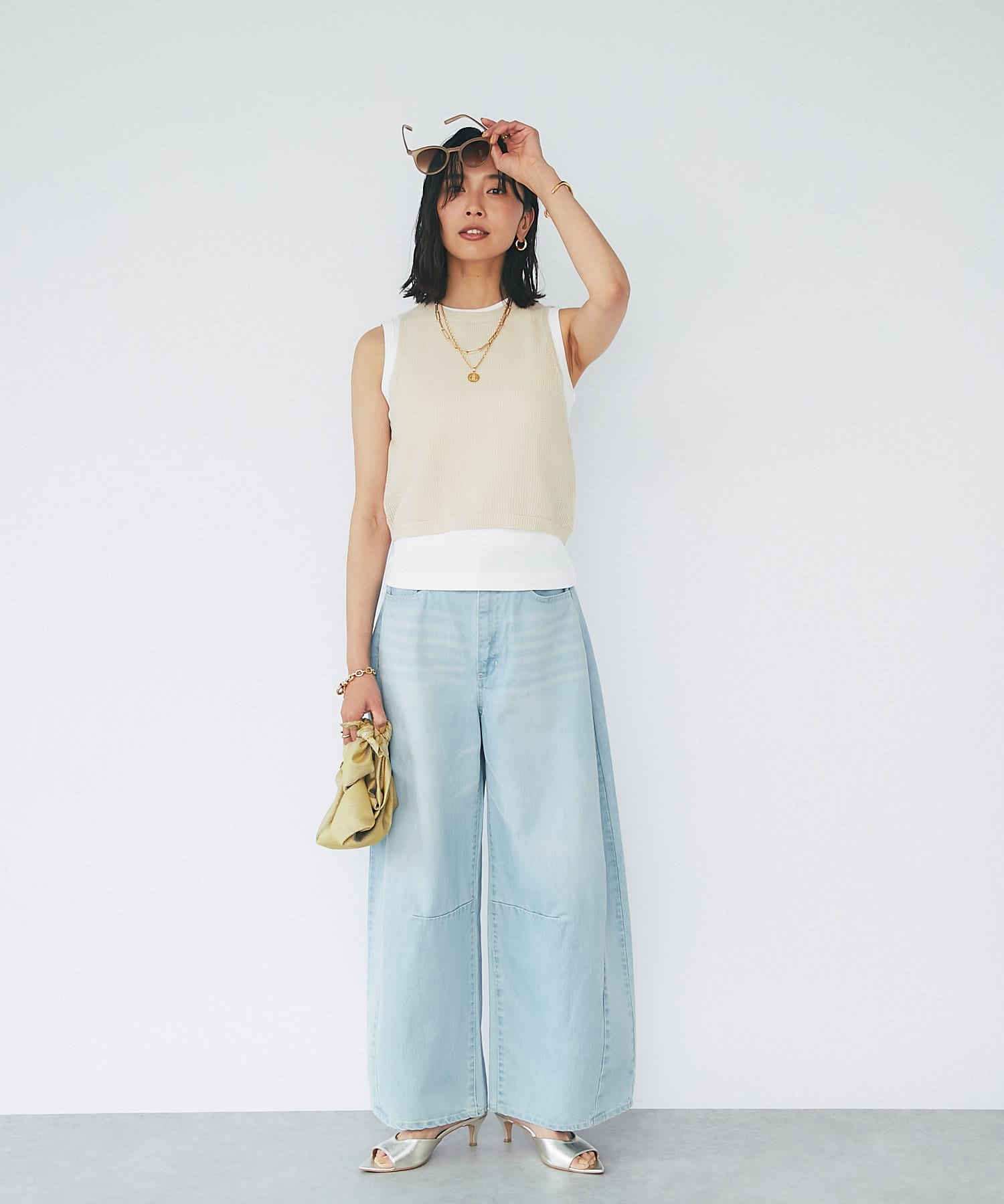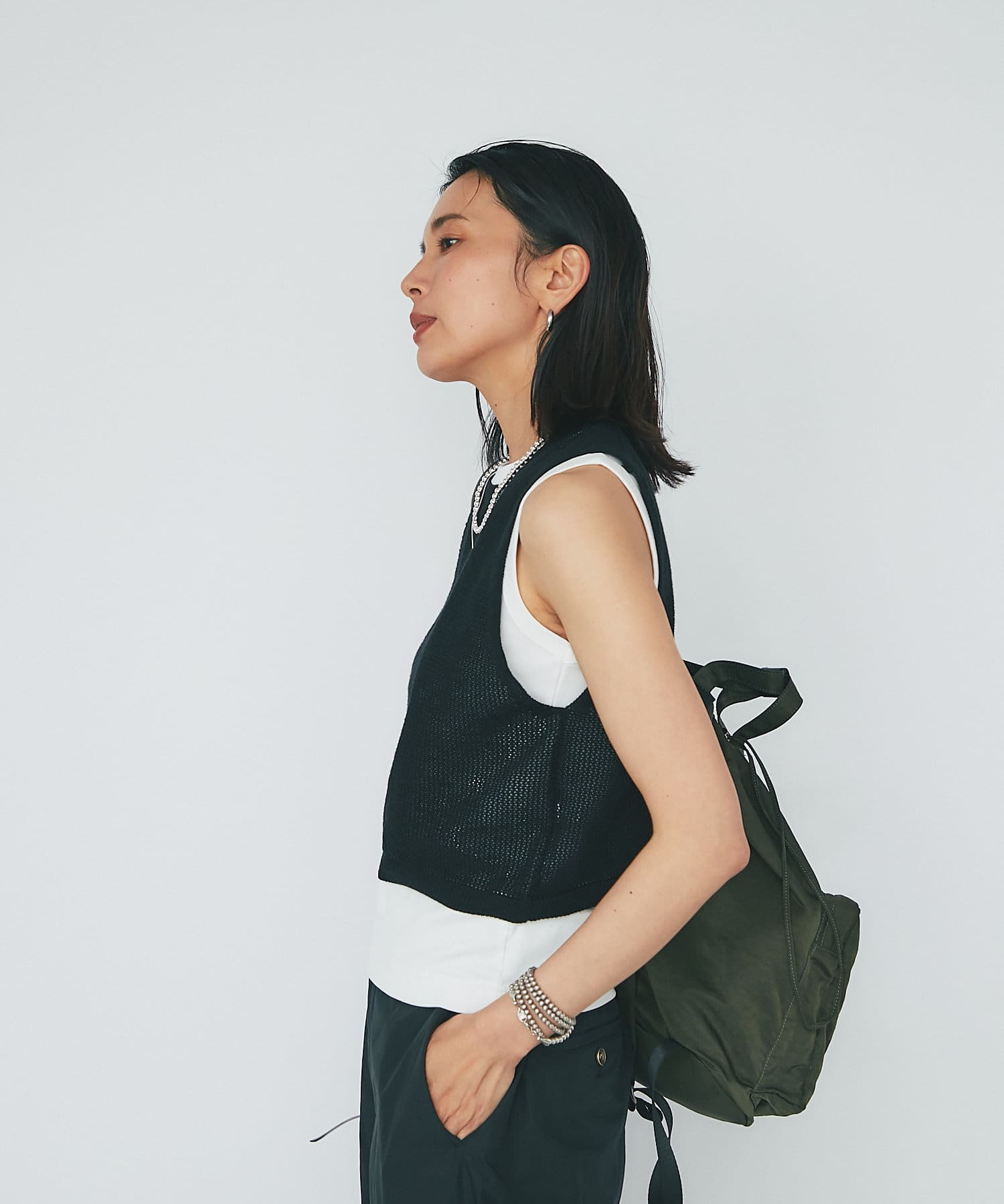 すっきりとしたシルエットのノースリカットソーと、旬のクロップド丈のニットベストがセットになって登場です。