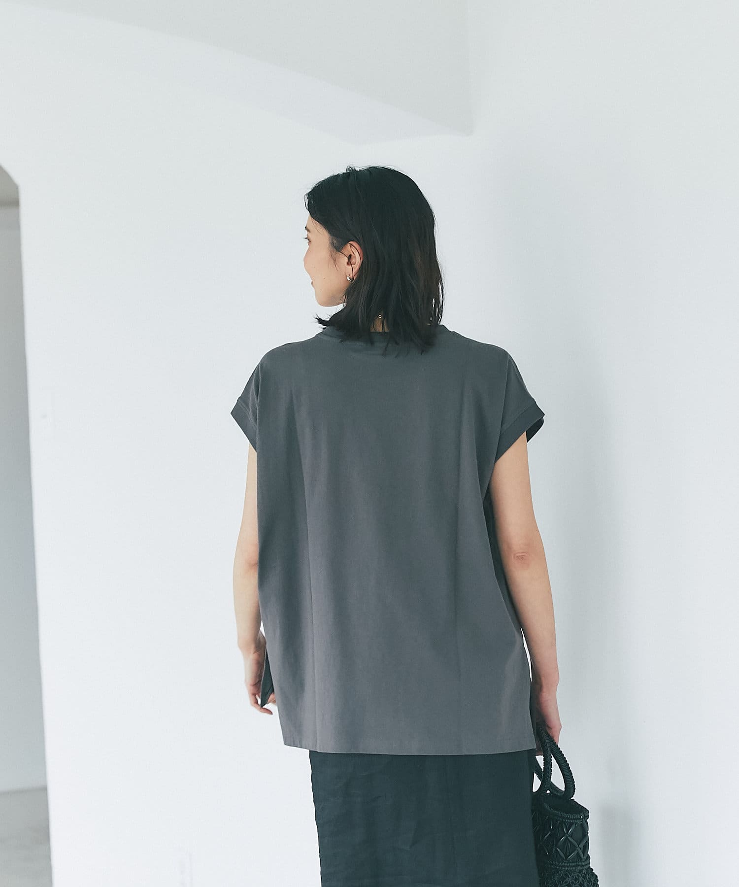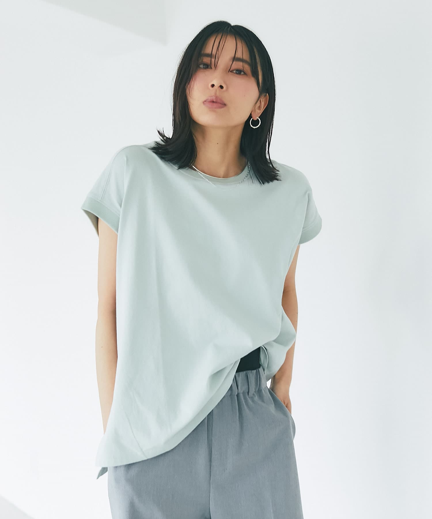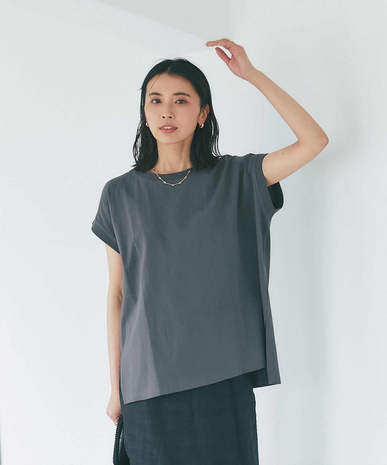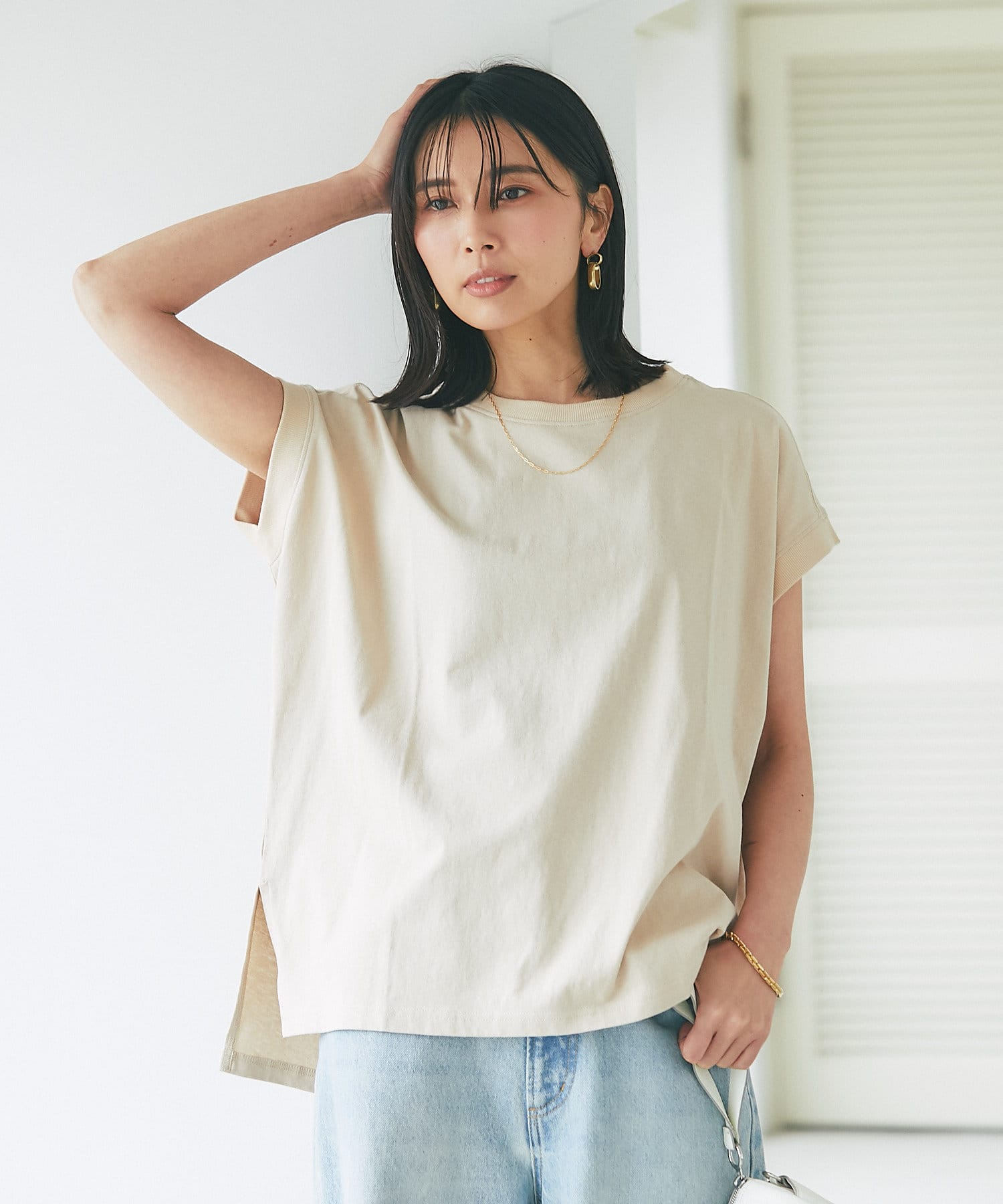 フレンチスリーブで腕周りがすっきりとして見えるアイテムのため、コンパクトな印象になるこちらの一枚。