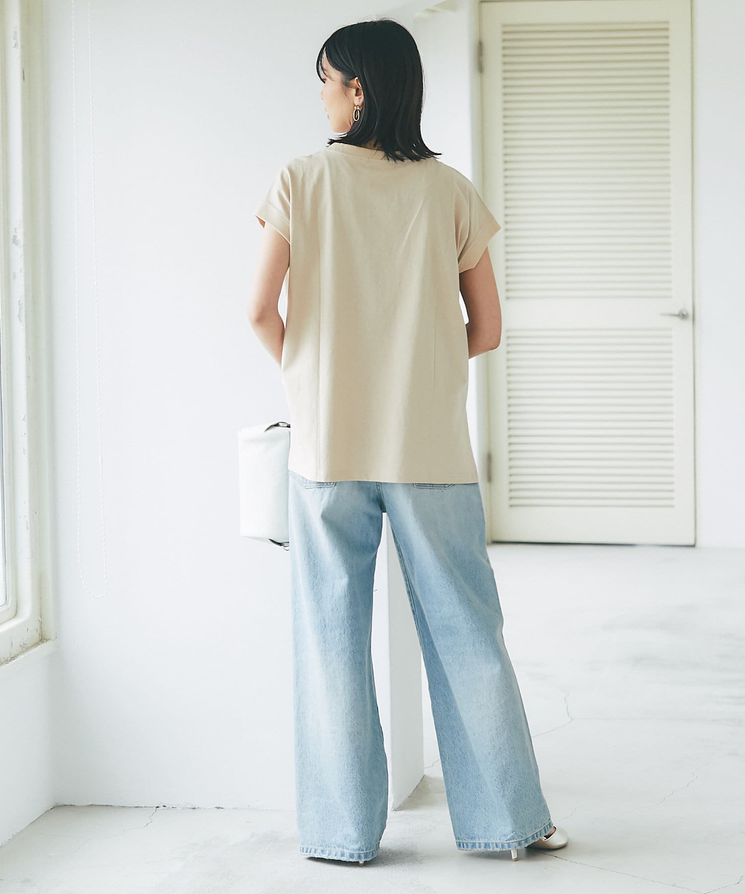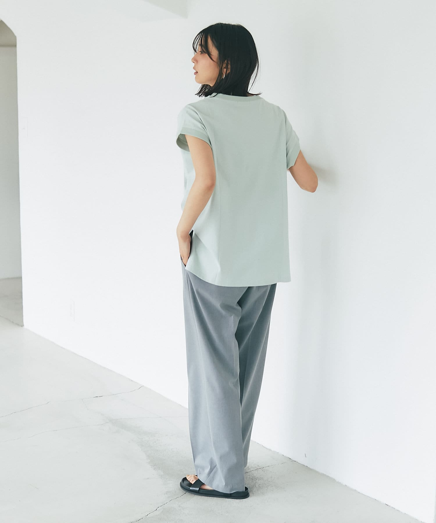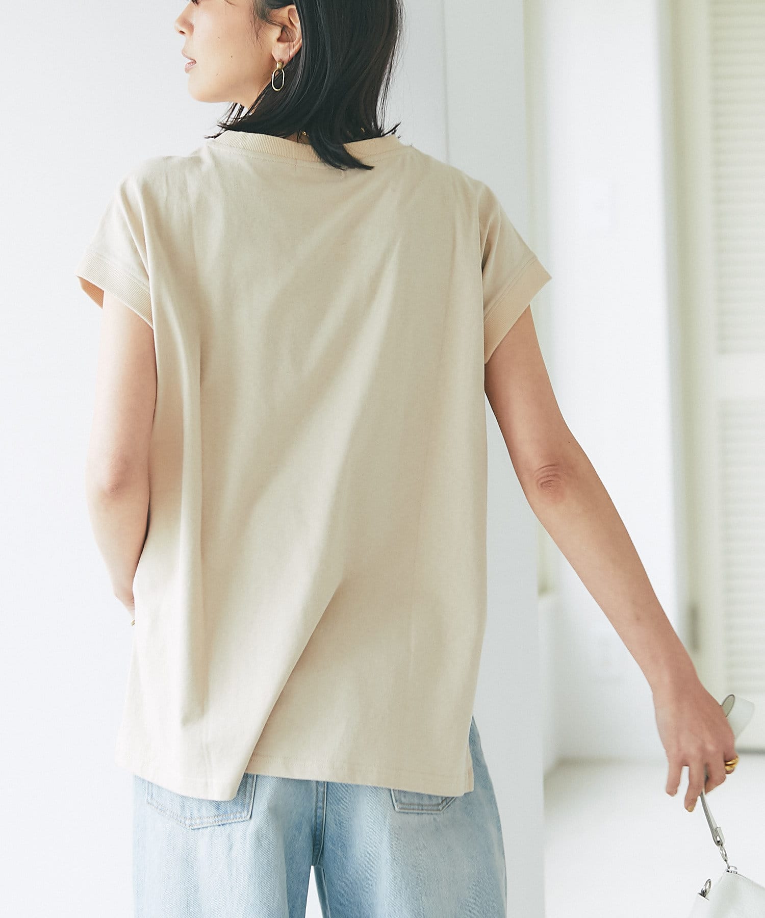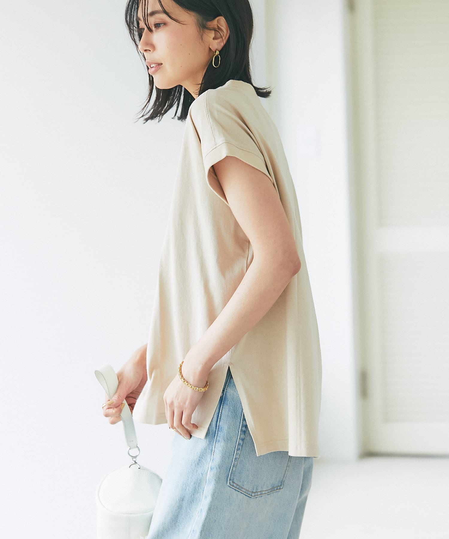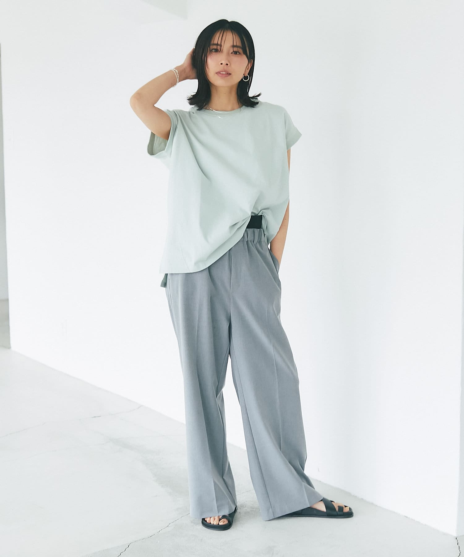 フレンチスリーブで腕周りがすっきりとして見えるアイテムのため、コンパクトな印象になるこちらの一枚。