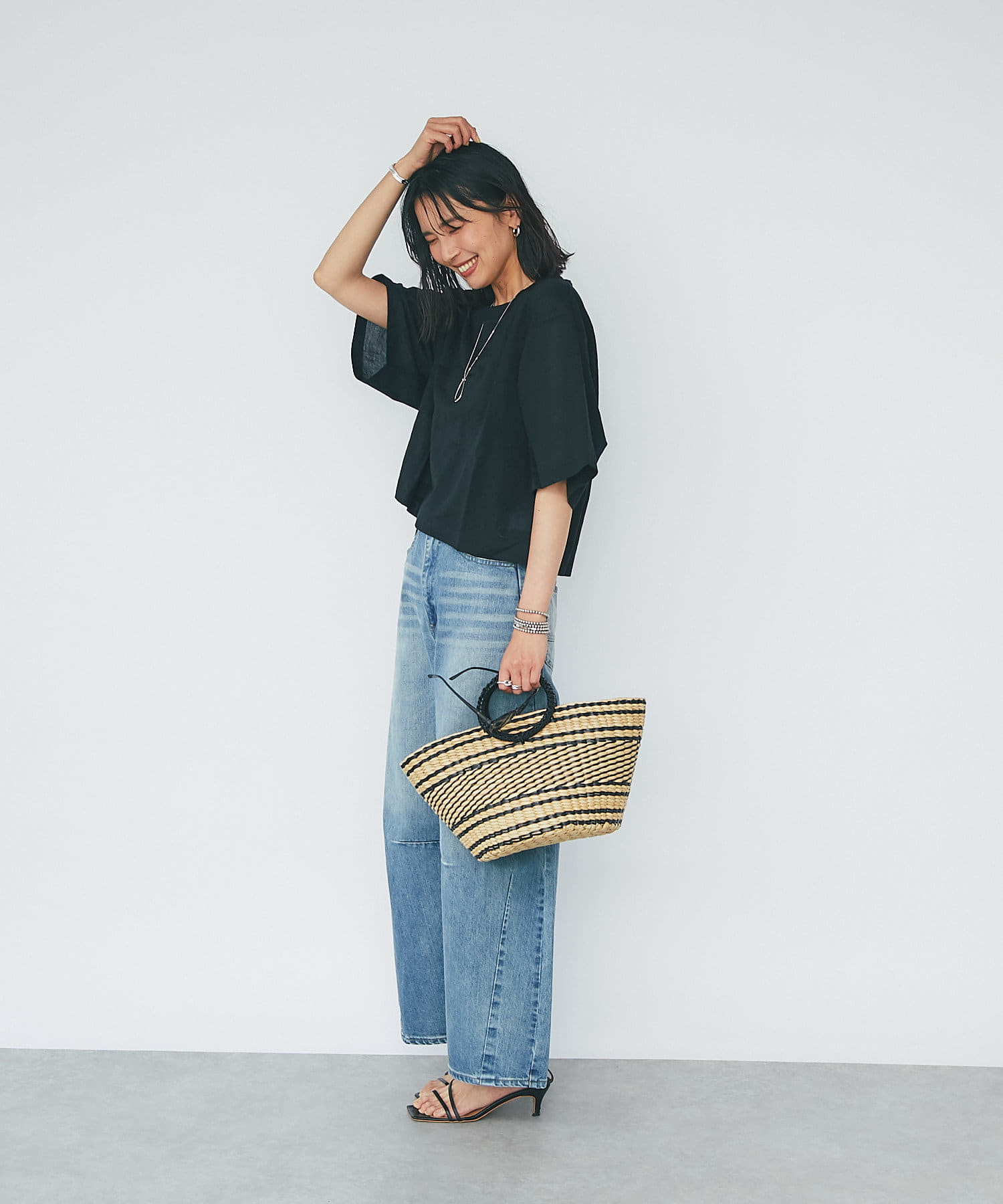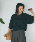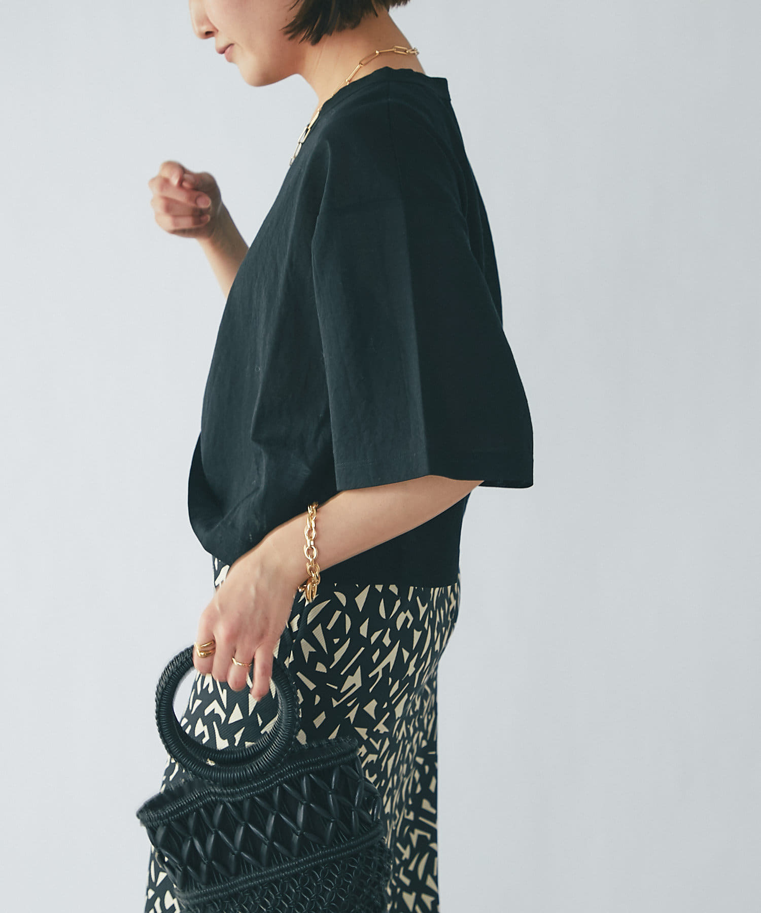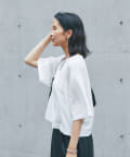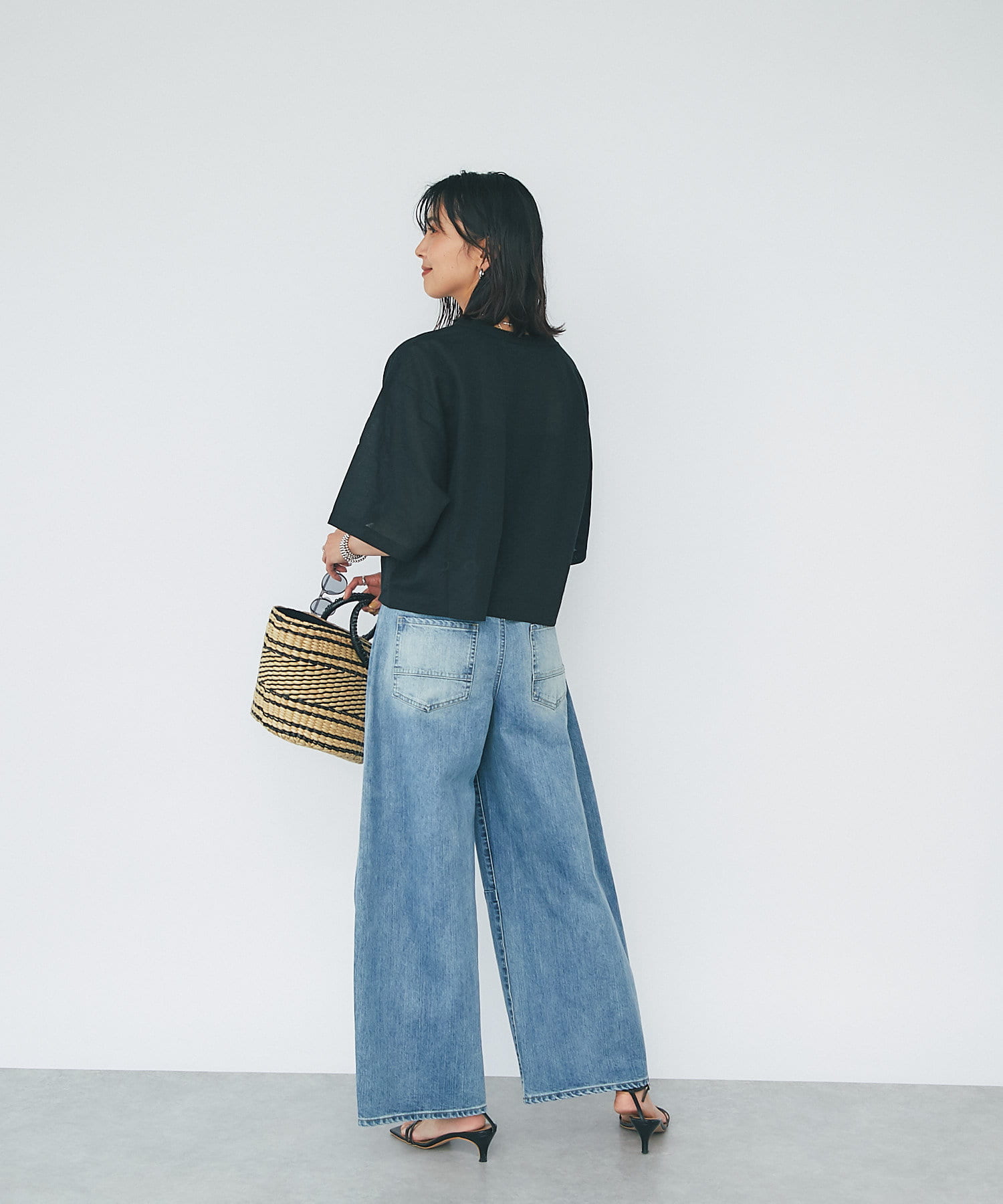 ショート丈なので、ワイドボトムやふわっと広がるスカートと合わせてもバランスよく着ていただけます。