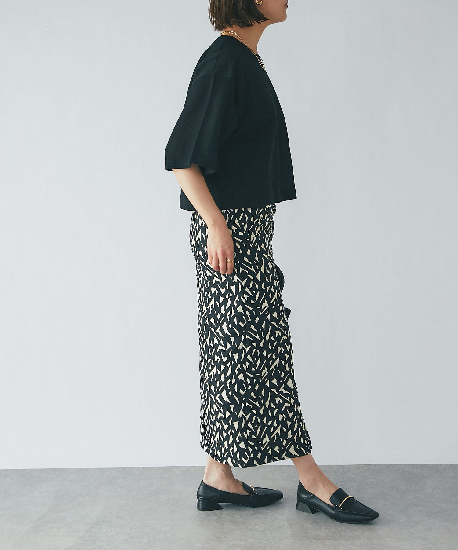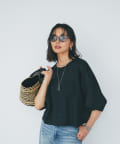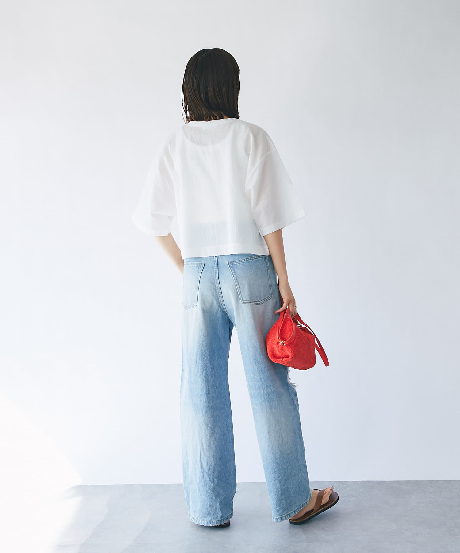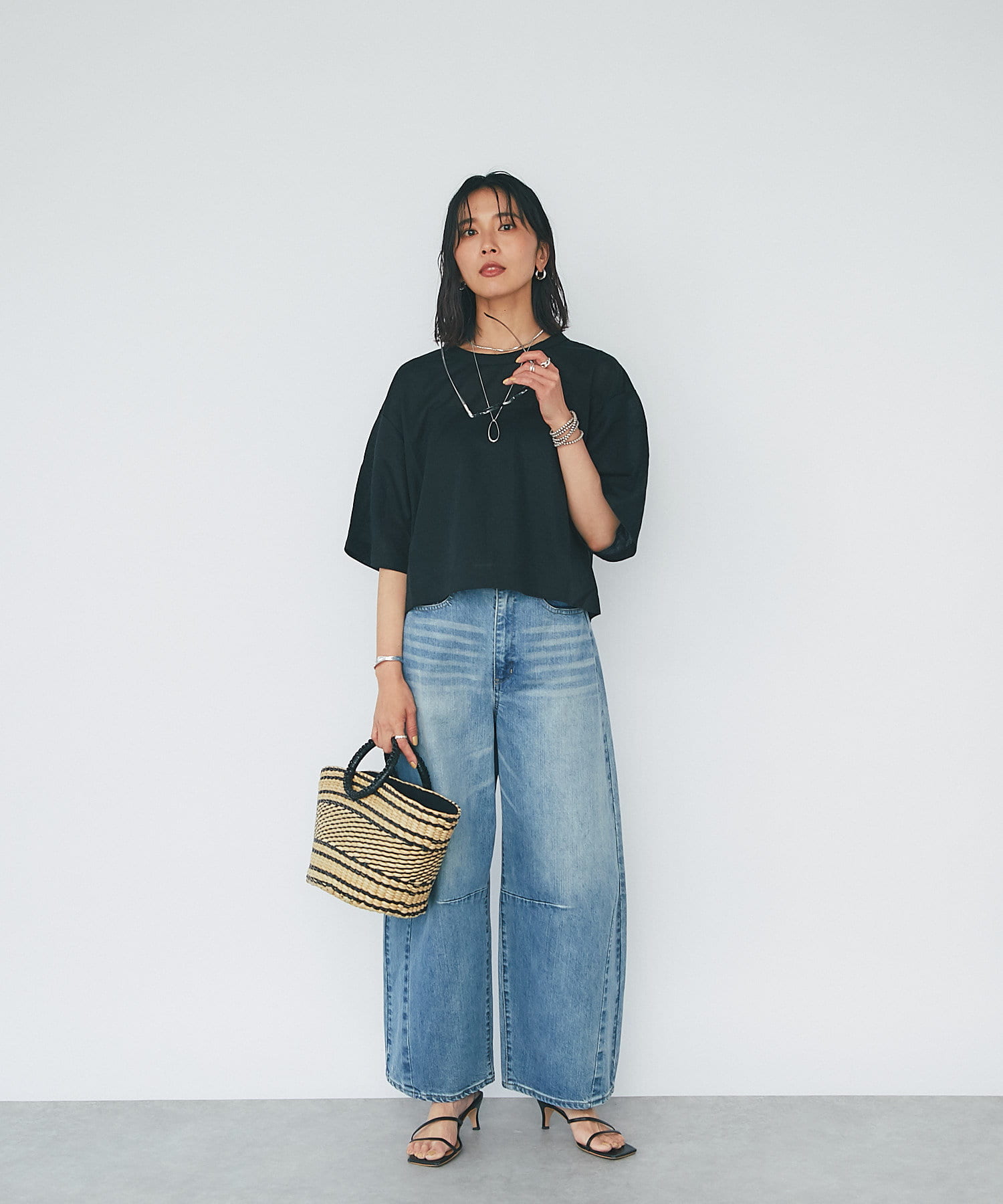 ショート丈なので、ワイドボトムやふわっと広がるスカートと合わせてもバランスよく着ていただけます。