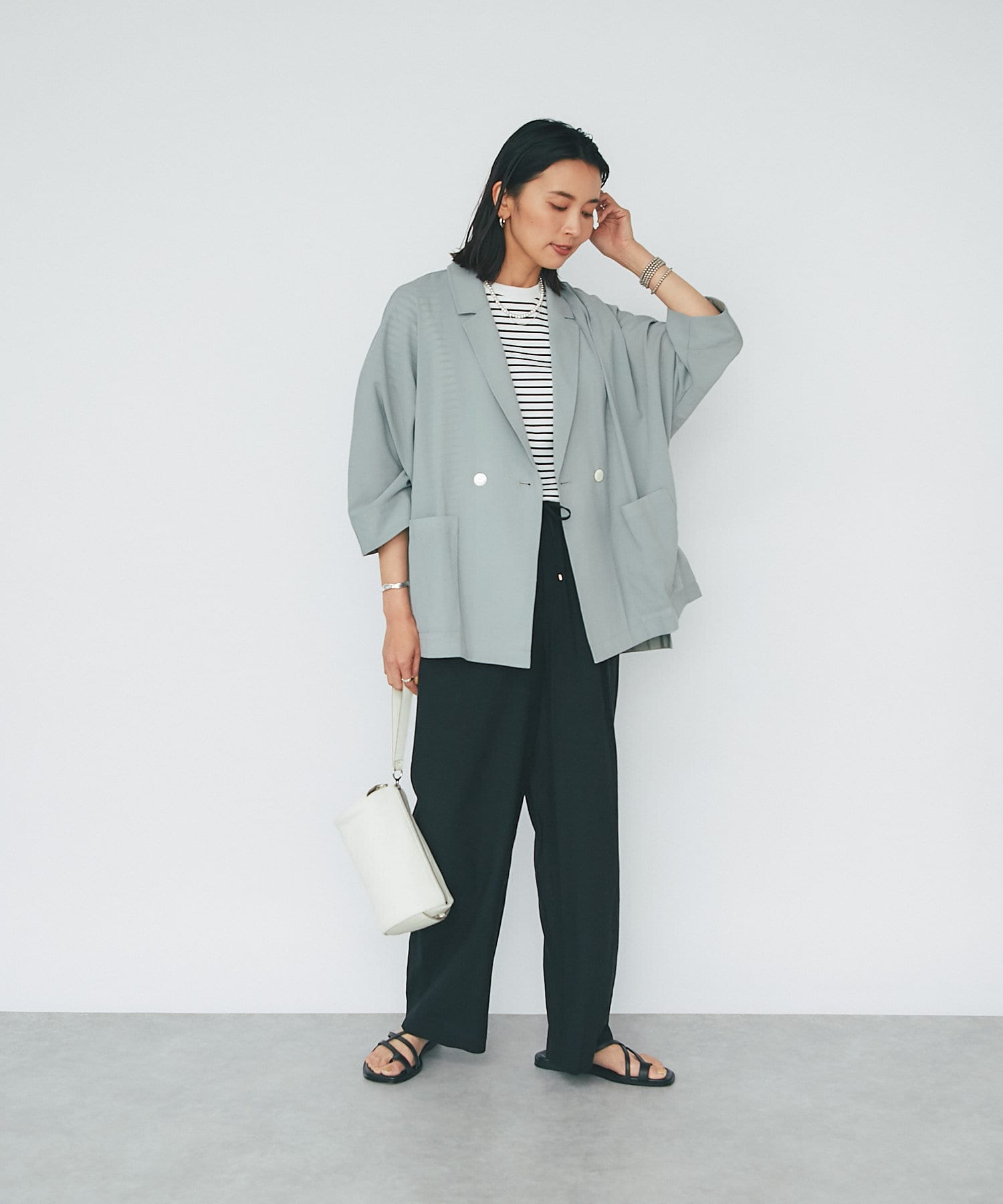パンツを合わせる際は、ワイドパンツにウエストインしてハンサムなコーディネートに仕上げていただくのもオススメです。