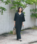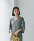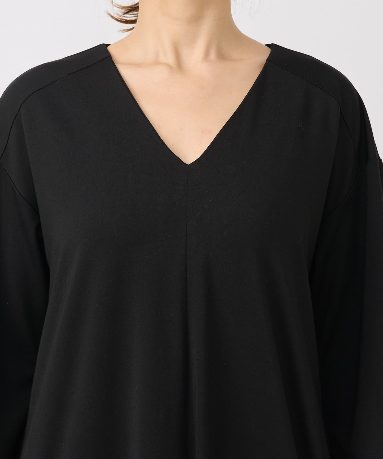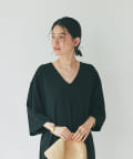Vネックで首回りはすっきりとしているので重たい雰囲気にならずにきれいに着ていただけます。