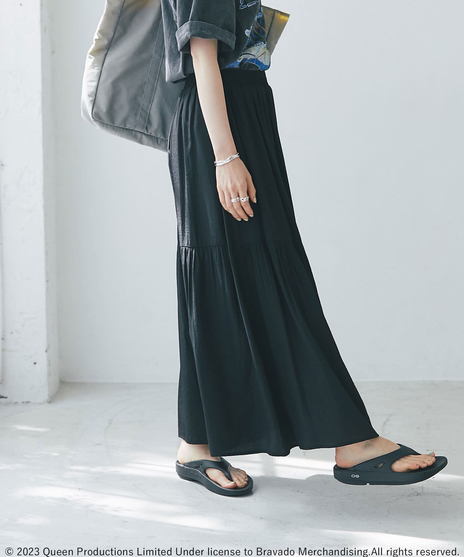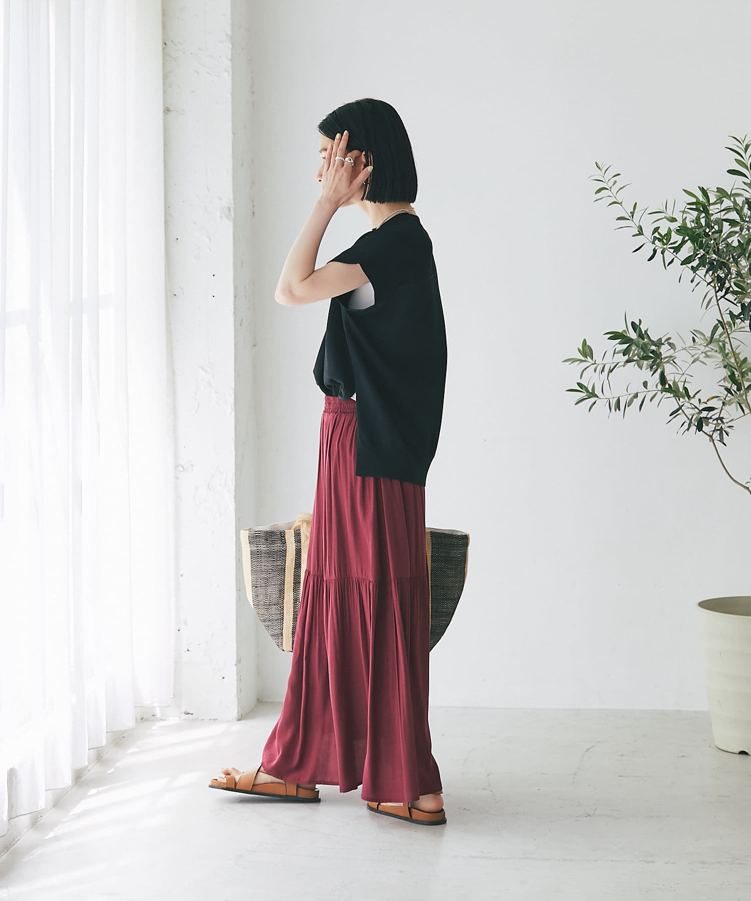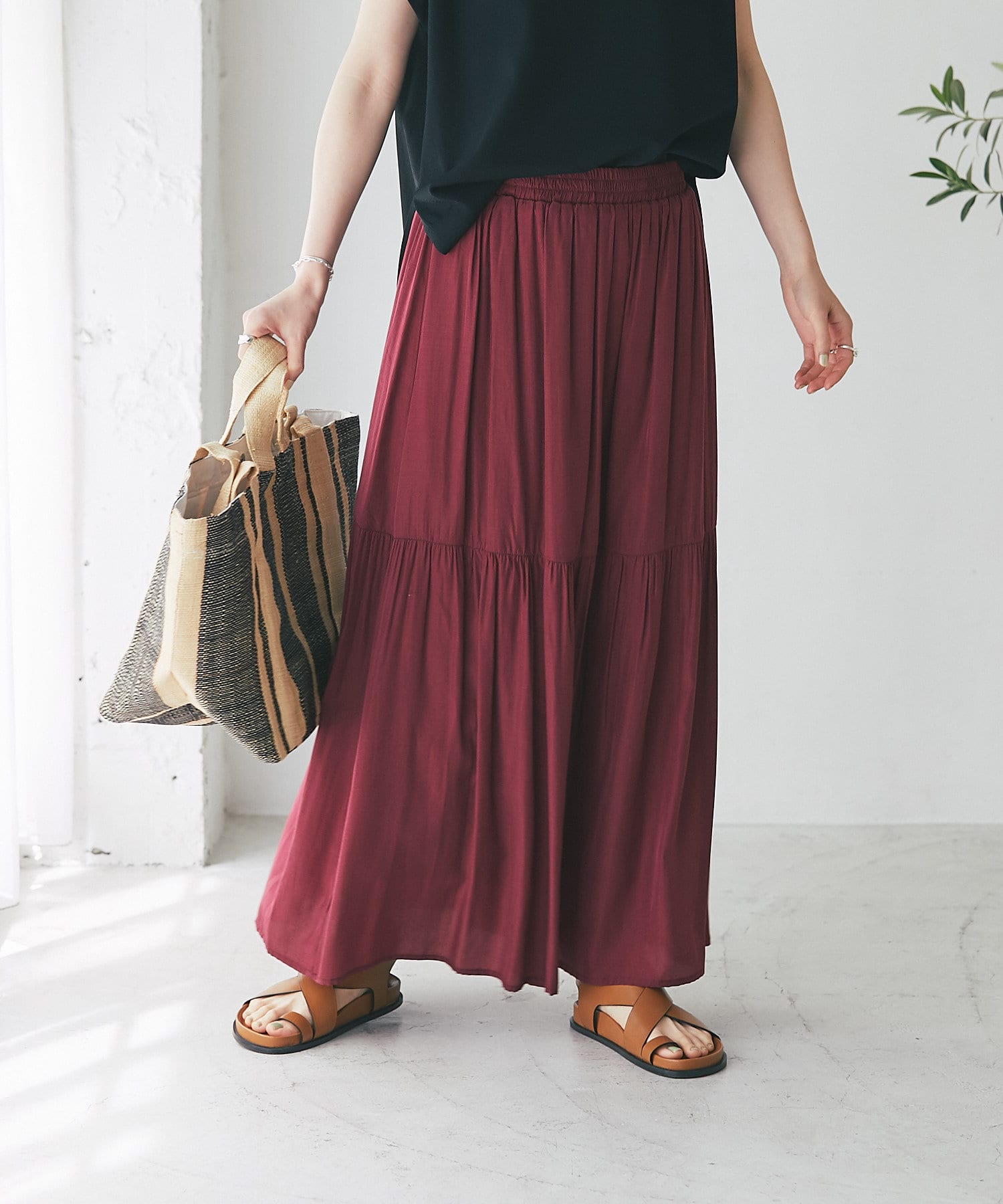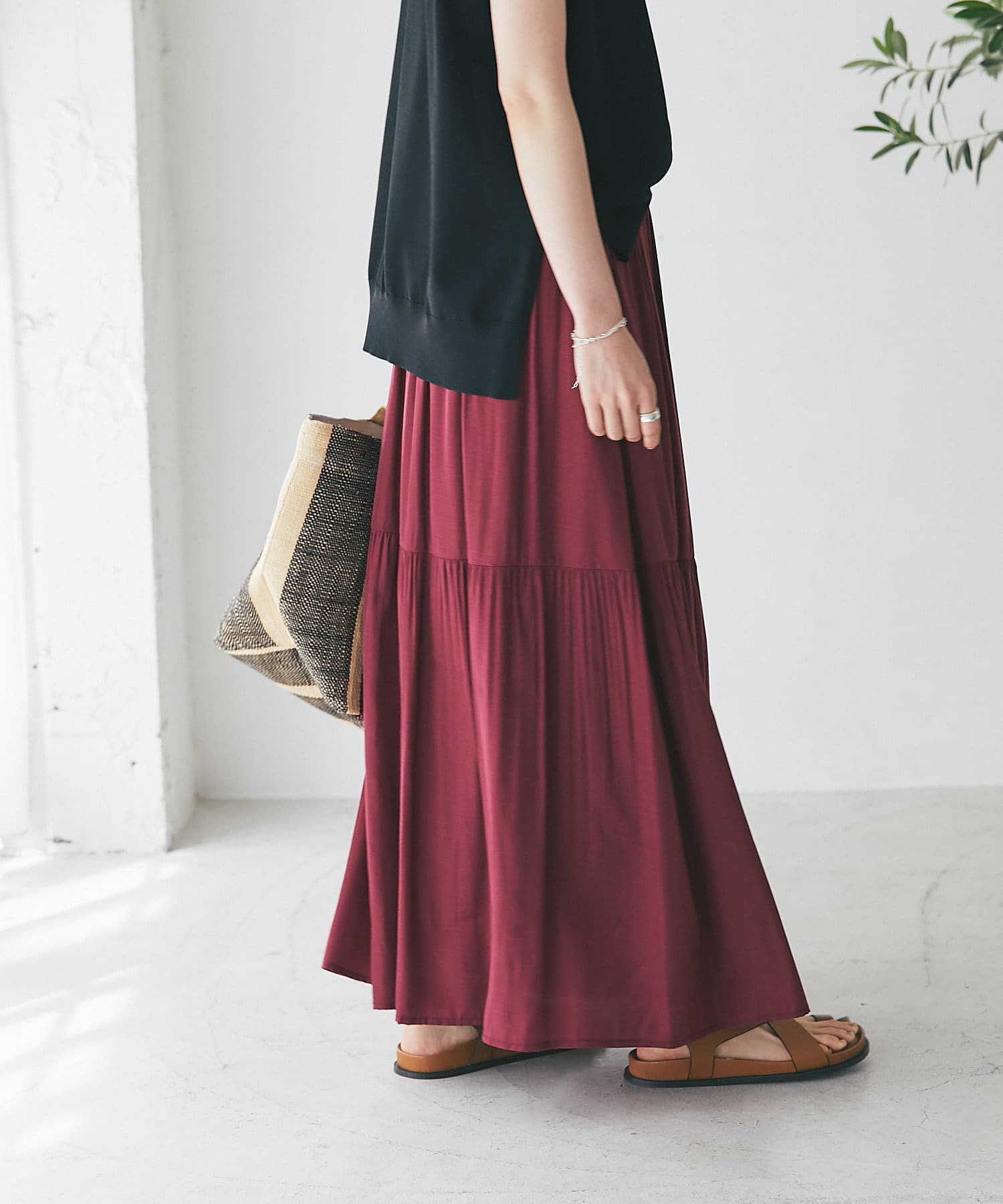 柔らかい肌当たりの素材感、ウエストゴム、身体のラインを拾いづらいシルエットと、嬉しいポイント満載のロングスカートが登場。