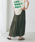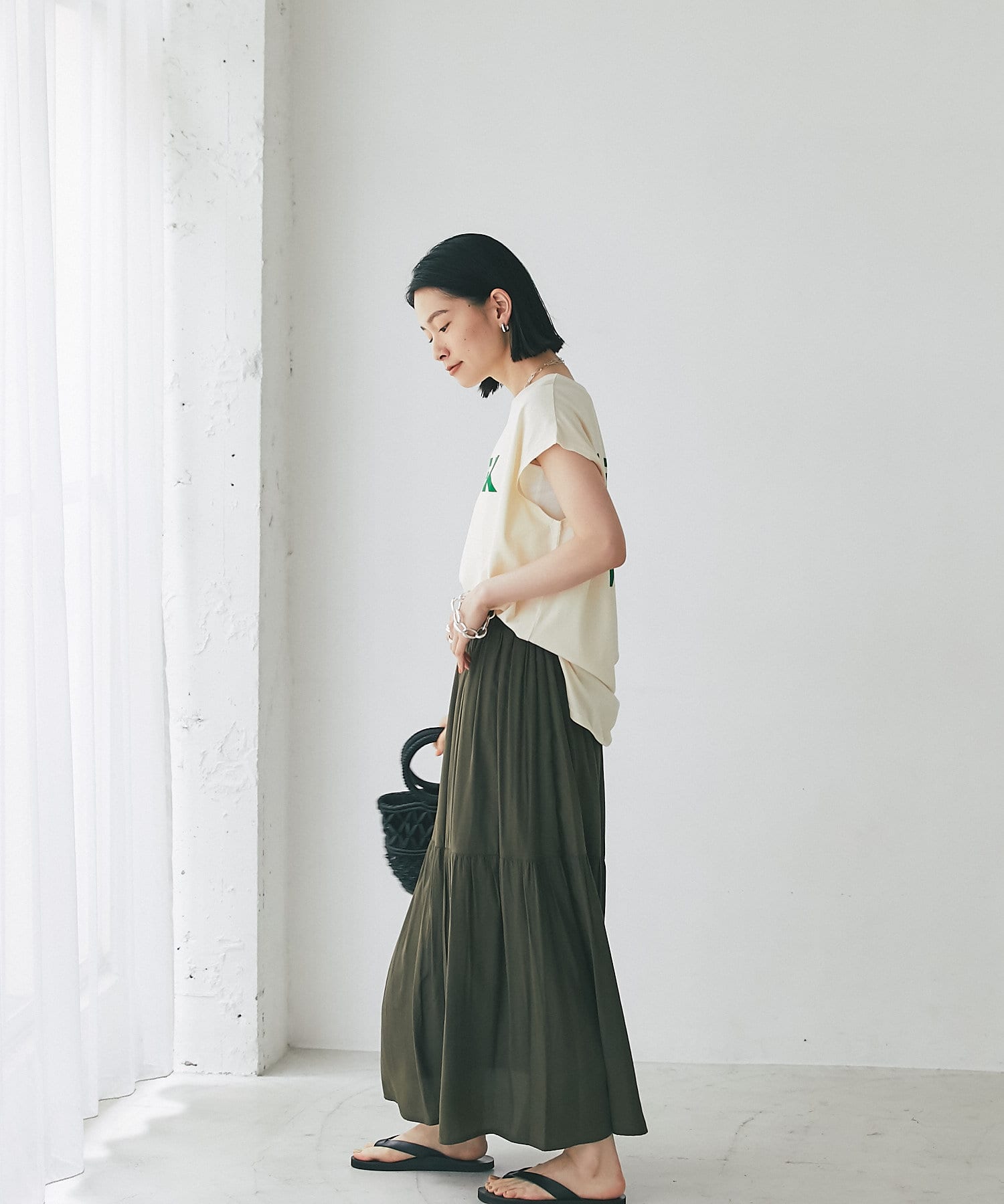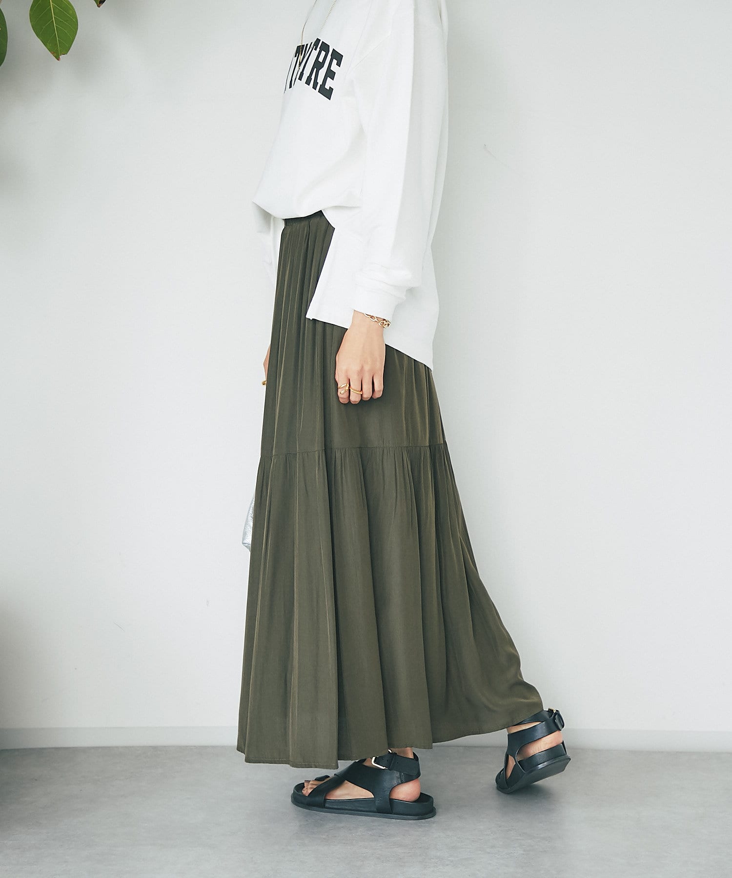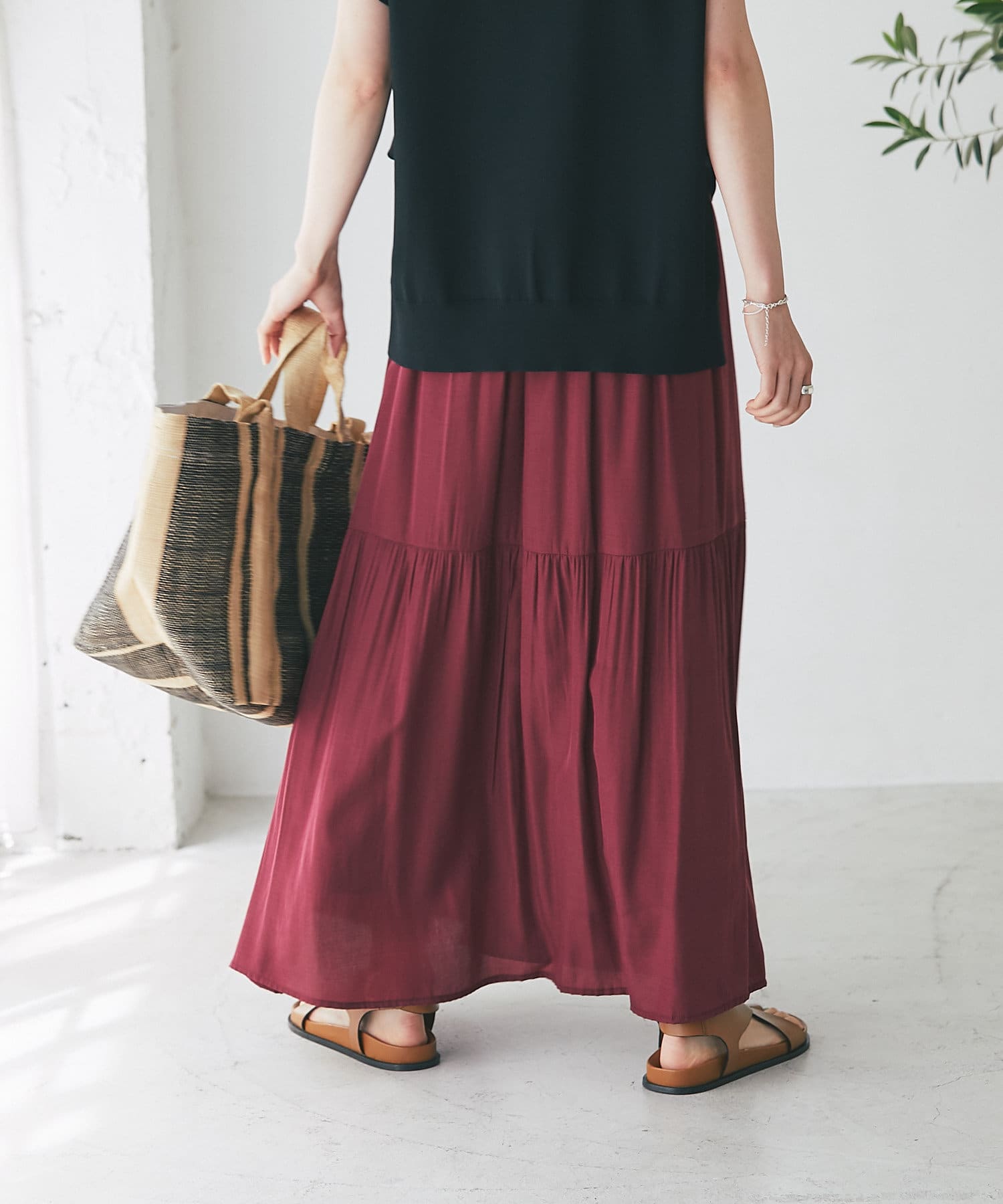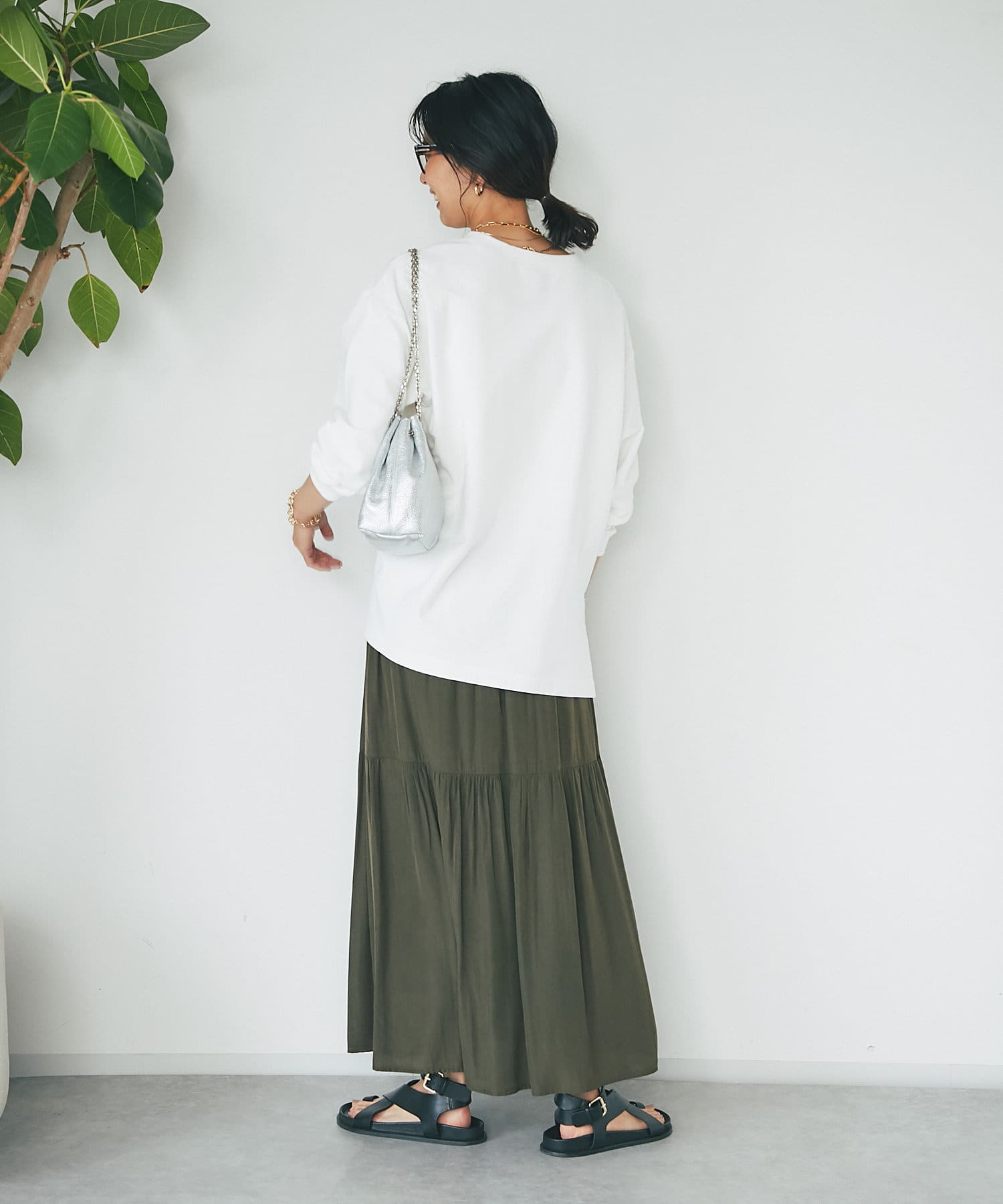 柔らかい肌当たりの素材感、ウエストゴム、身体のラインを拾いづらいシルエットと、嬉しいポイント満載のロングスカートが登場。