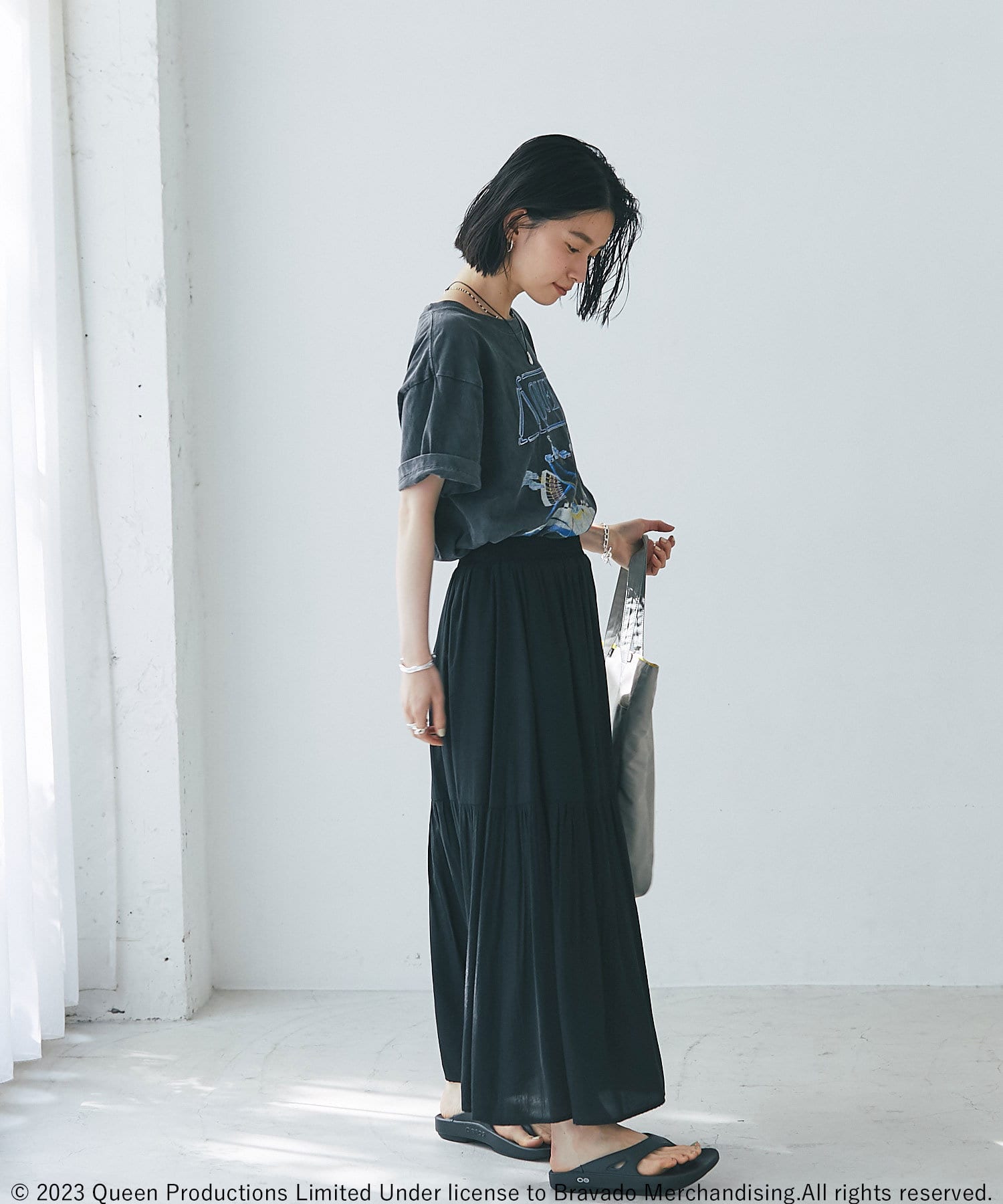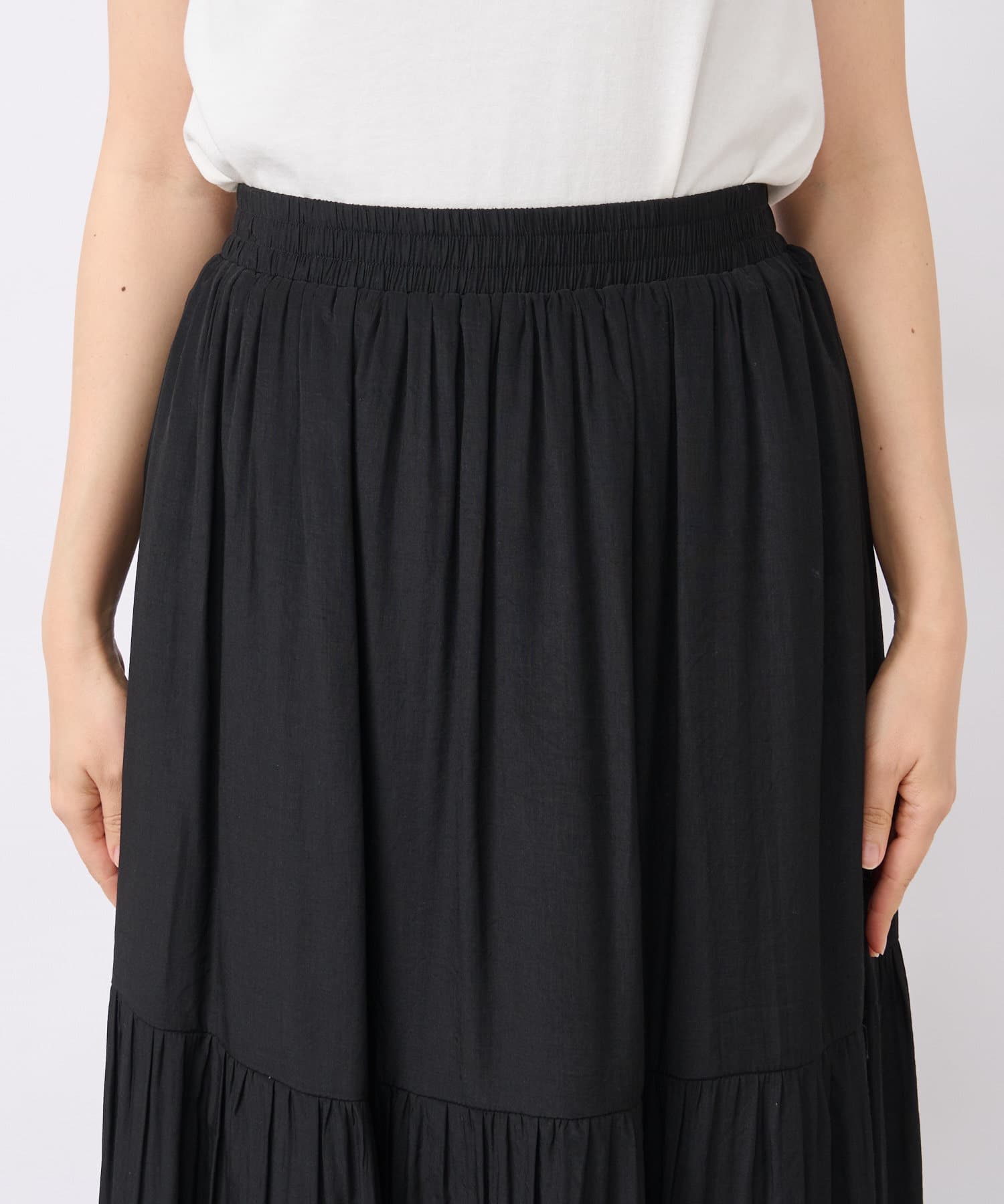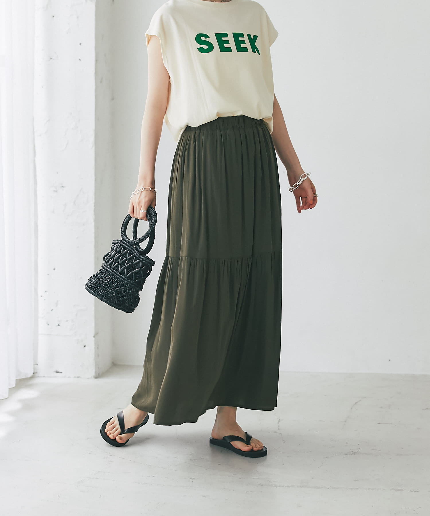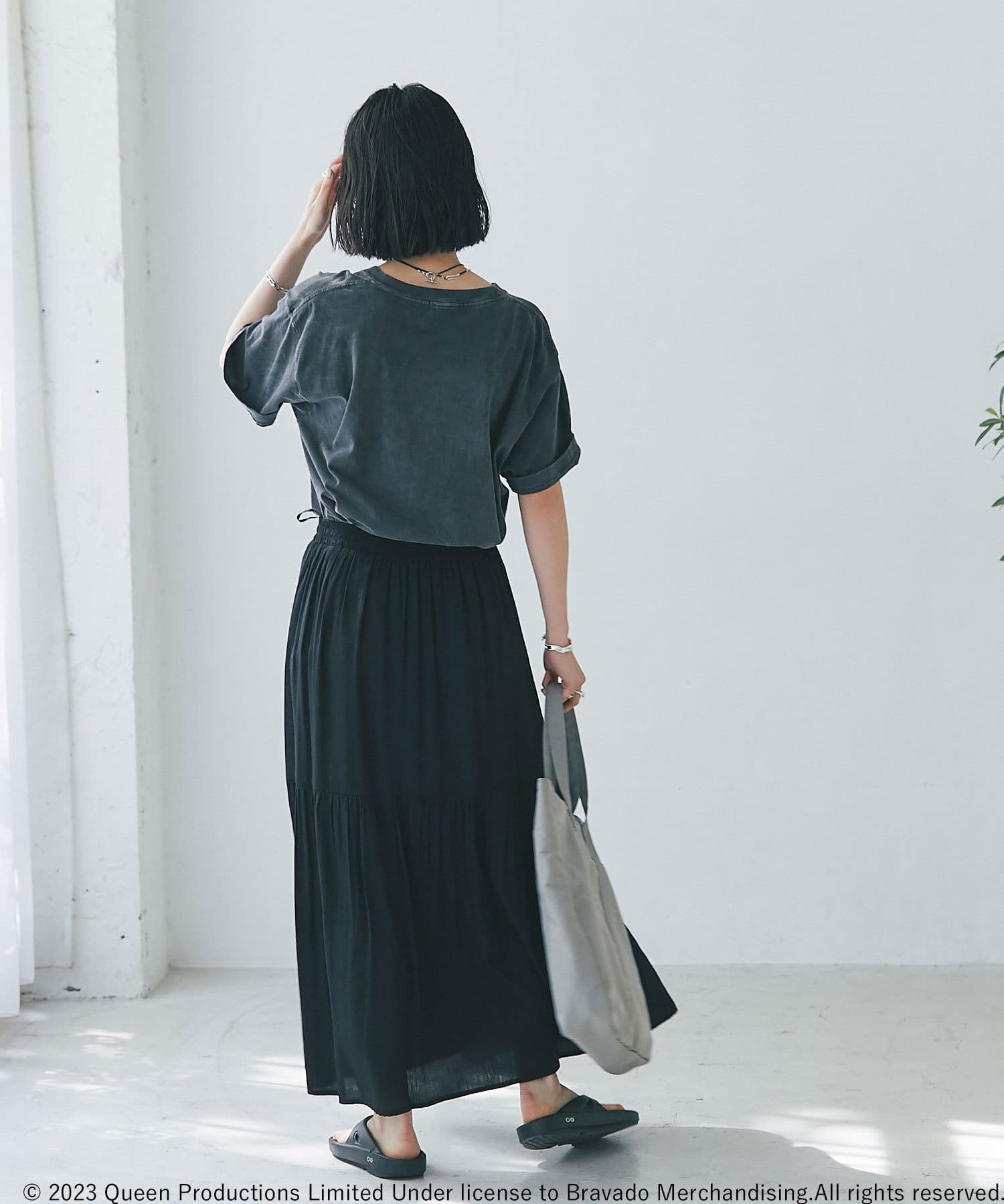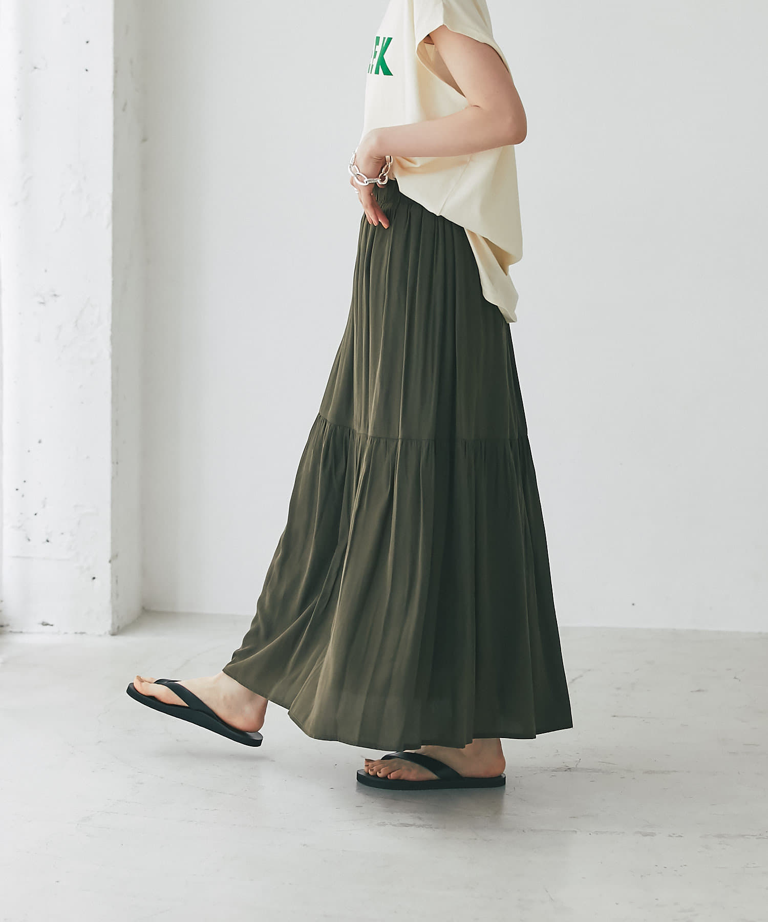 柔らかい肌当たりの素材感、ウエストゴム、身体のラインを拾いづらいシルエットと、嬉しいポイント満載のロングスカートが登場。