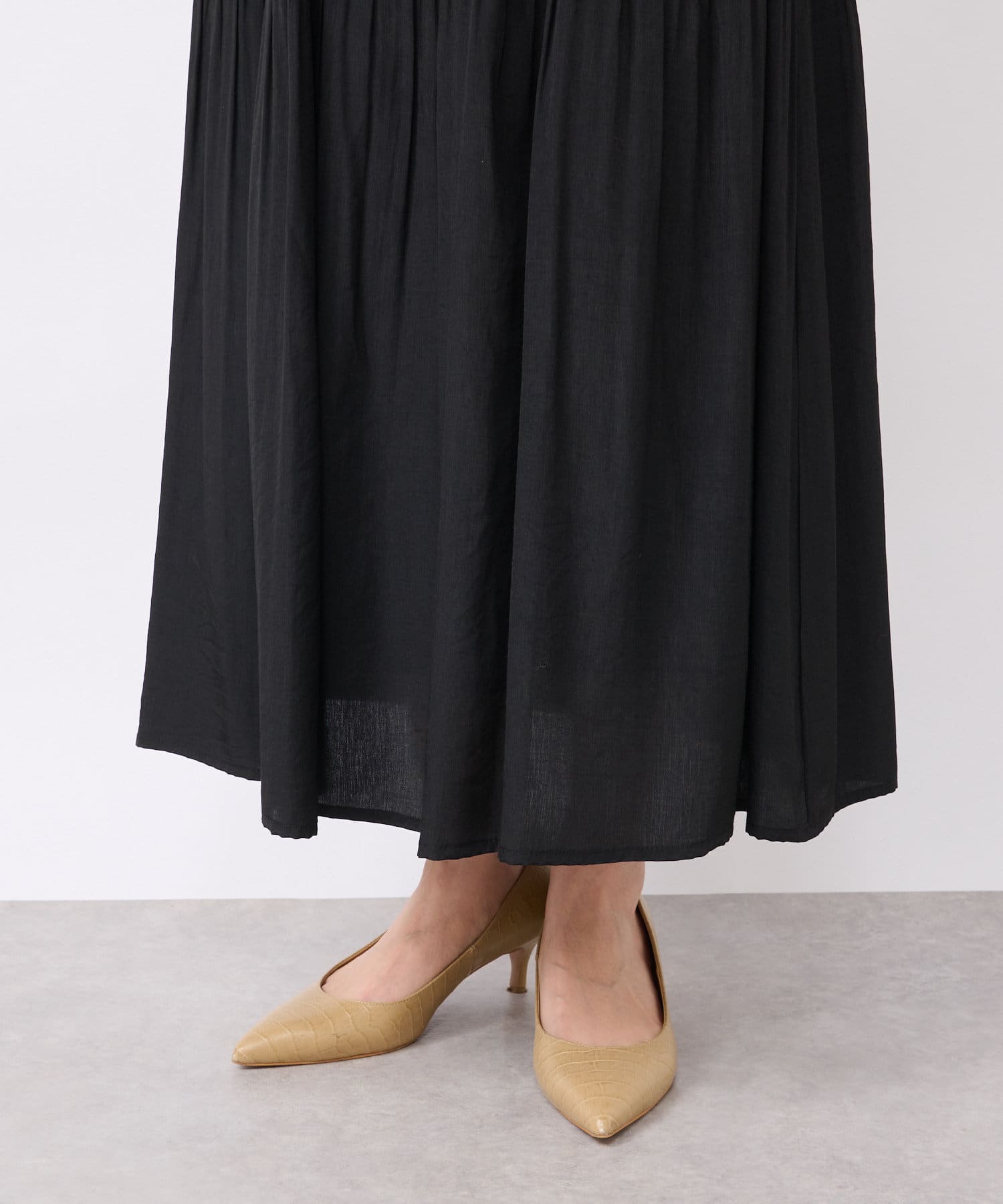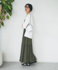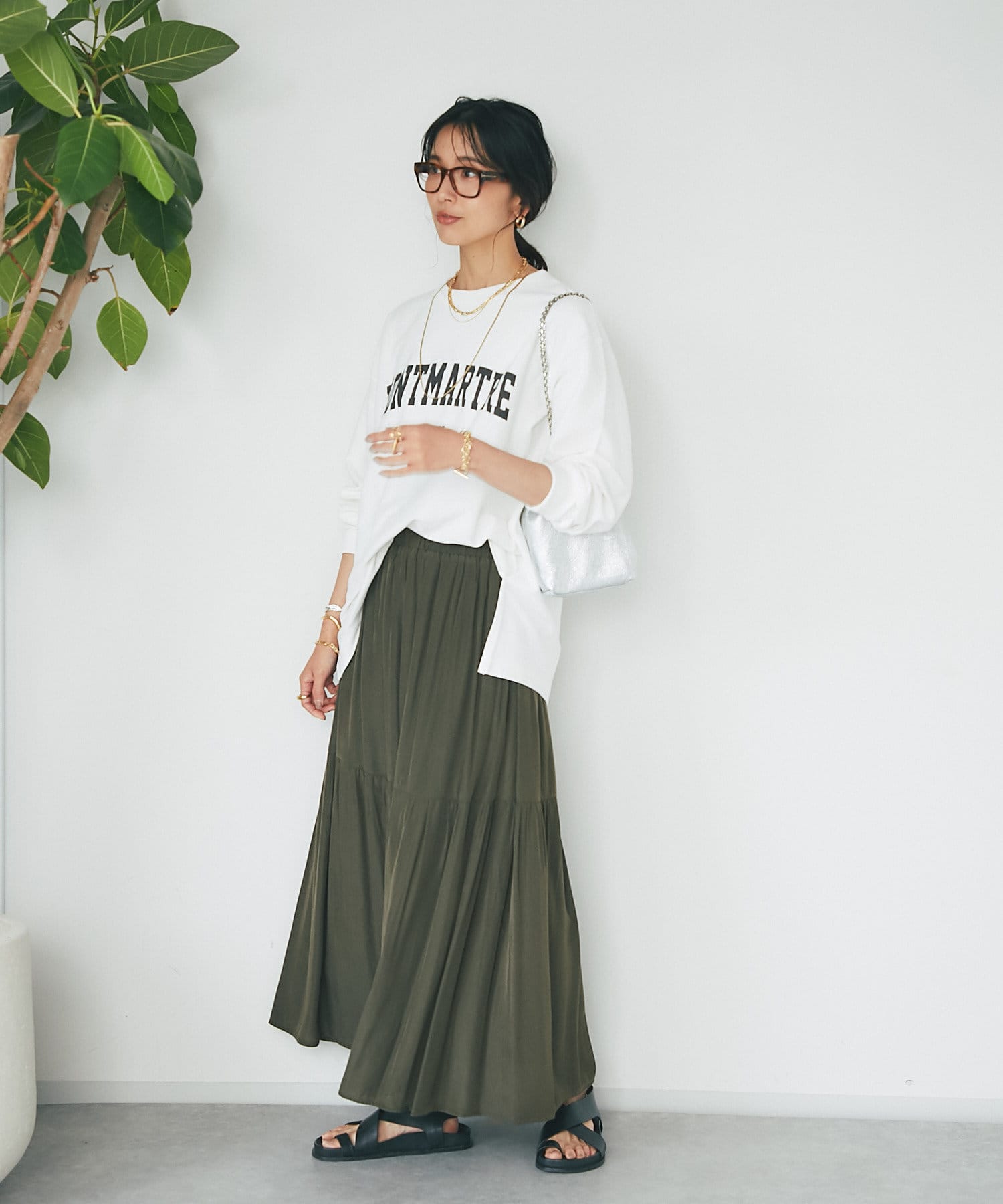 ギャザースカートですが、ボリュームの出すぎないシルエットのため、トレンドアイテムと組み合わせても落ち着いた雰囲気に持っていけるアイテムです。