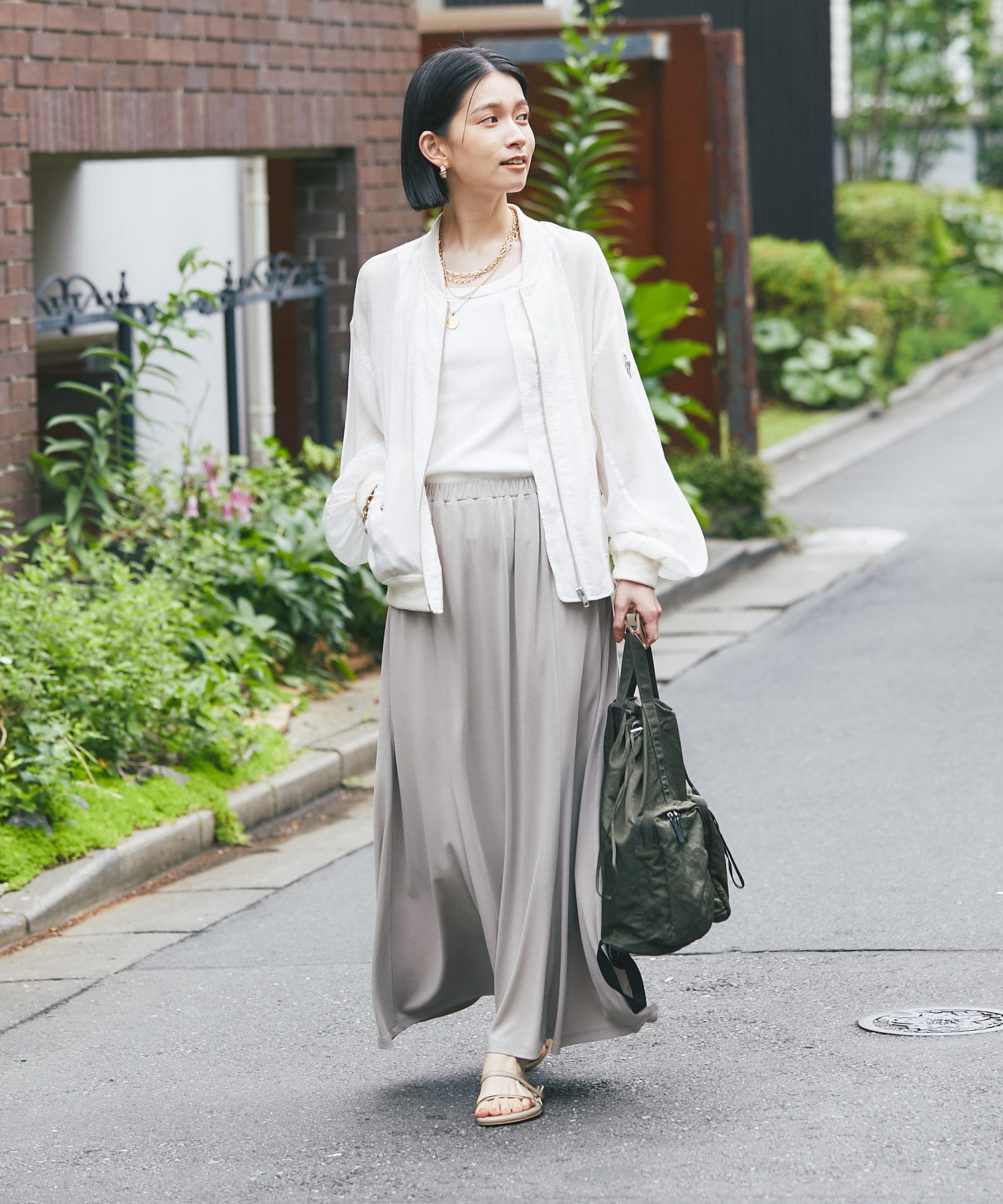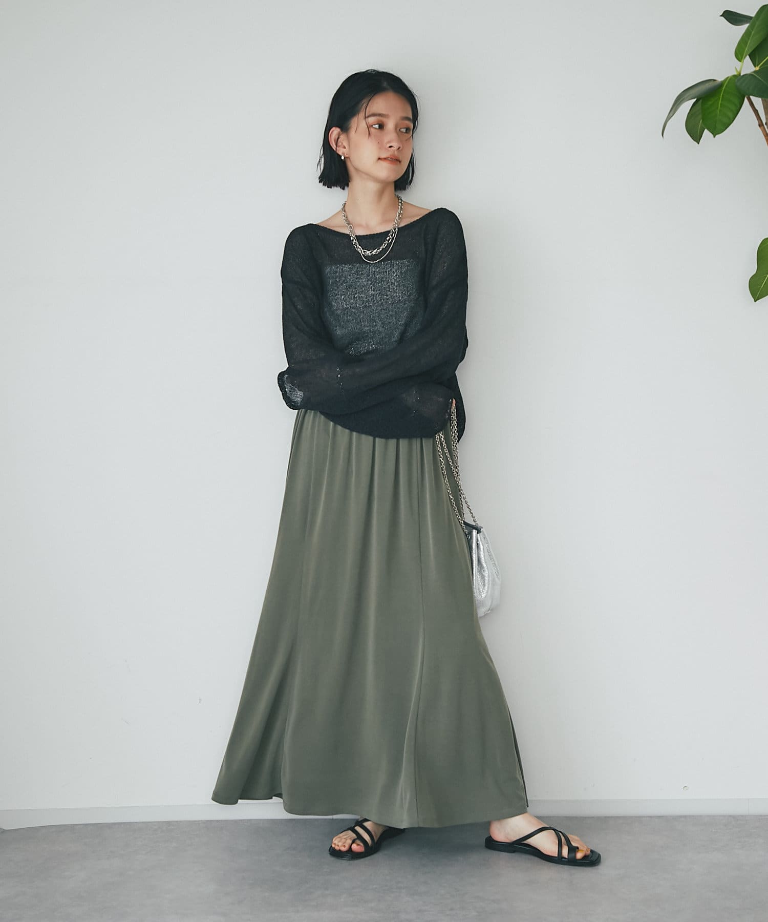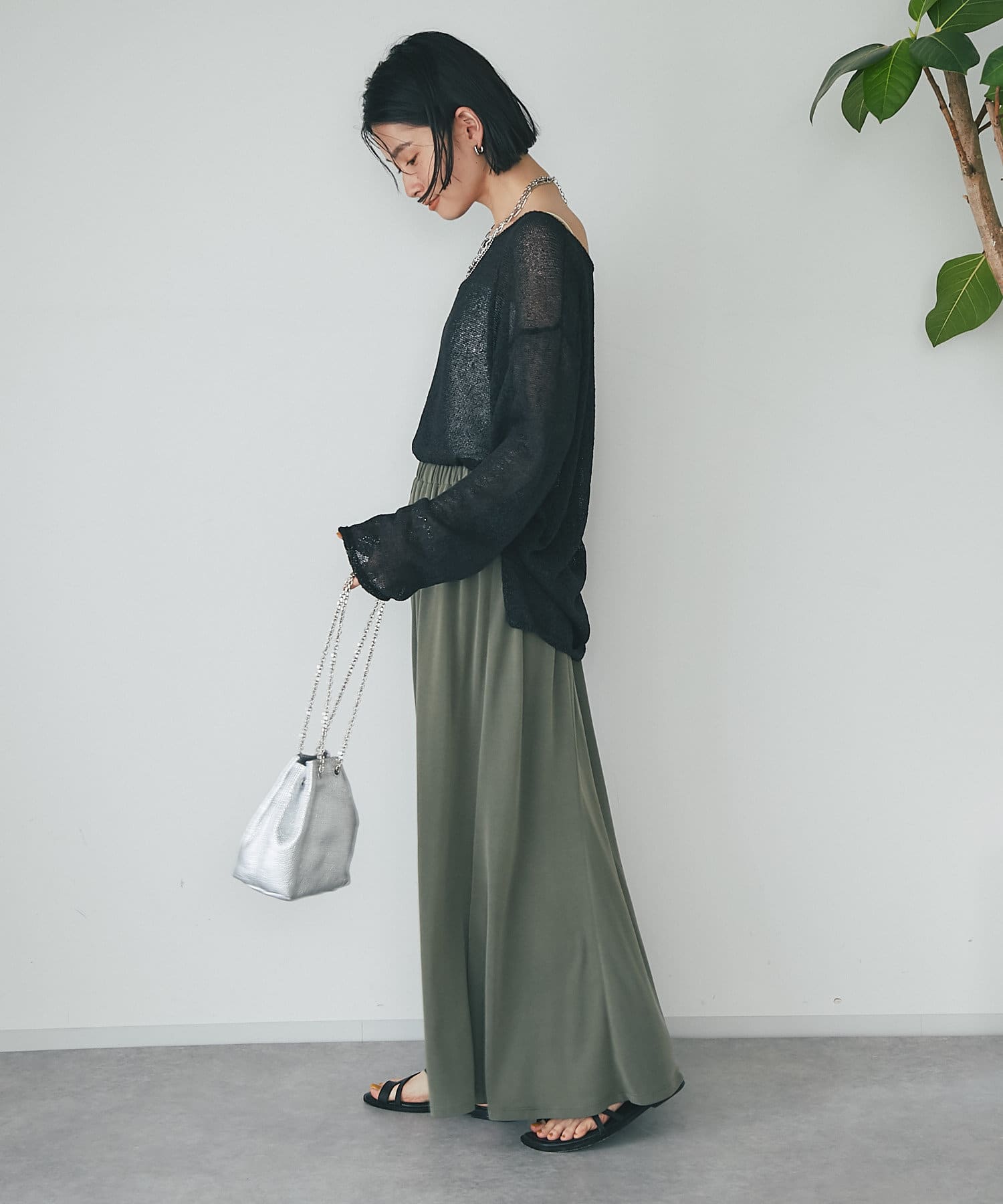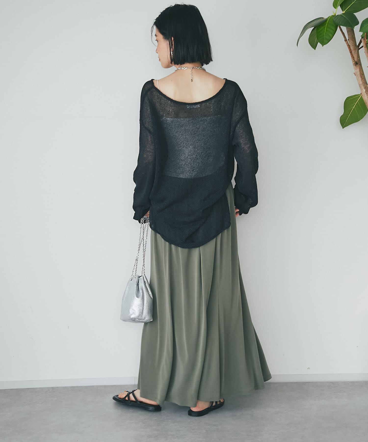 Tシャツを合わせたカジュアルなコーディネートはもちろん、今季トレンドのシアーニットを合わせたコーディネートもオススメです。