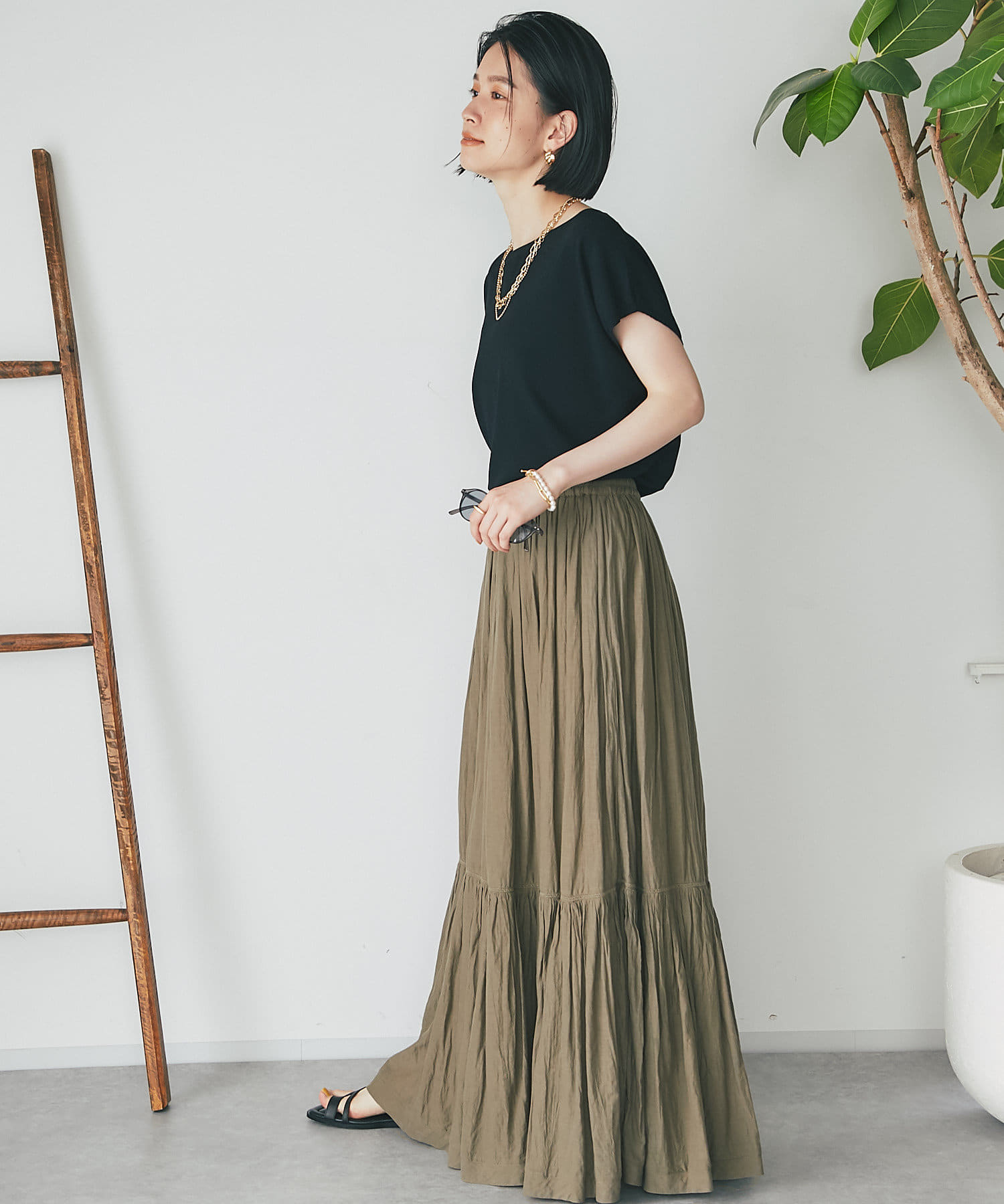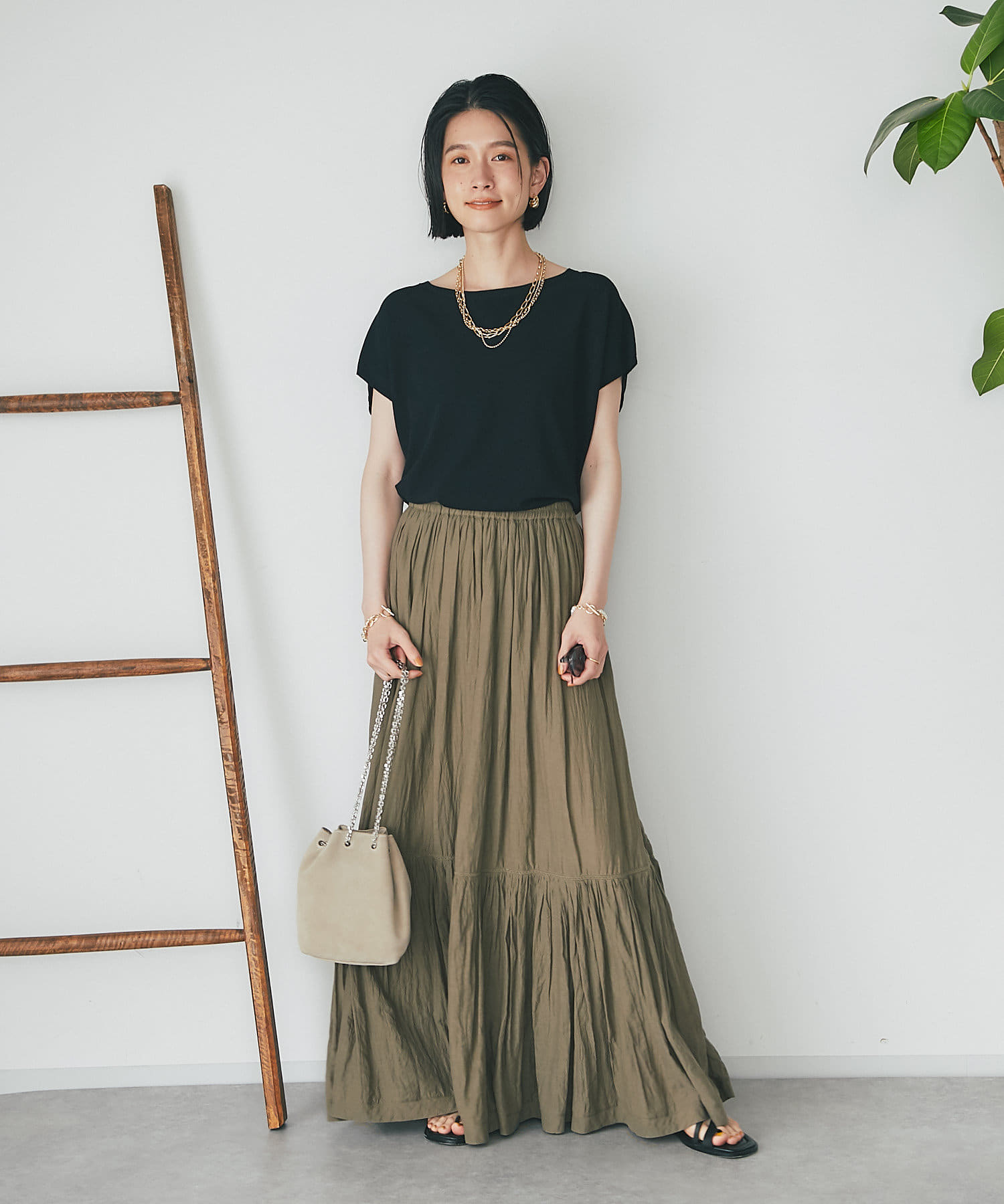 トレンドライクに仕上げるなら、素材感の異なる軽やかなコットンのスカートやデニム合わせもオススメ。