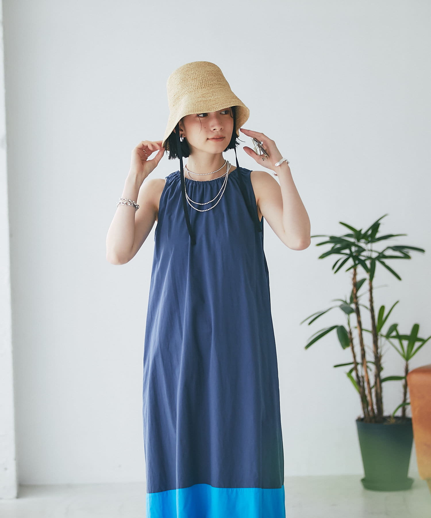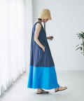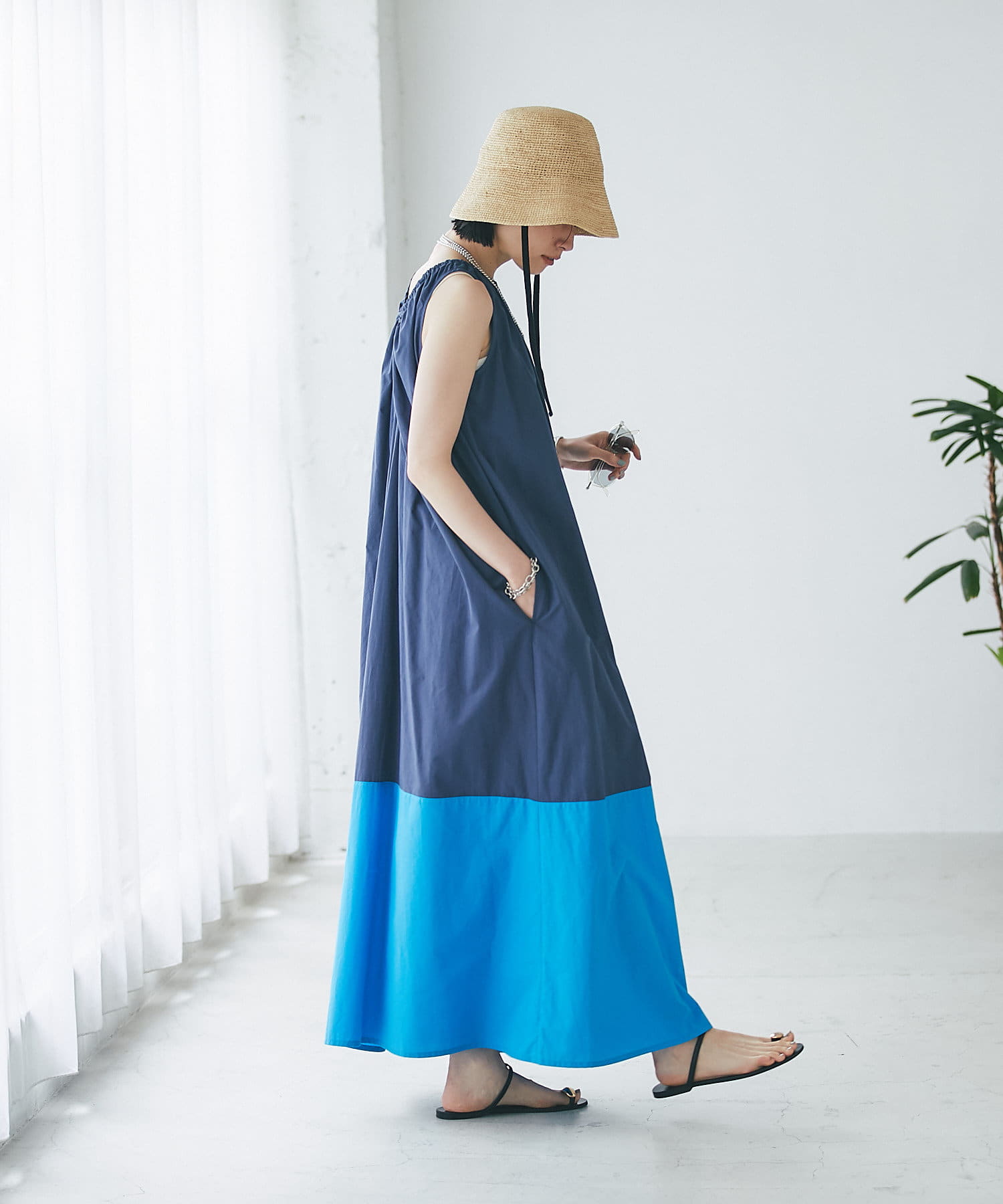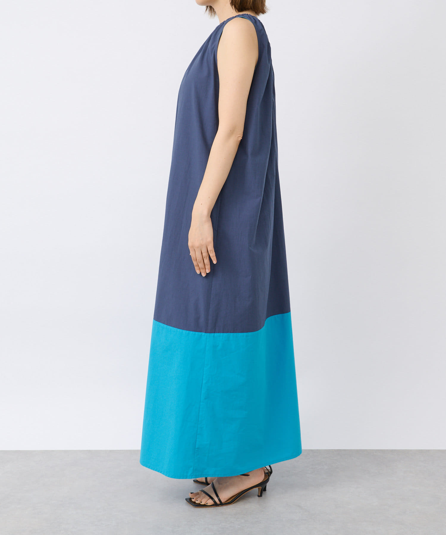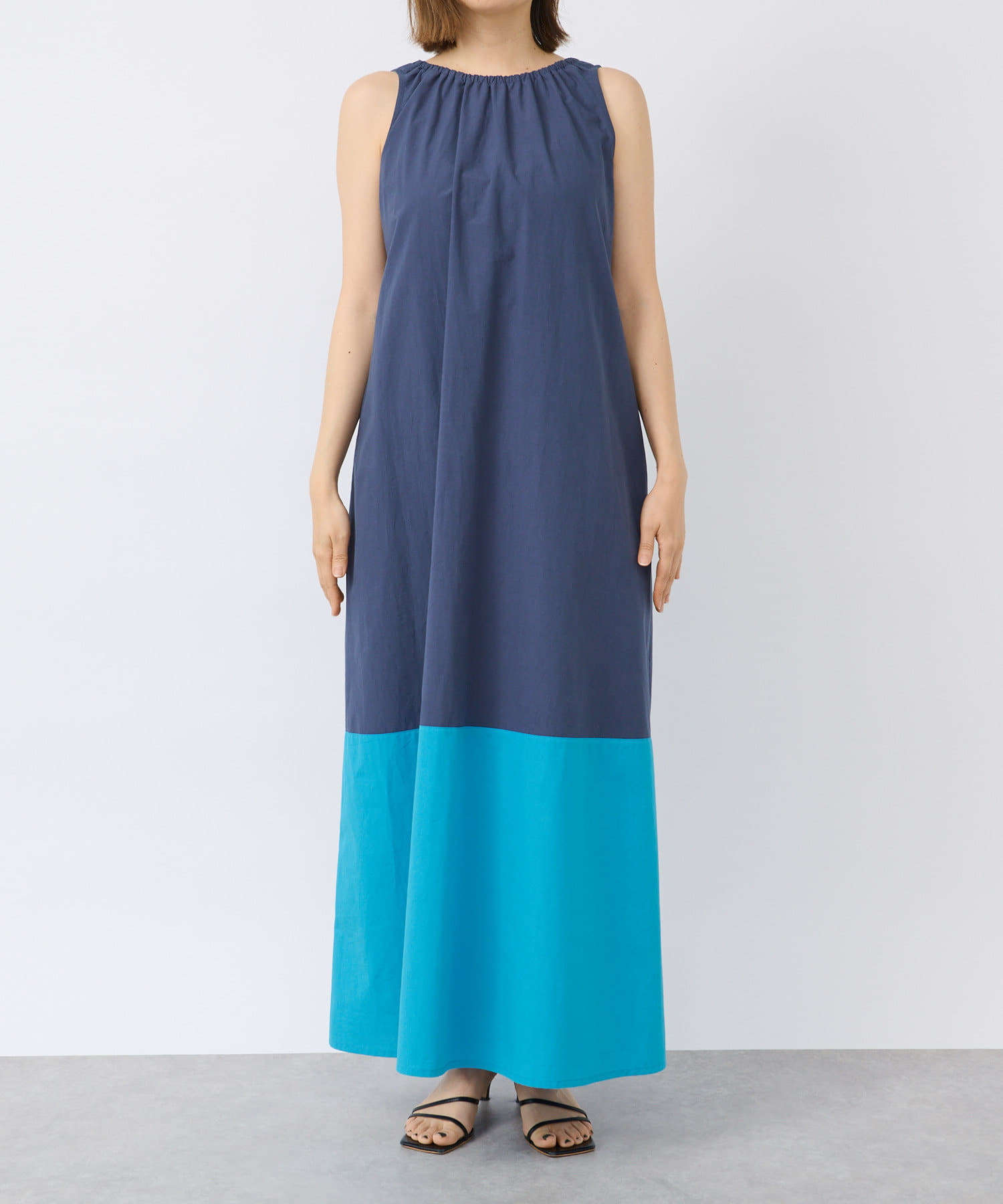 シンプルなシルエットに鮮やかなバイカラーが目を惹くワンピース。