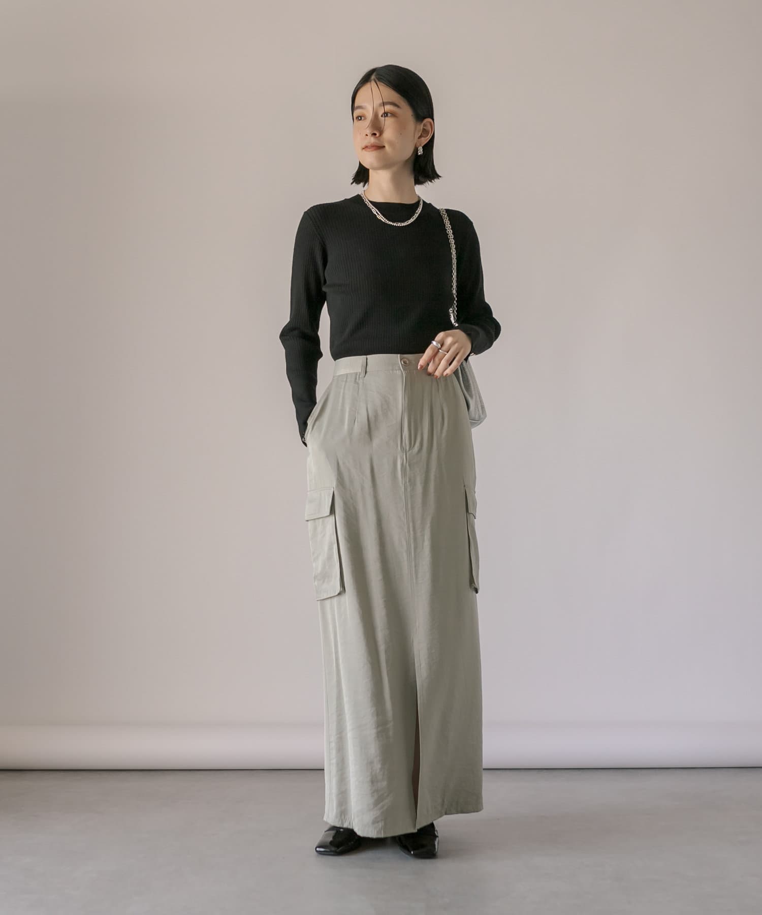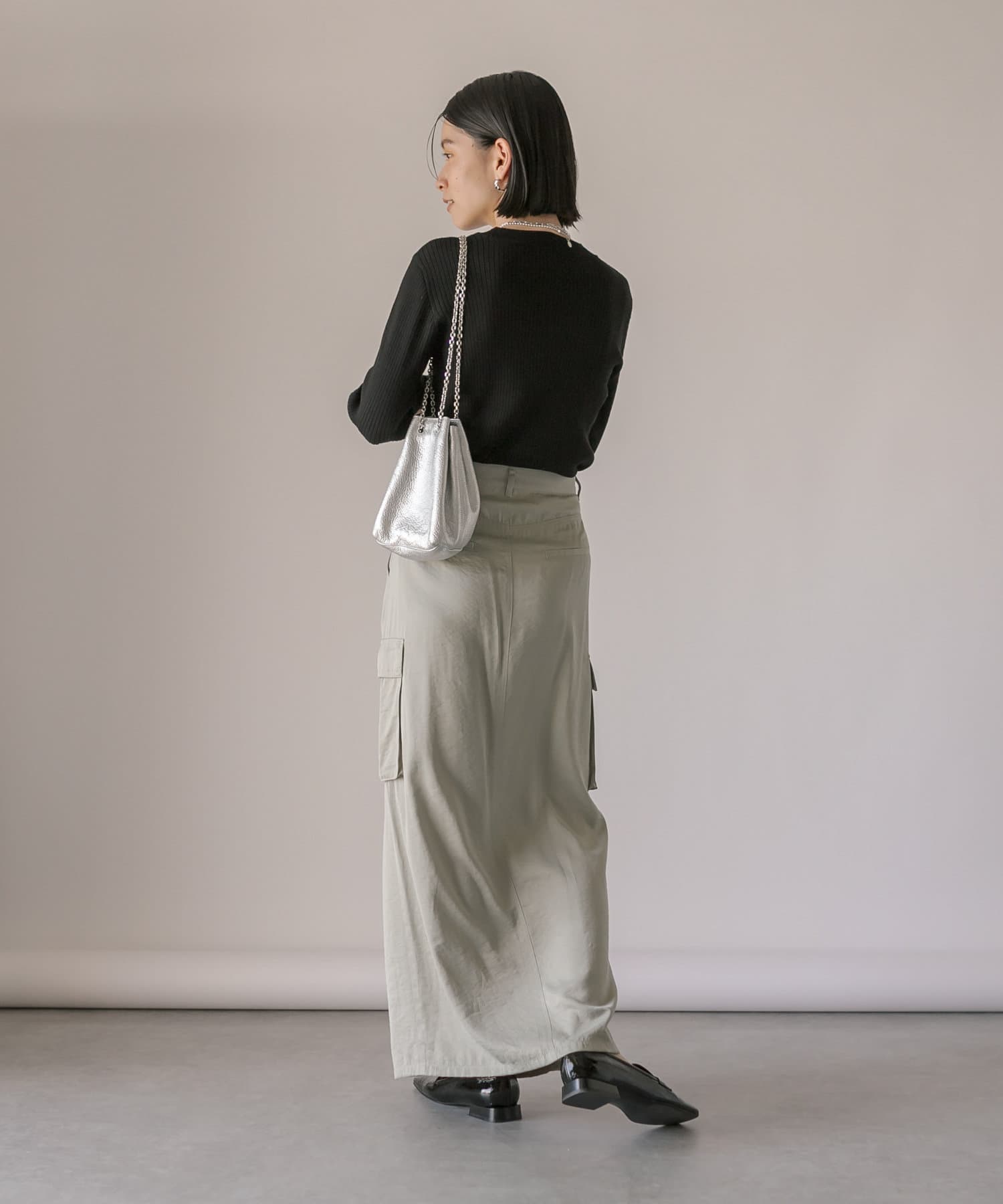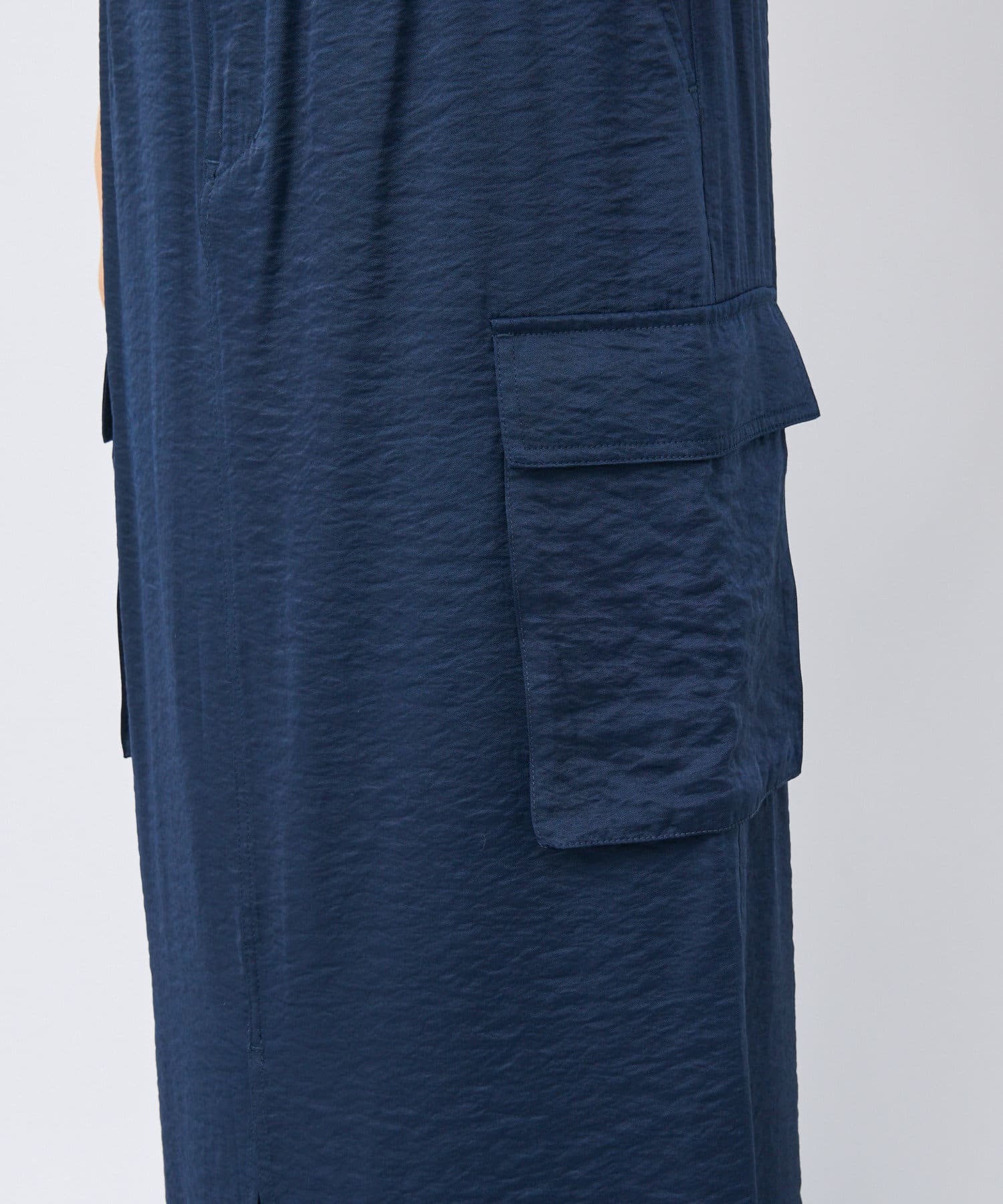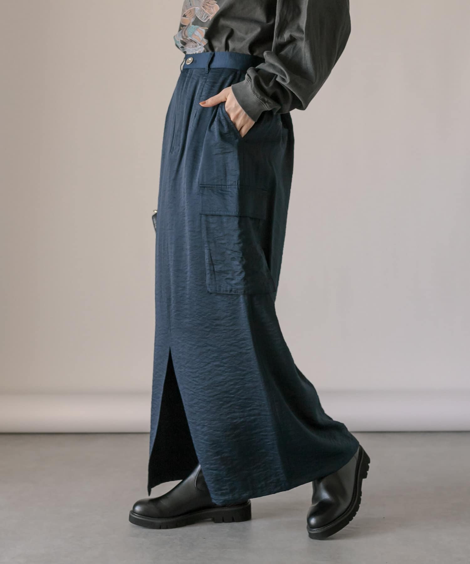 レディースらしい光沢感があり落ち感のある素材に落とし込み、カジュアルになりがちなカーゴスカートを女性らしく仕上げました。