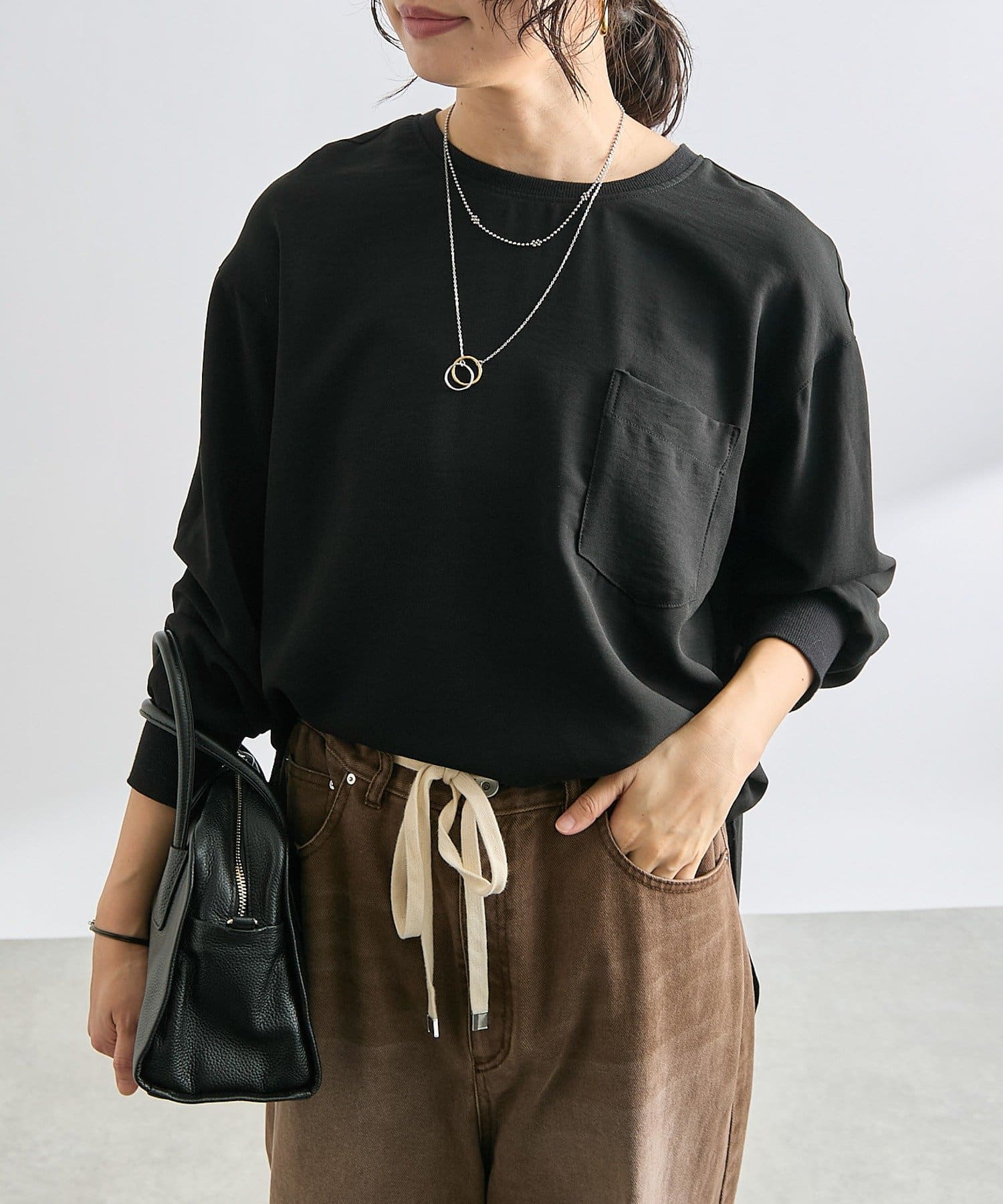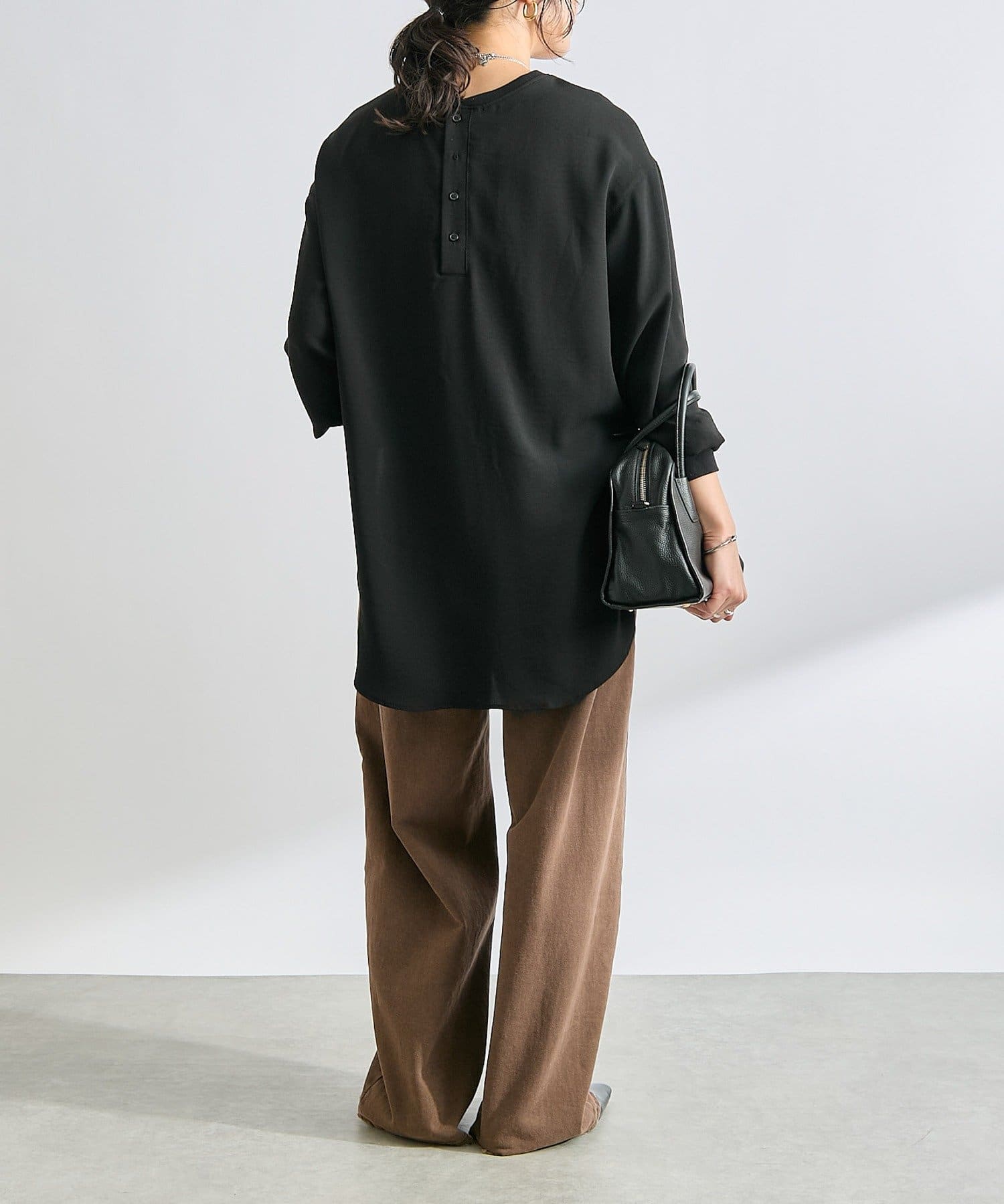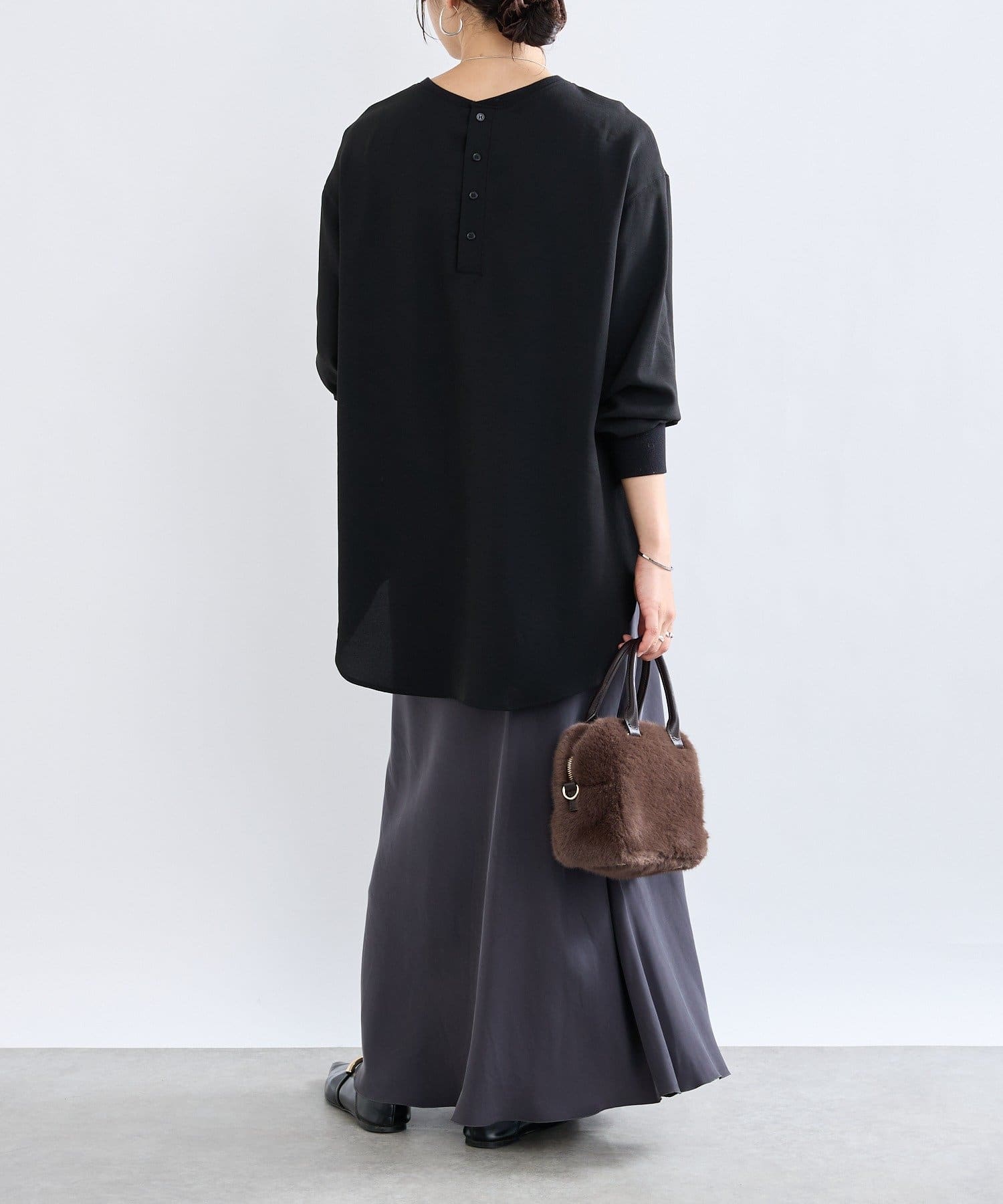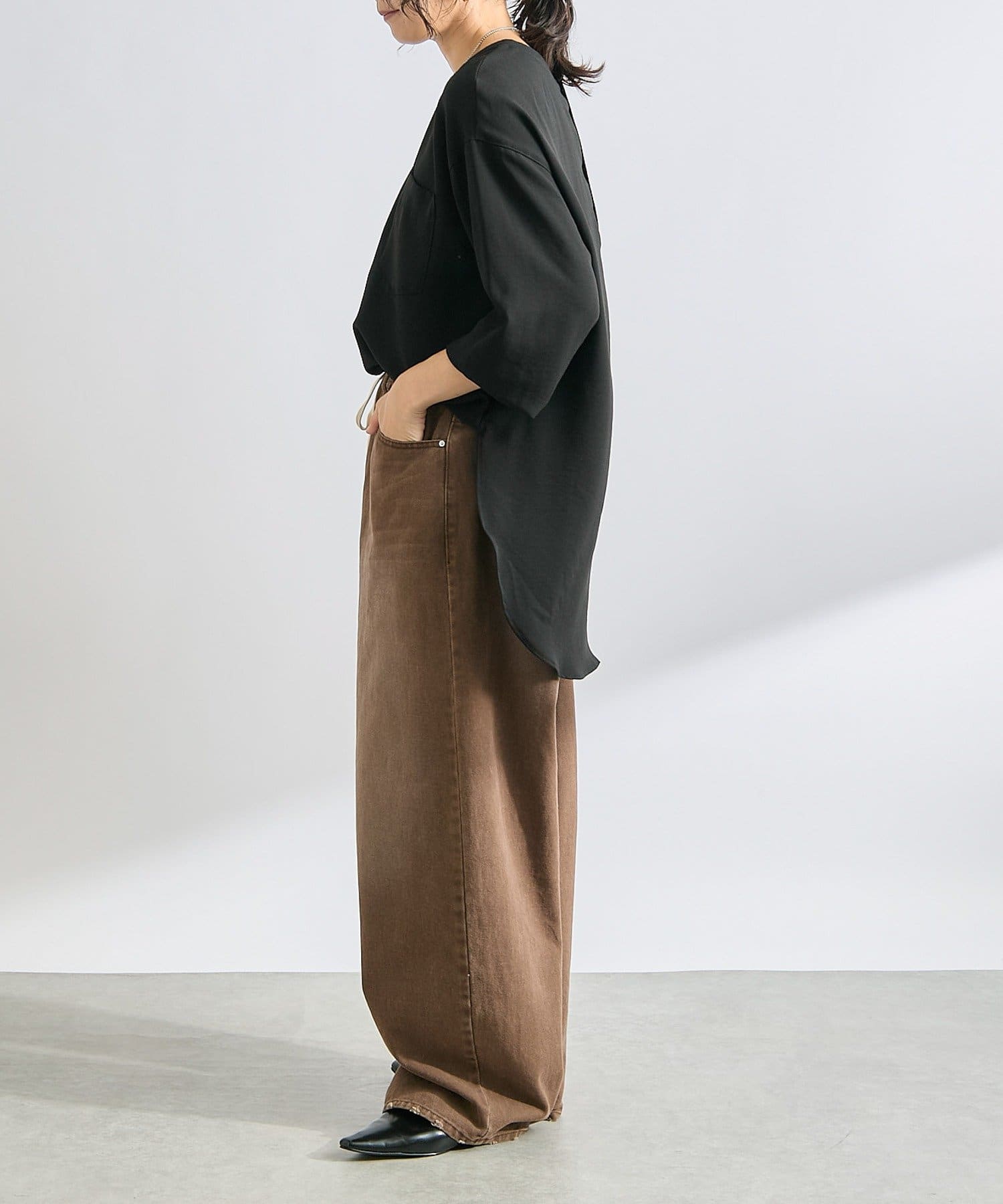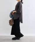 購入場所:店舗ブラウンの色が気に入って購入。ブラウスのようなサラサラした素材で品良く見える。でも首元や袖口がリブになっていてカジュアル要素もある。一番いいなと思ったのは、サイドにスリットが入っていて、前だけインするのがめちゃくちゃ簡単に叶うこと!(スリットないと、微調整大変じゃない?)そんなこんなで、平日も休日も出番が多い。色違いも欲しい!