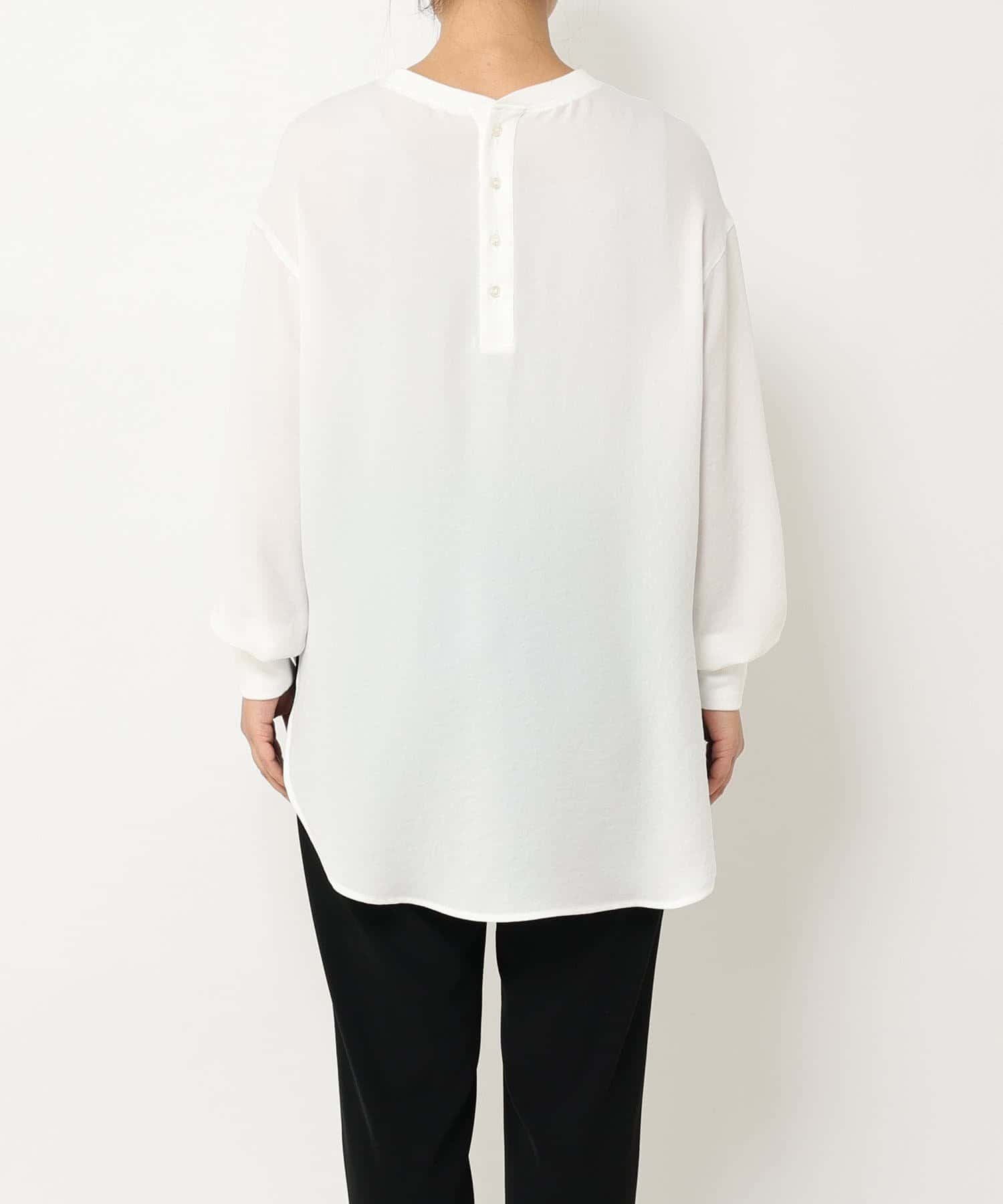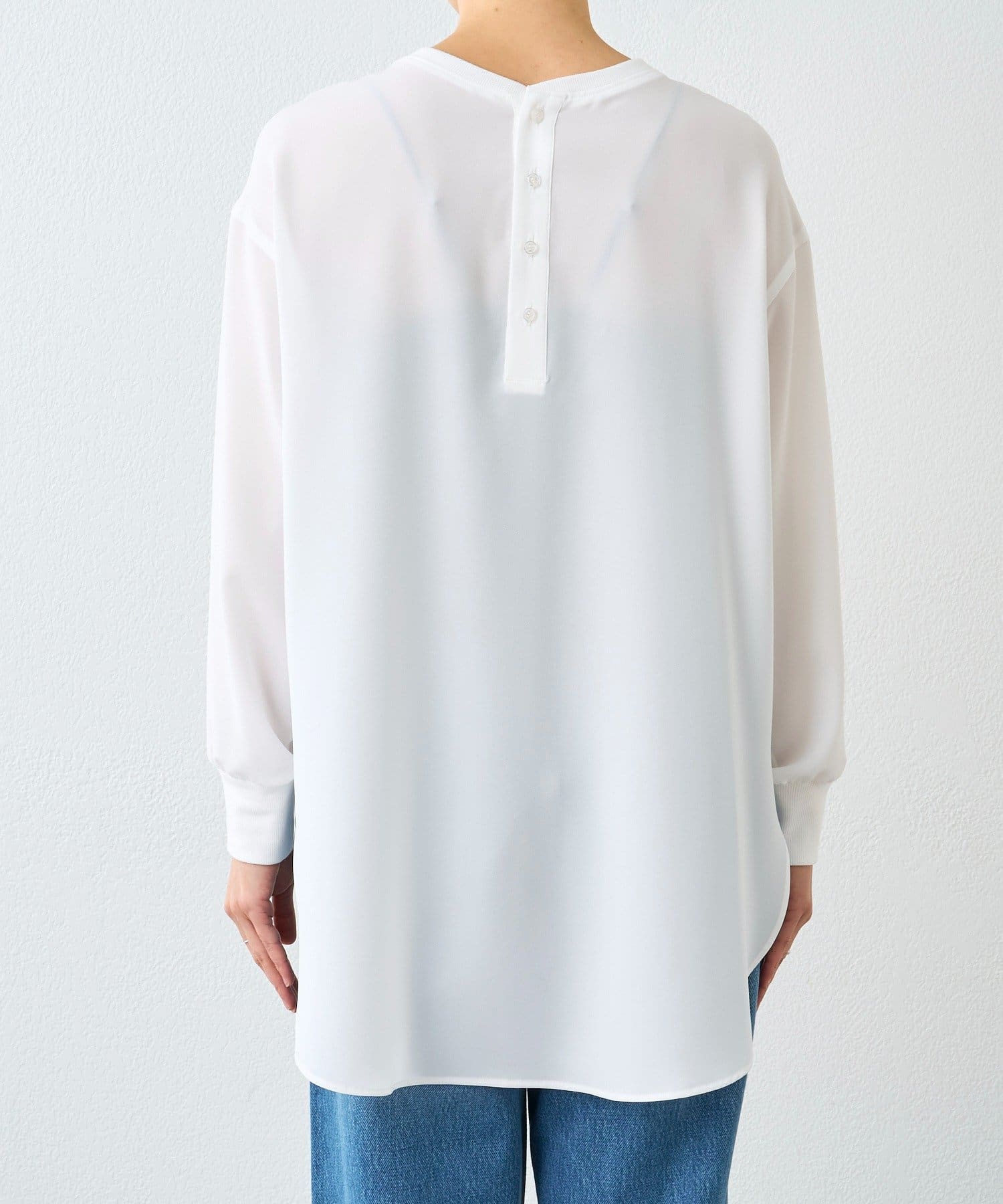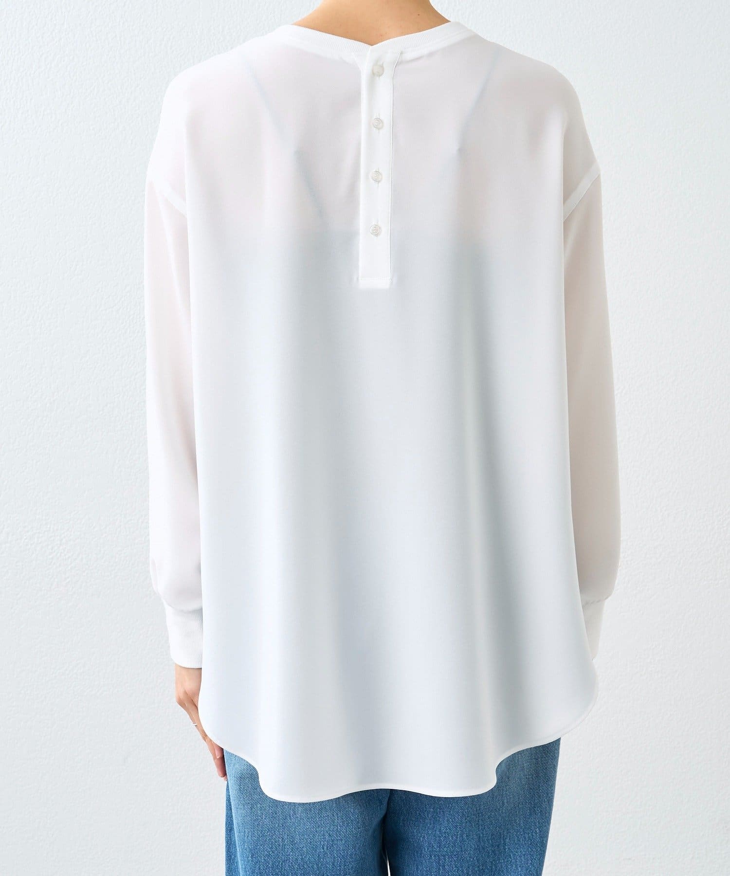 ストレッチ性とふんわりと滑らかな表面感のあるジョーゼットでお作りしているため、Tシャツのような感覚で着ていただけるブラウス。