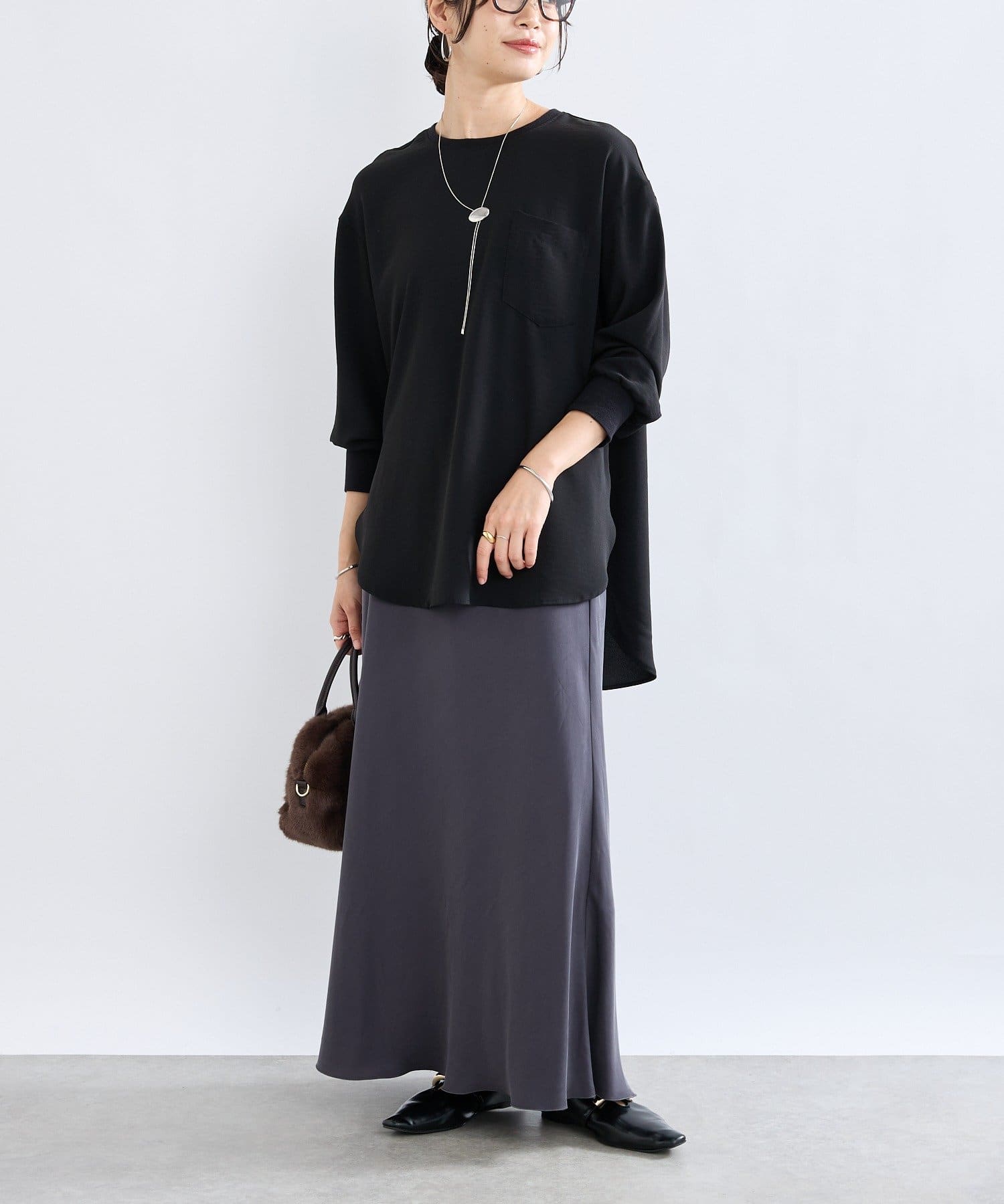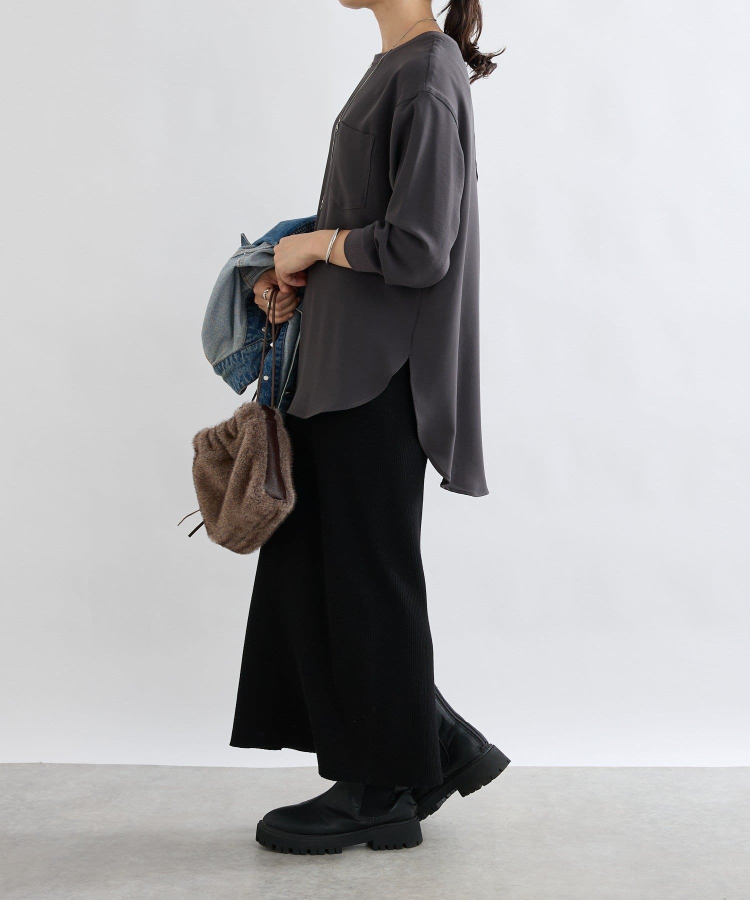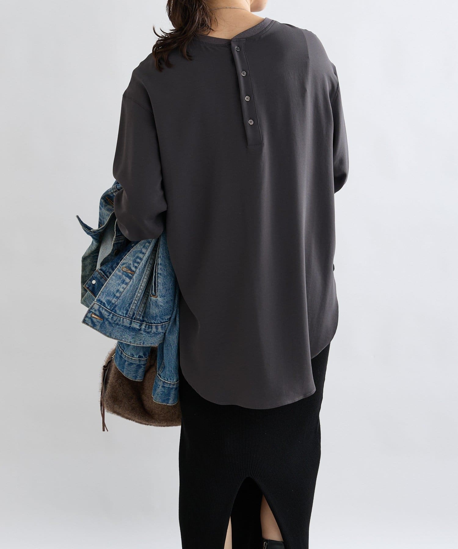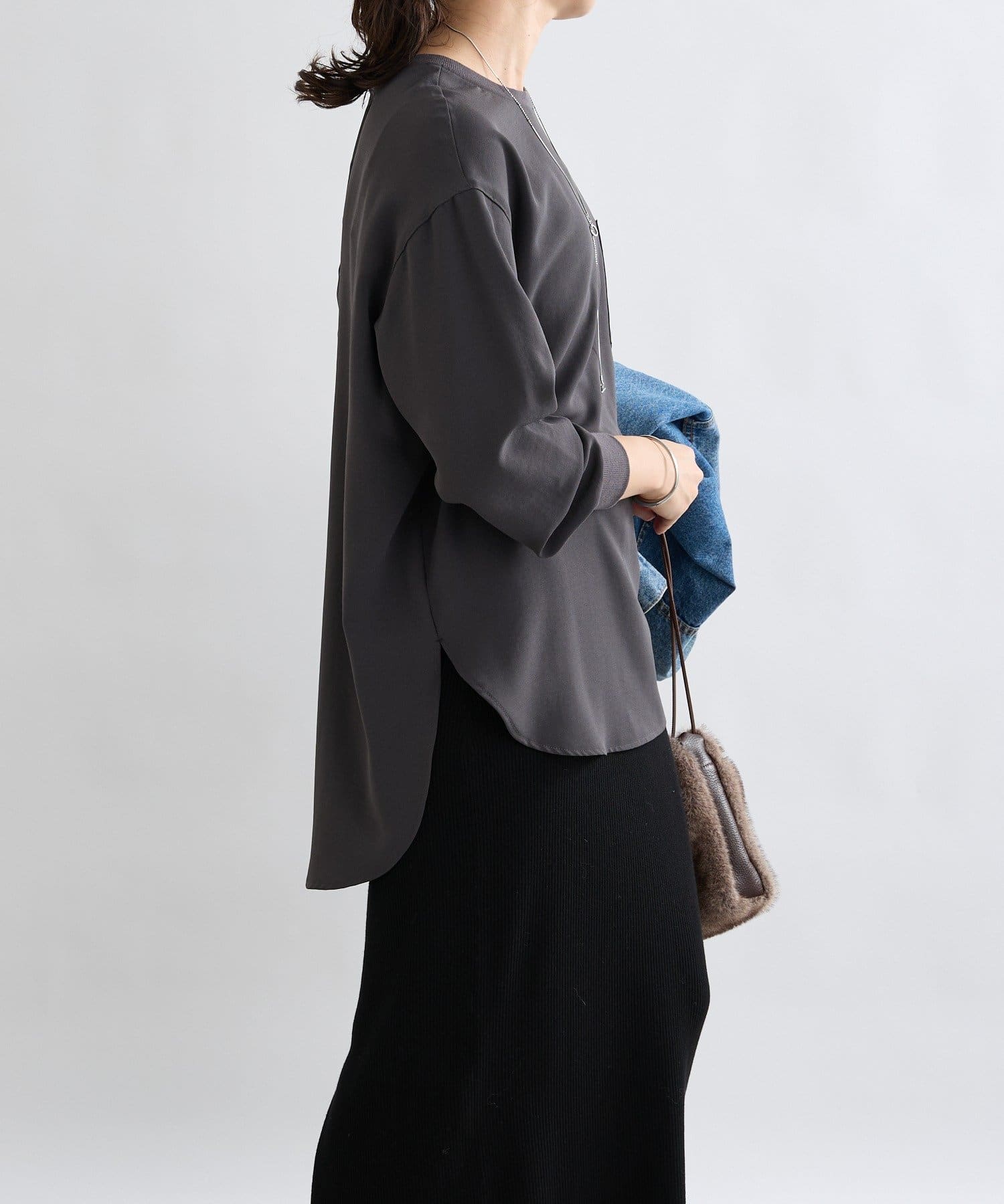 グレーの色味も、肌をきれいに見せてくれます。きれいめですが、かっちりしすぎずに動きやすい作りです。
