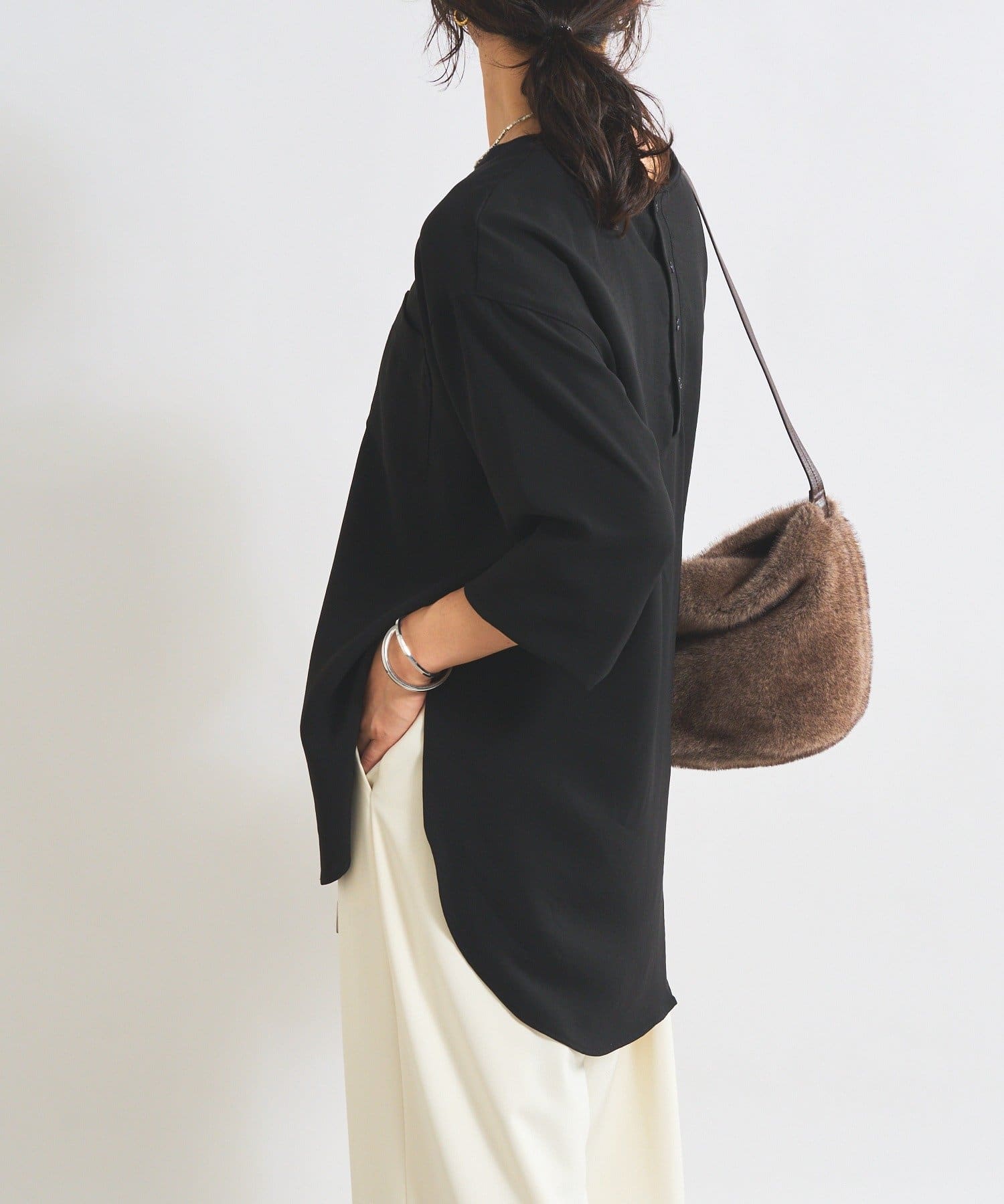 秋冬にはジャケットやニットのインナーとして、春夏にはシャツのインナーや一枚着としてサラッと着こなしていただける、年中活躍する万能ブラウスです。