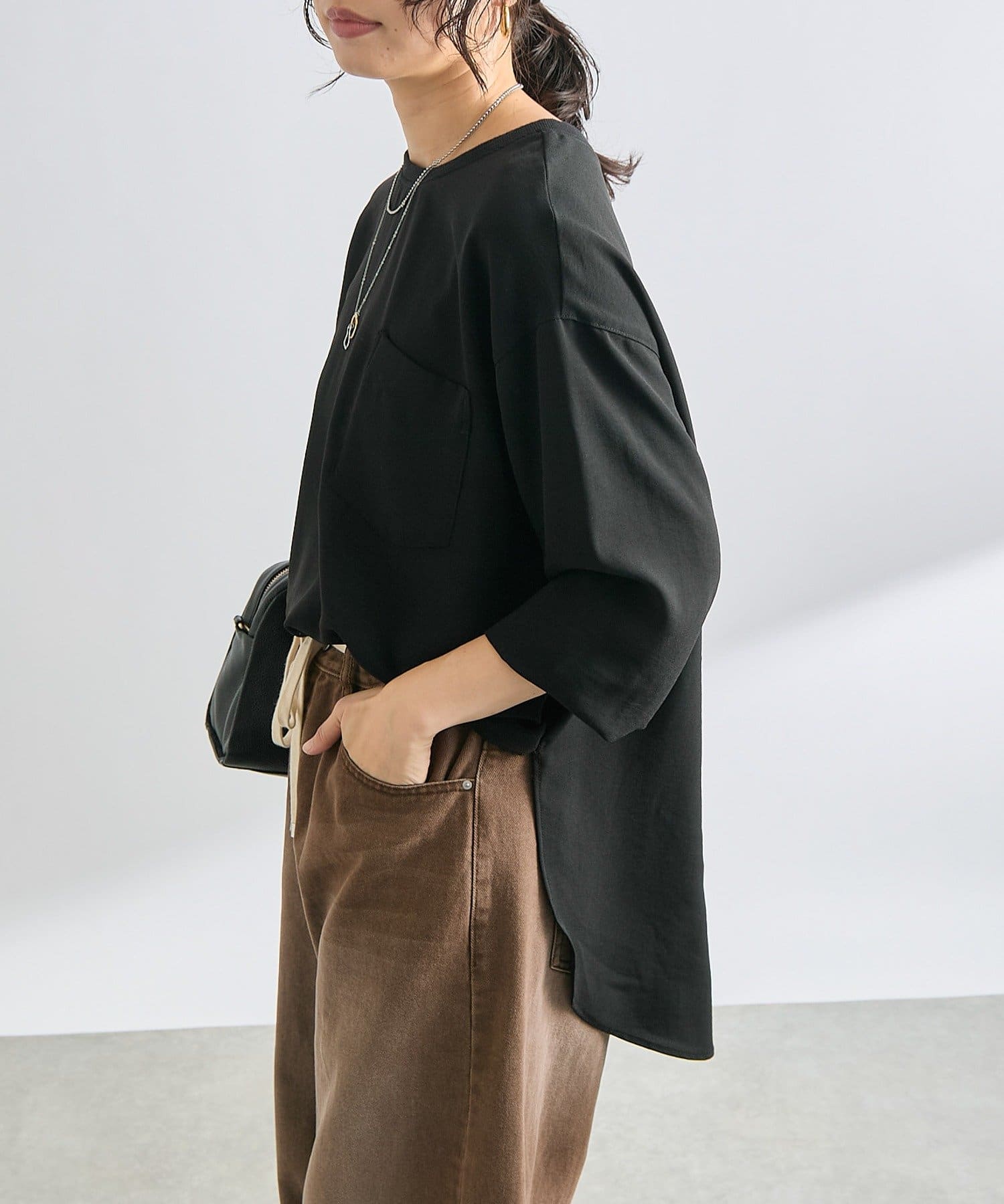 素材はサラッサラでキレイめだけど袖の部分がリブになってる事や胸ポケット、後ろのボタンの少しカジュアルさも、ありそうで無かった1枚だと思います!