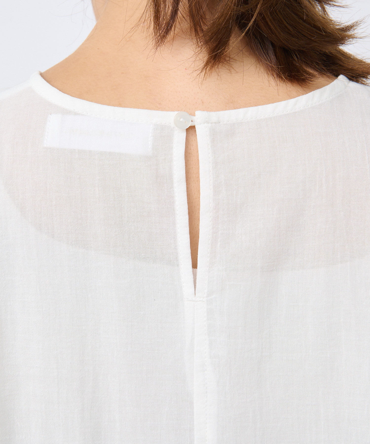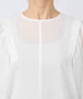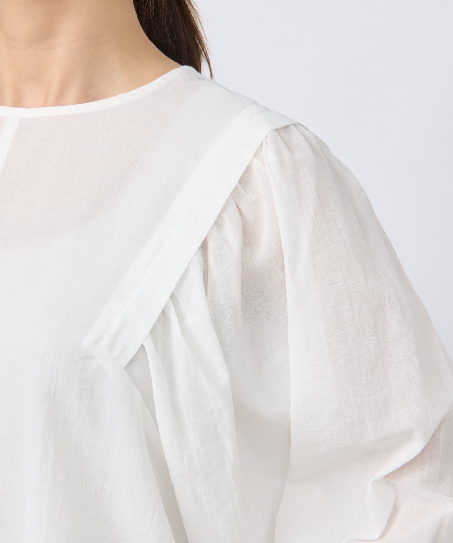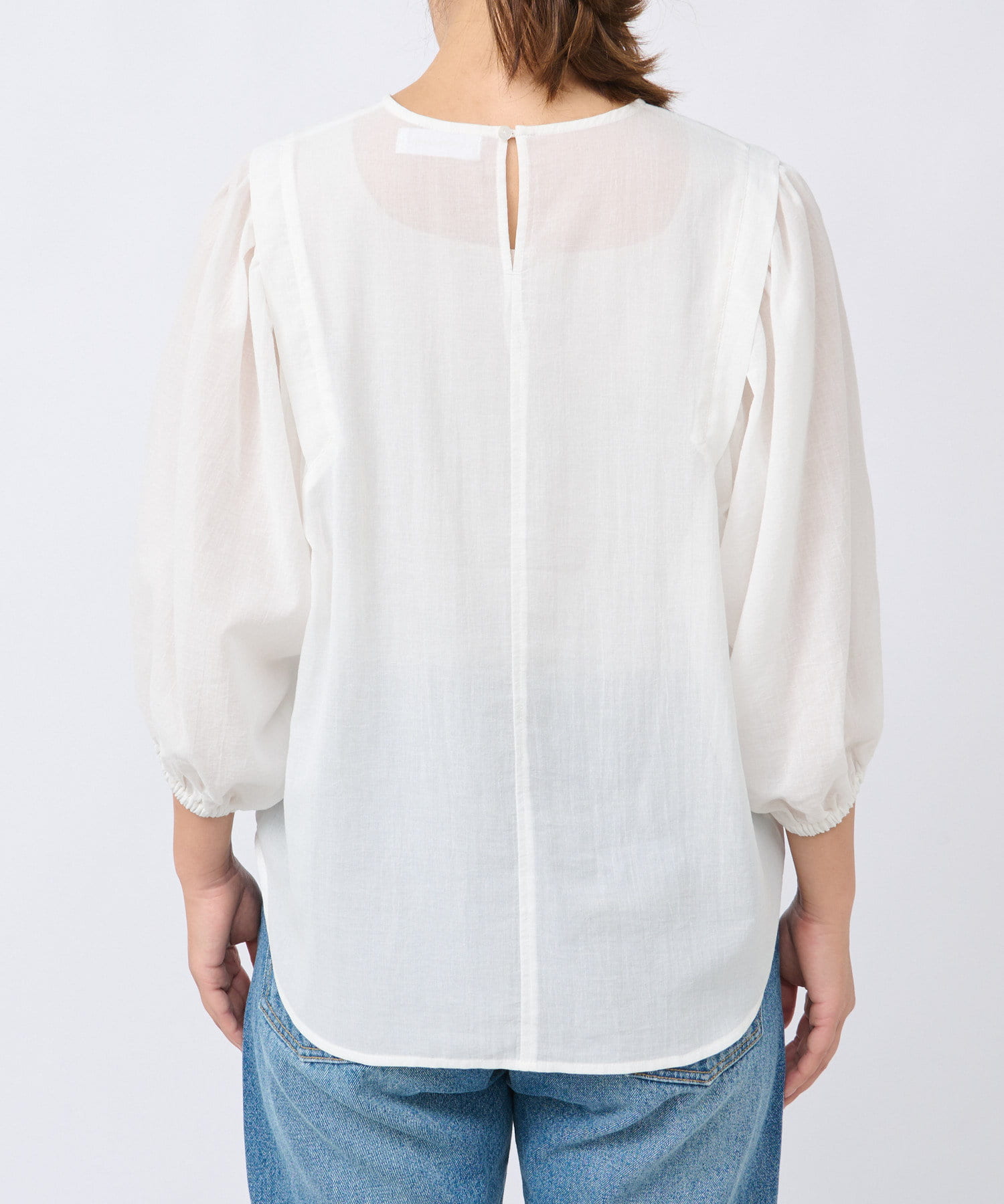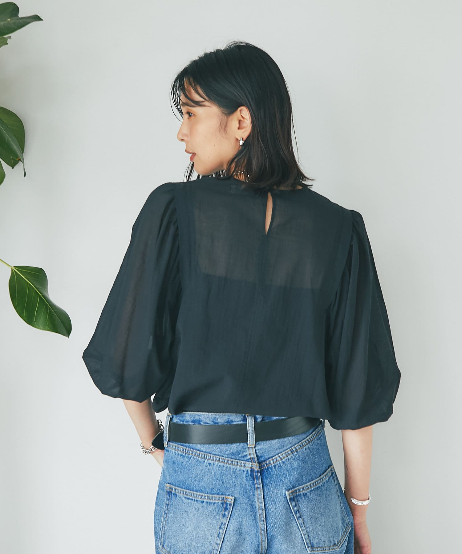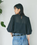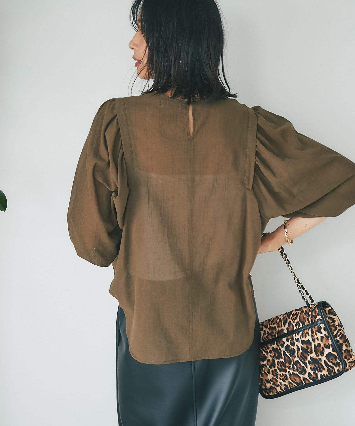 スリーブのボリューム感がポイントのブラウス。シアー感があり涼し気な印象です。