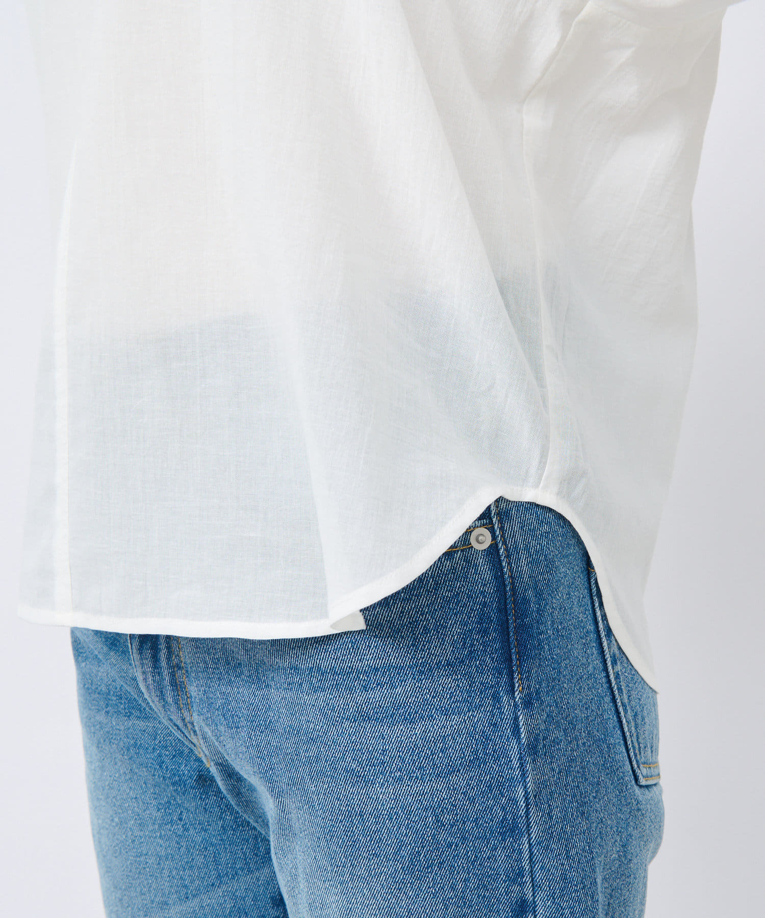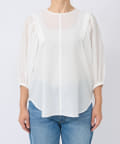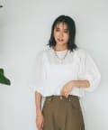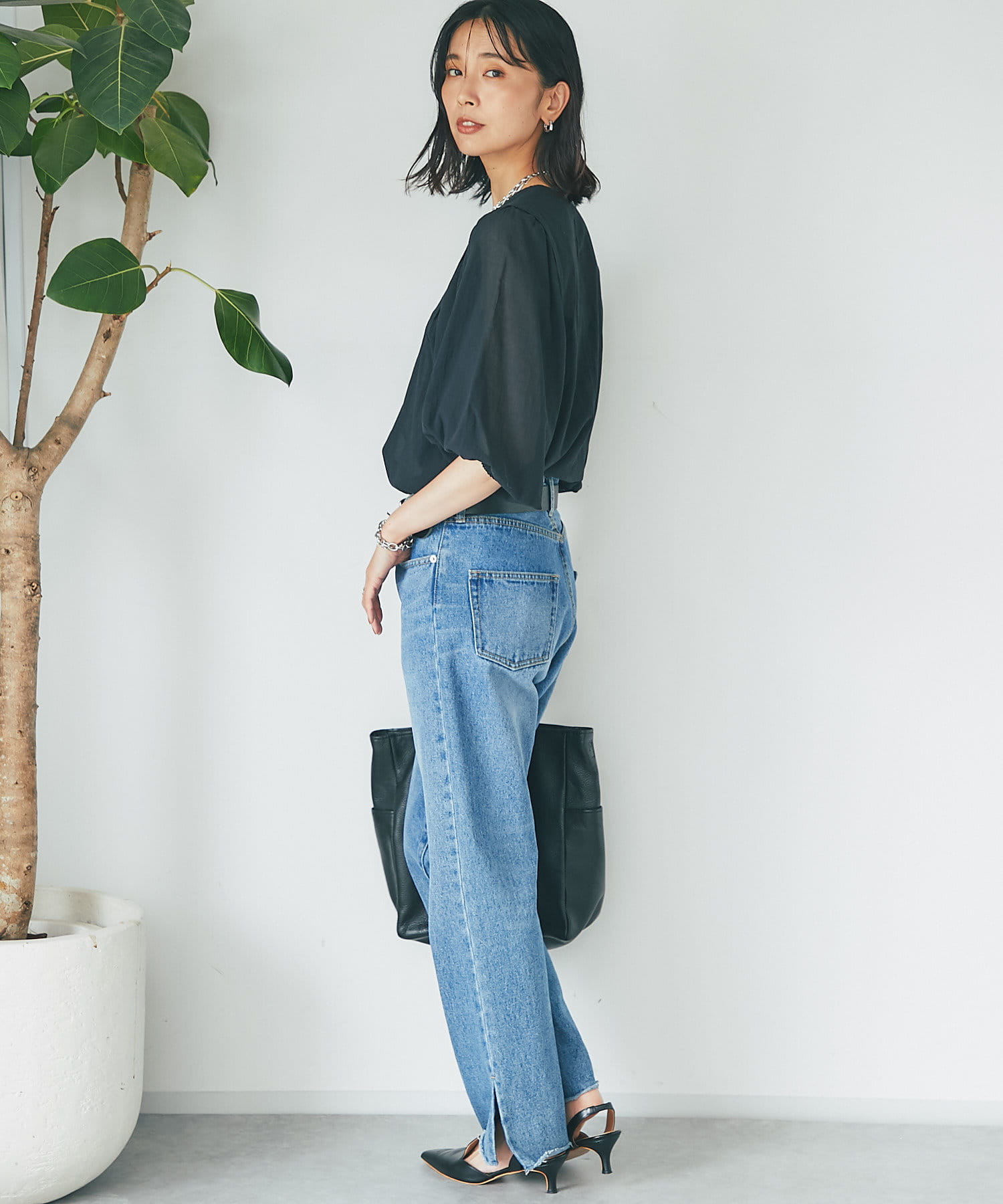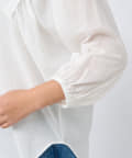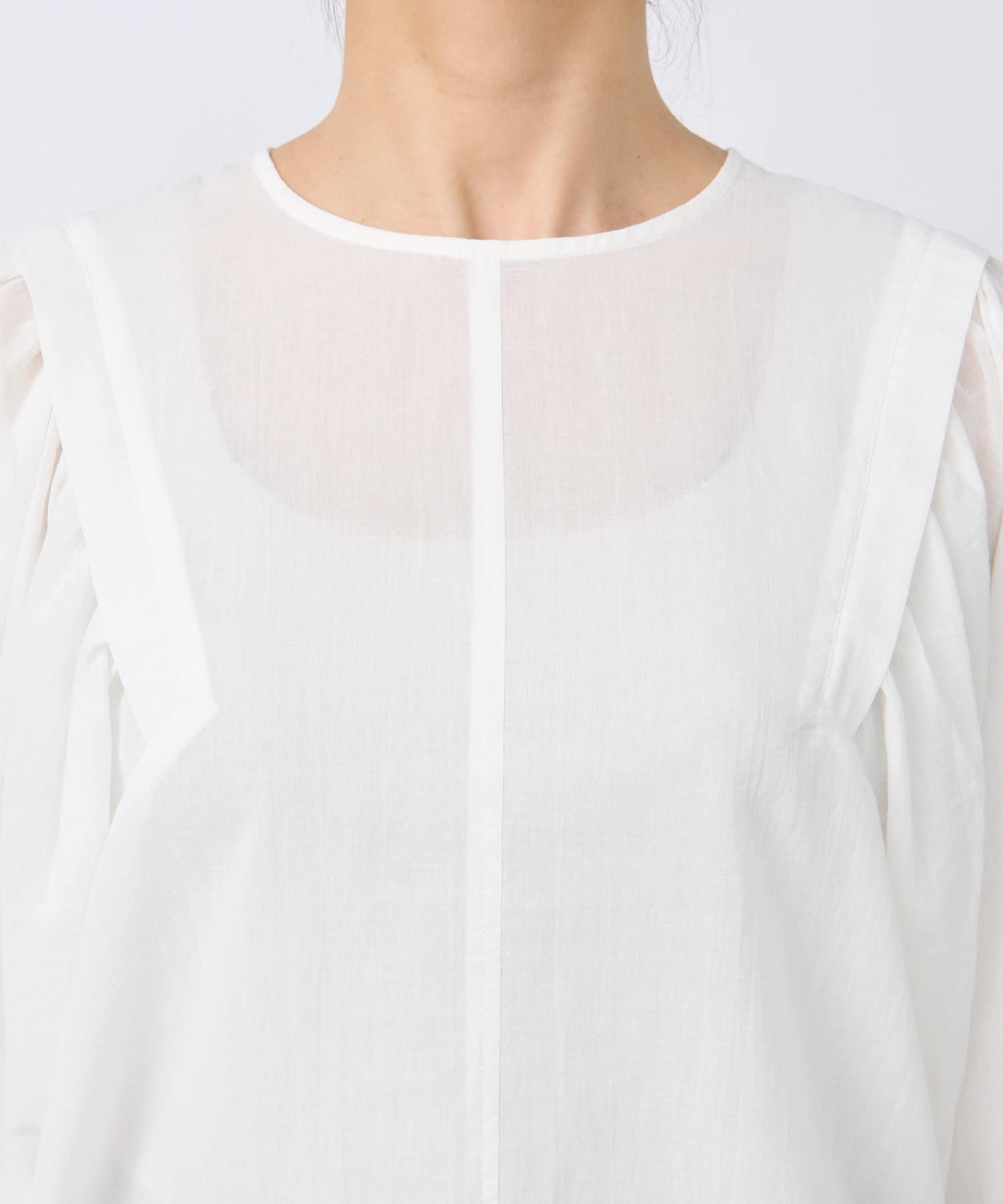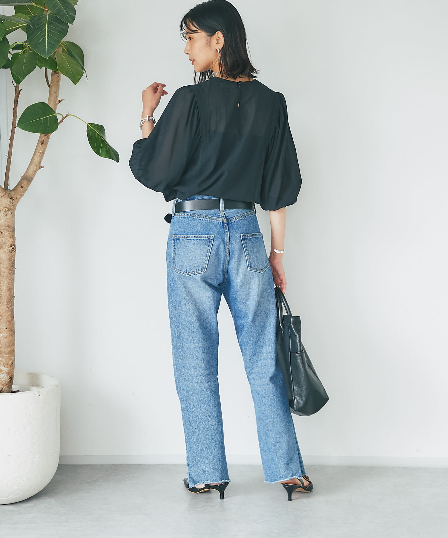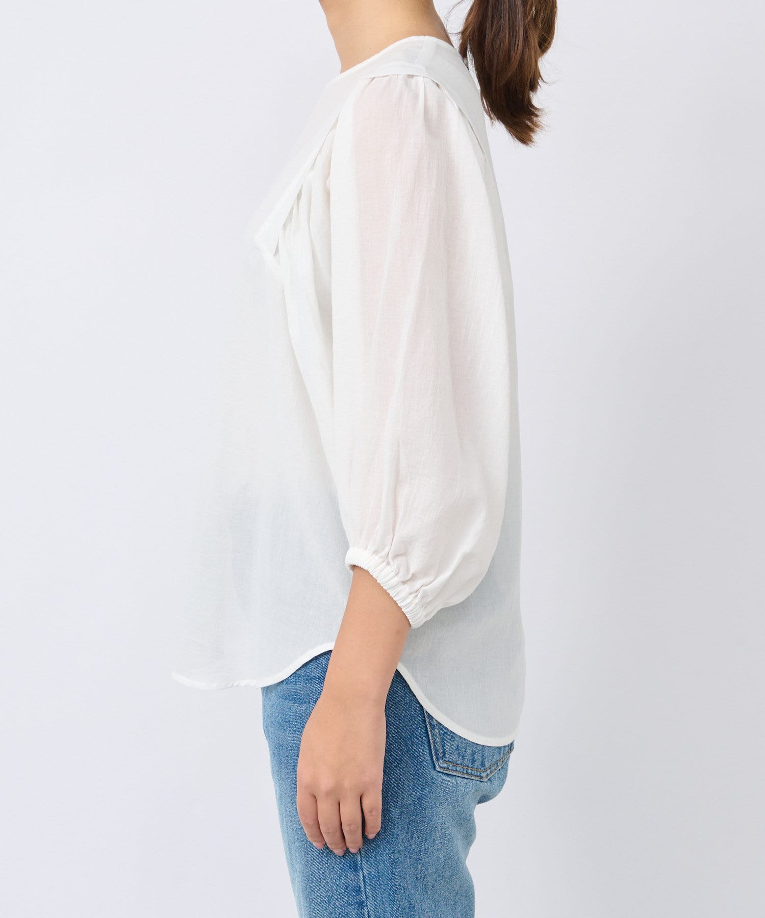 スリーブのボリューム感がポイントのブラウス。シアー感があり涼し気な印象です。