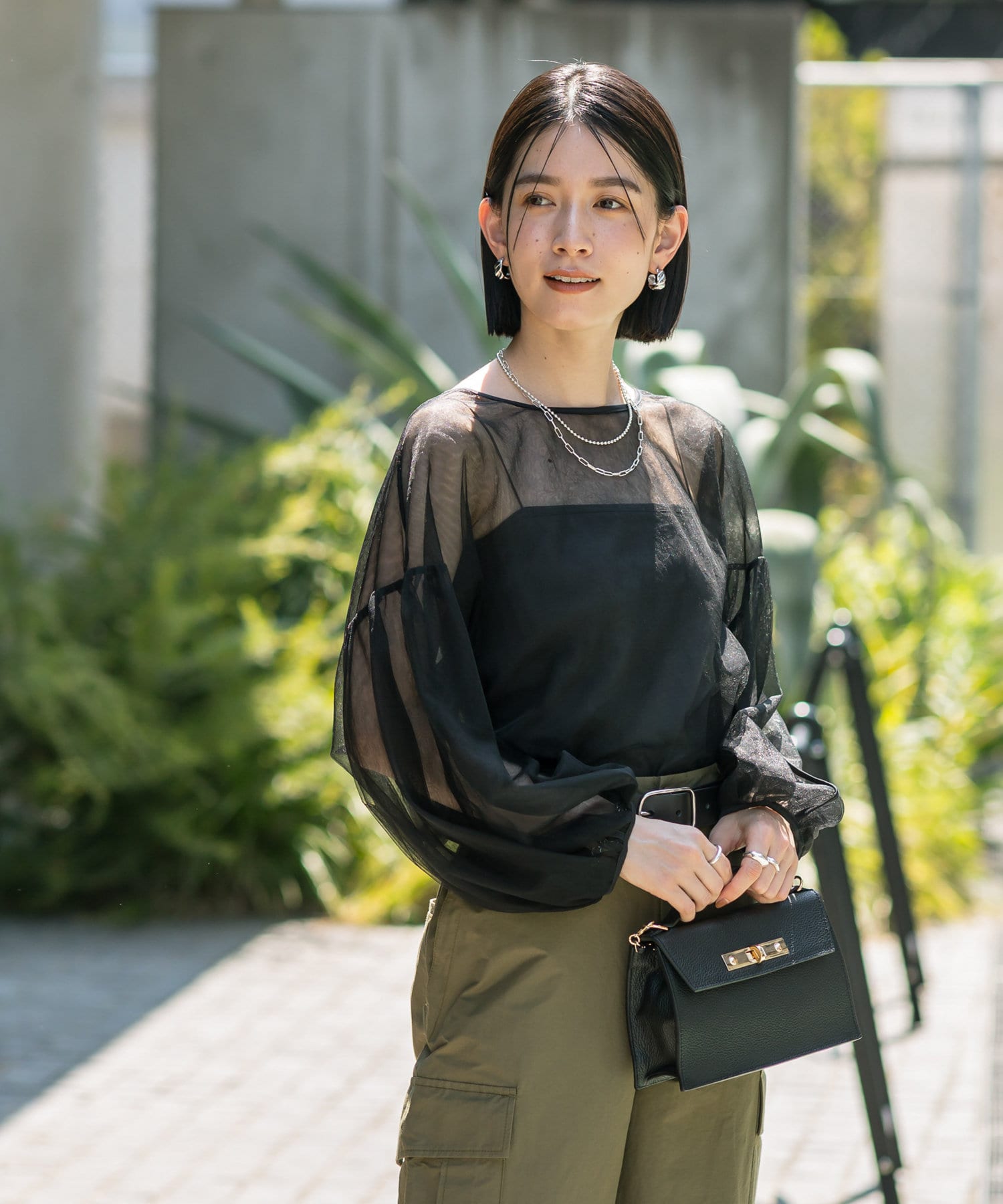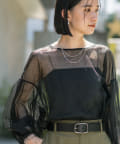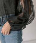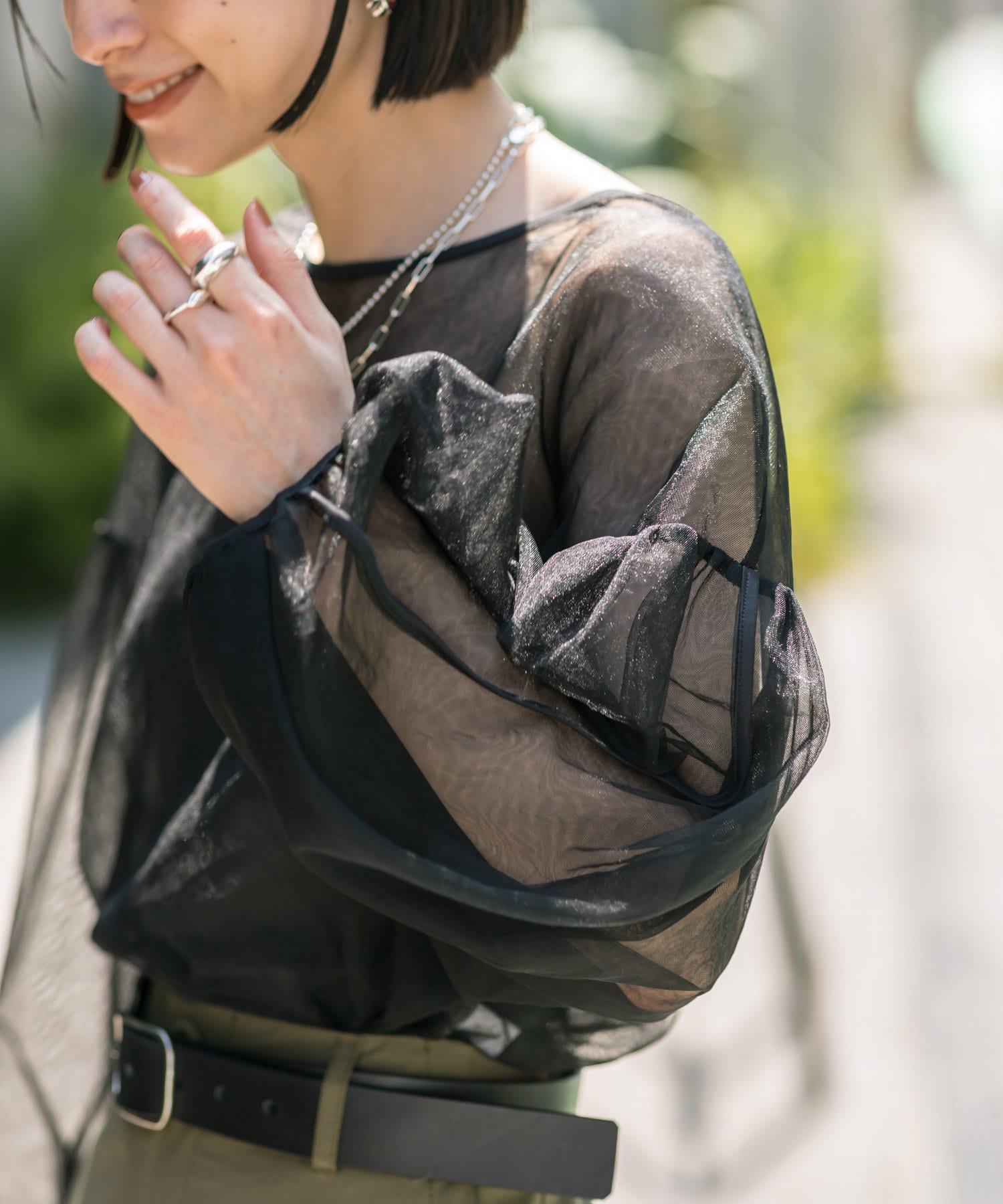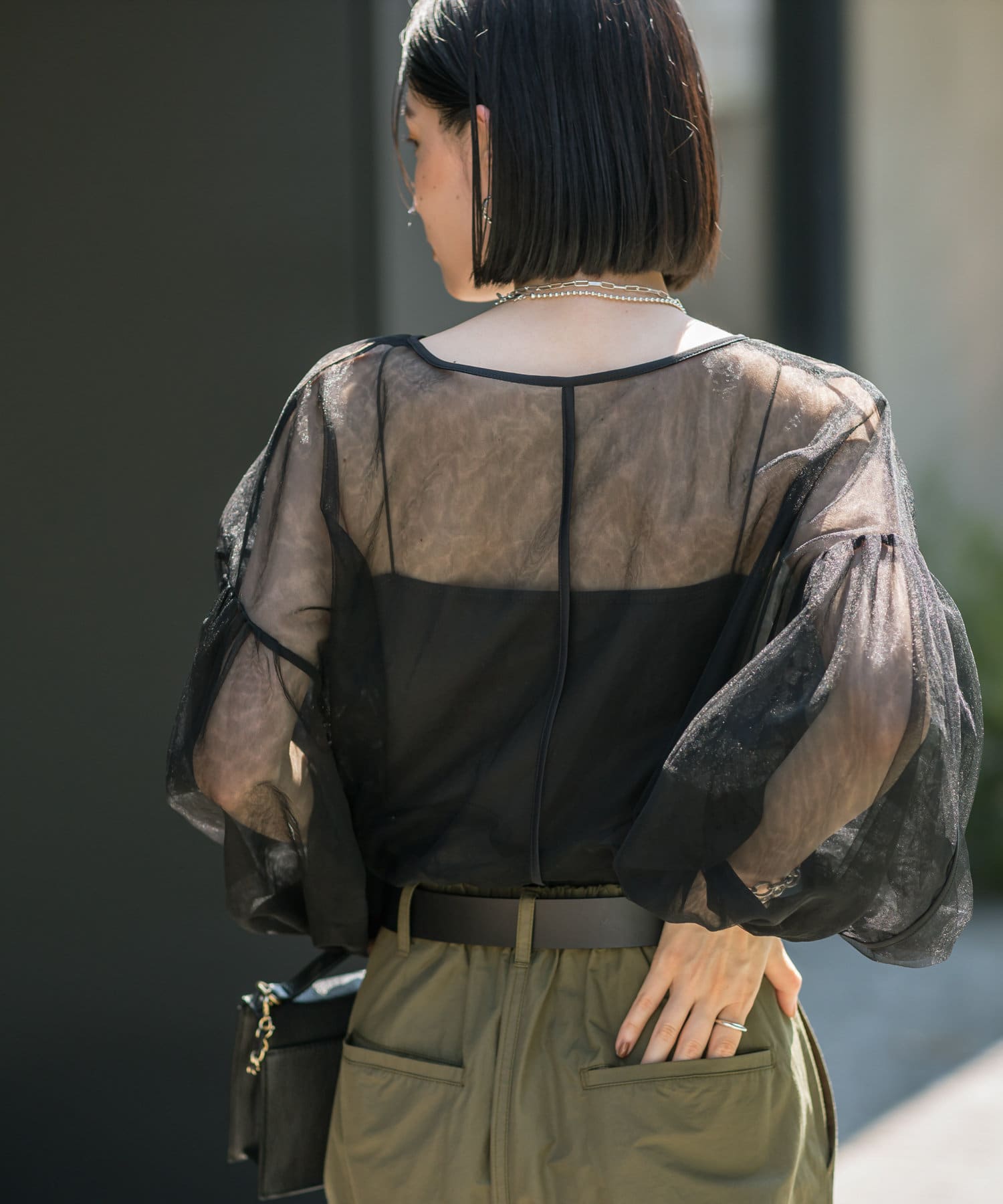 スリーブのボリューム感と短めの着丈でトレンド感のある1枚。シアー感があり涼し気な印象で着こなせます。