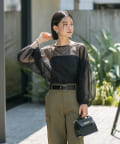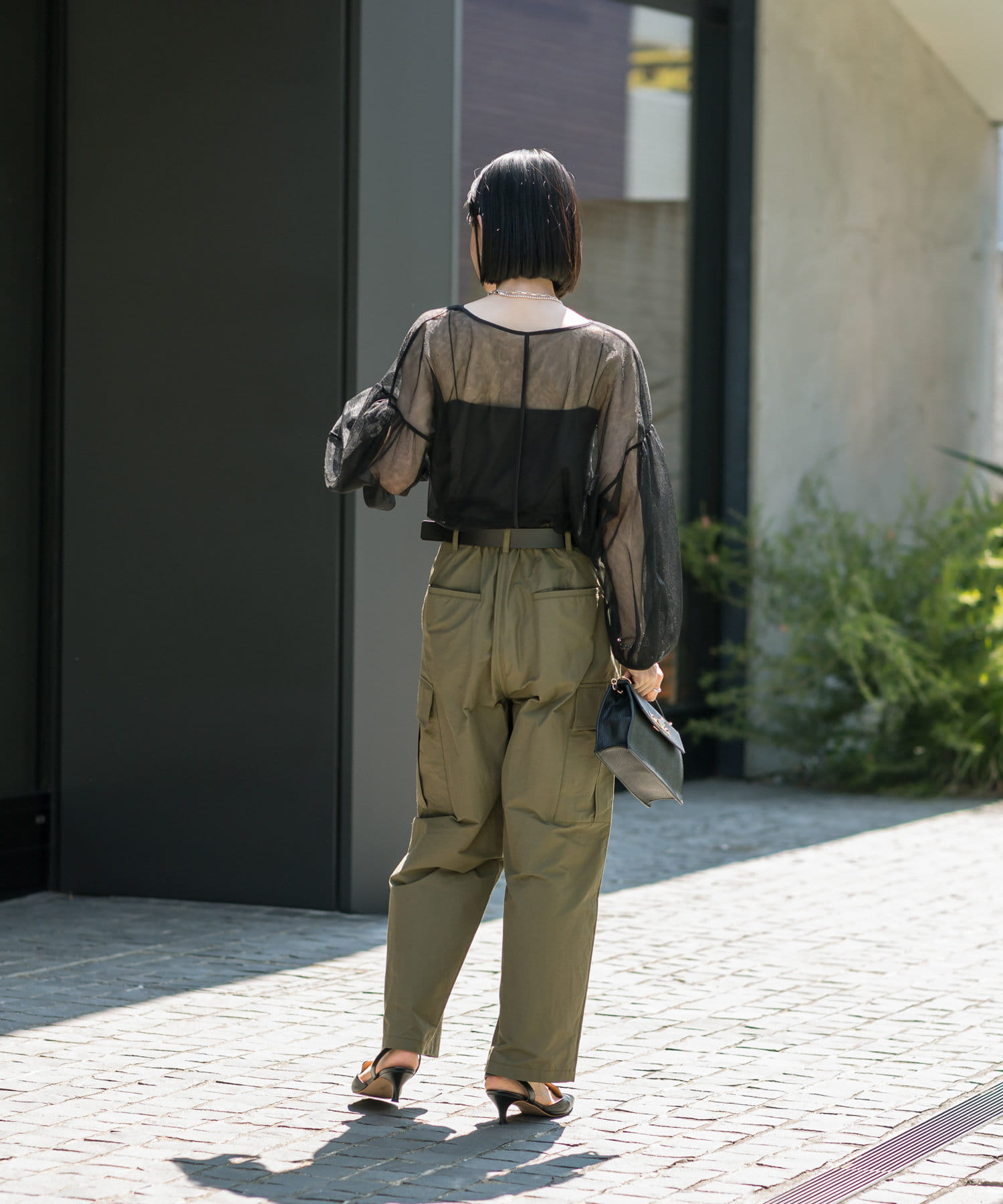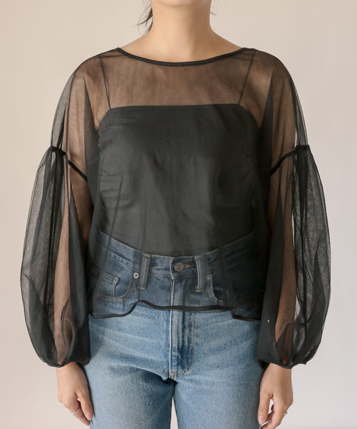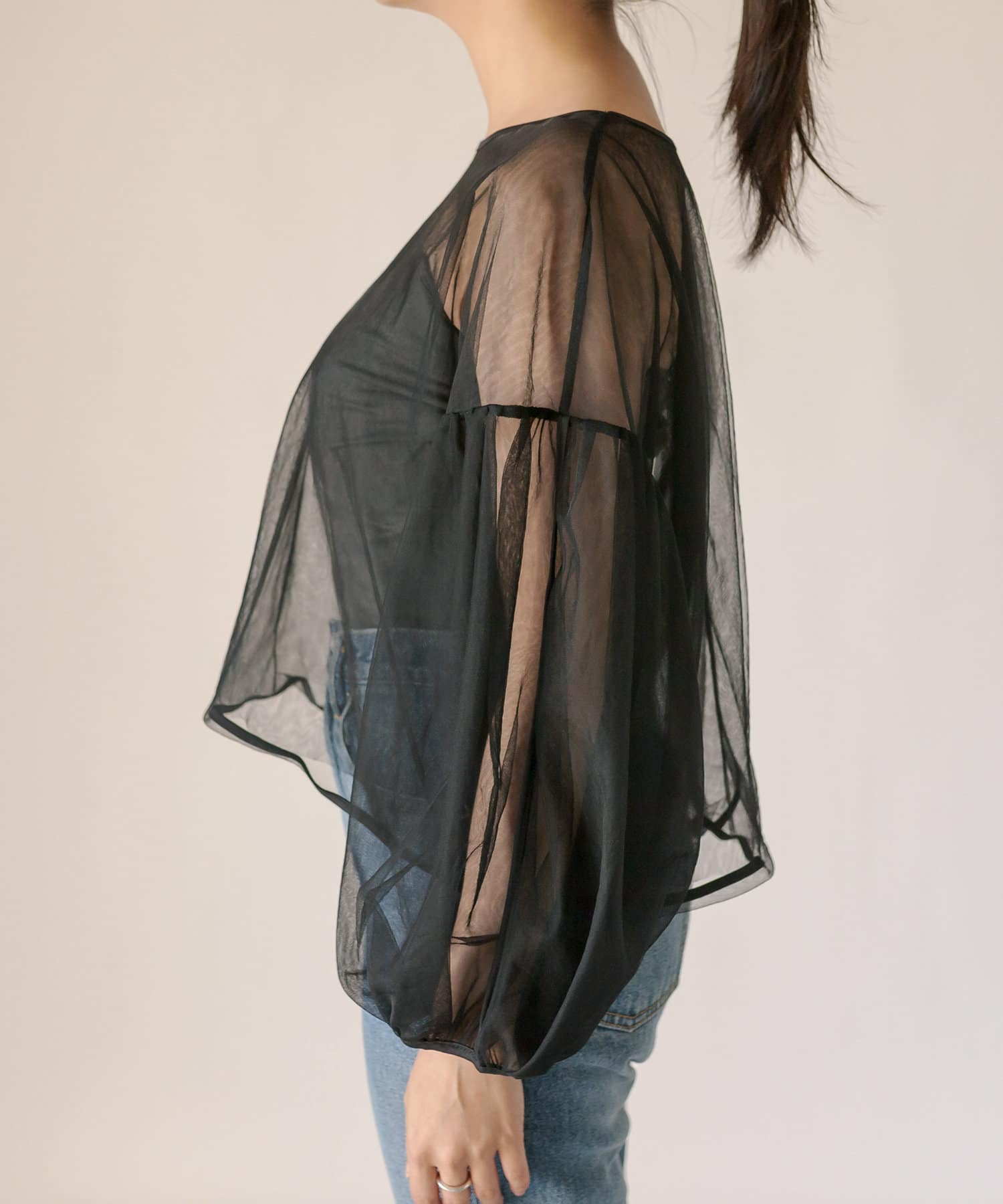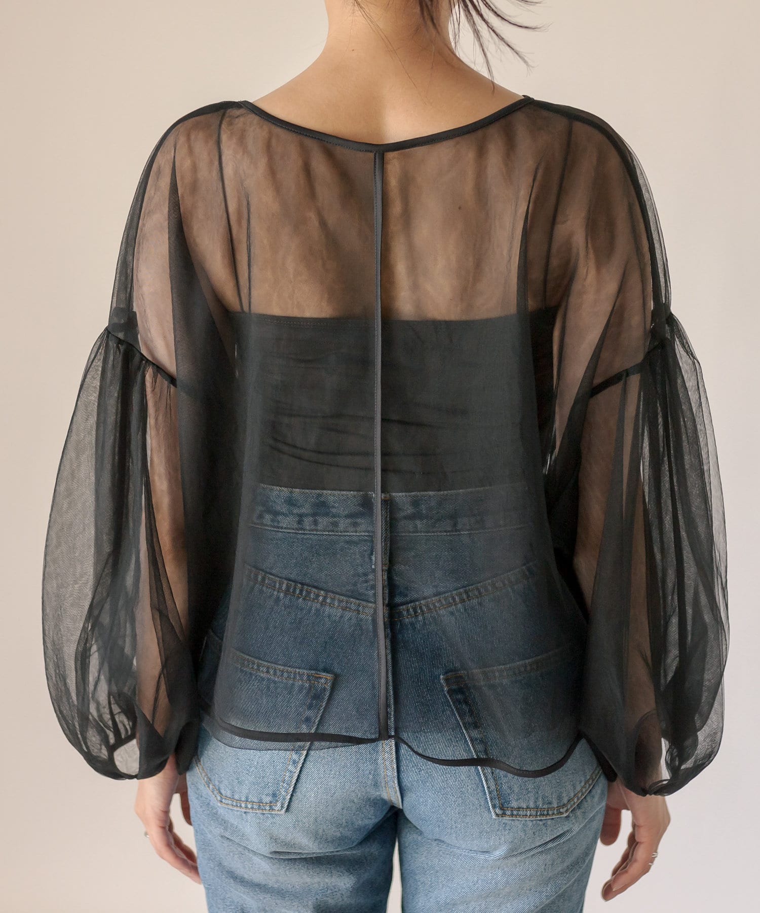 スリーブのボリューム感と短めの着丈でトレンド感のある1枚。シアー感があり涼し気な印象で着こなせます。