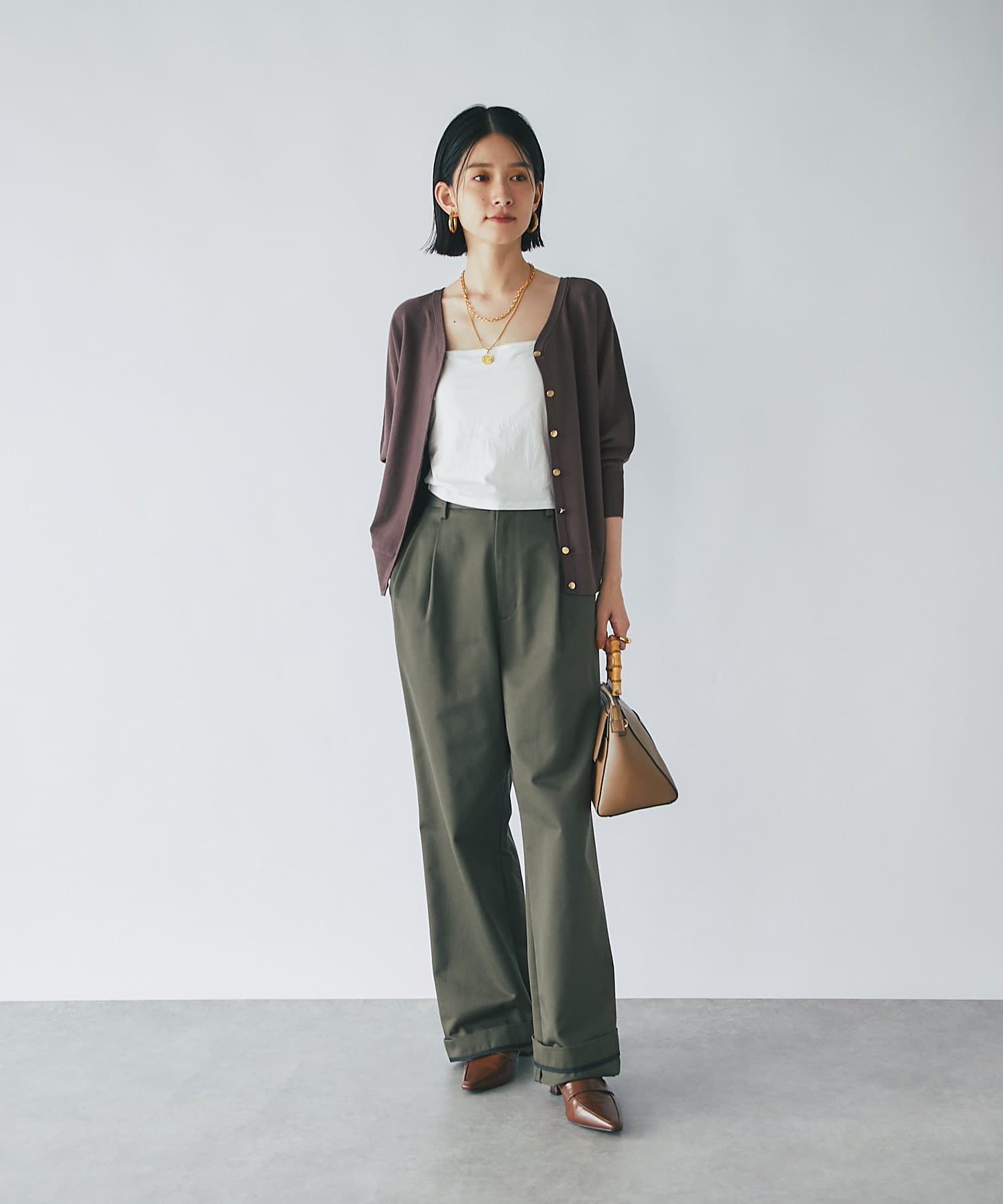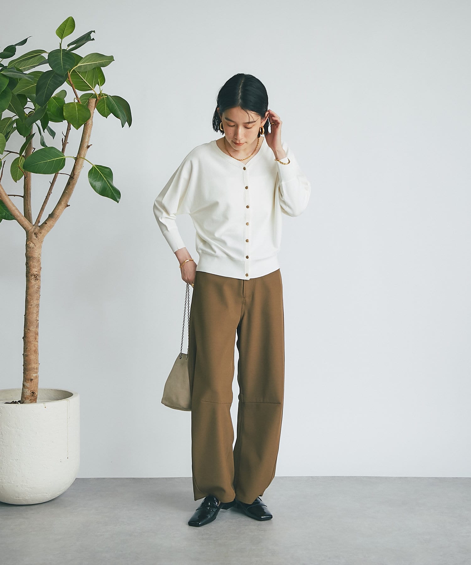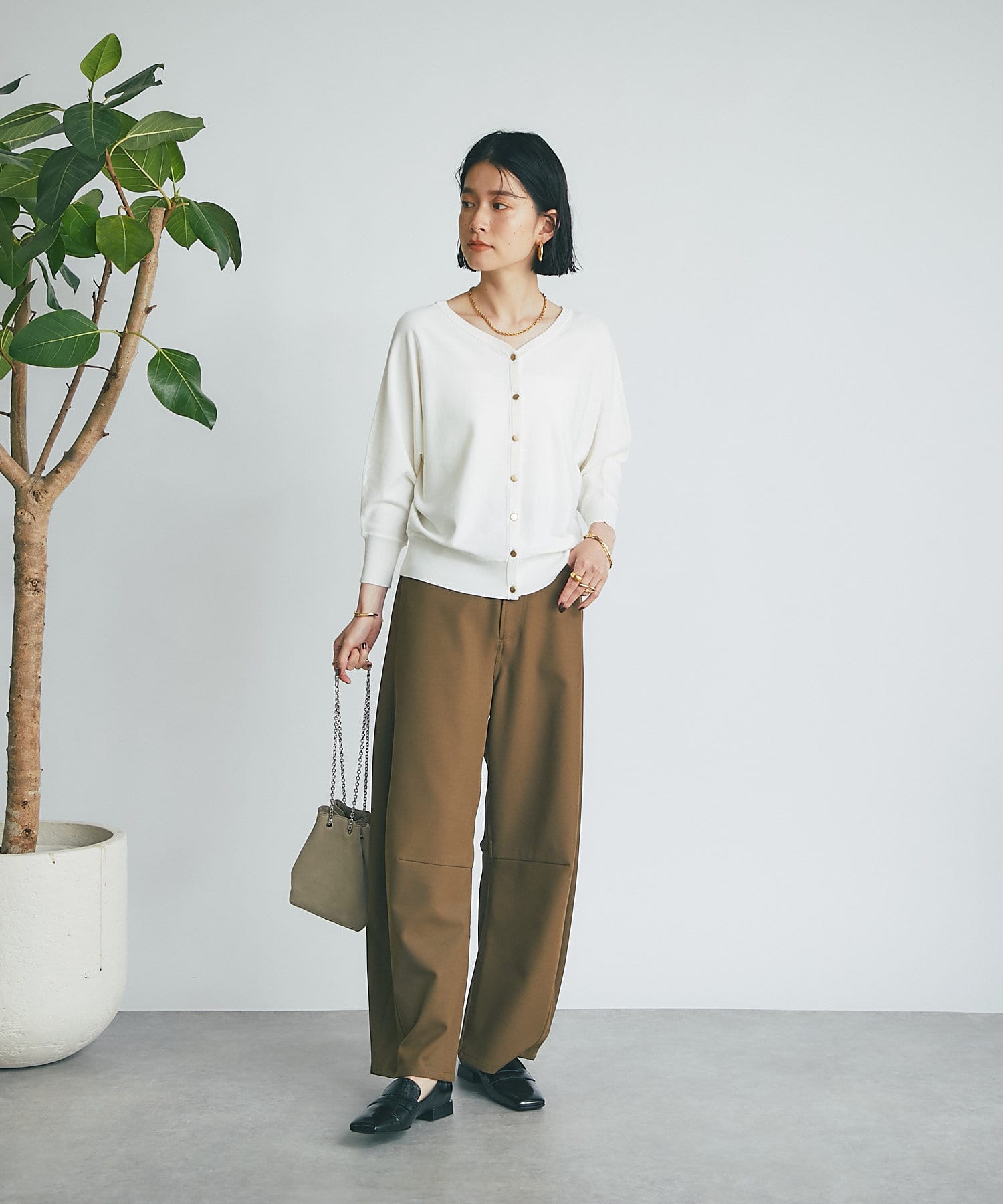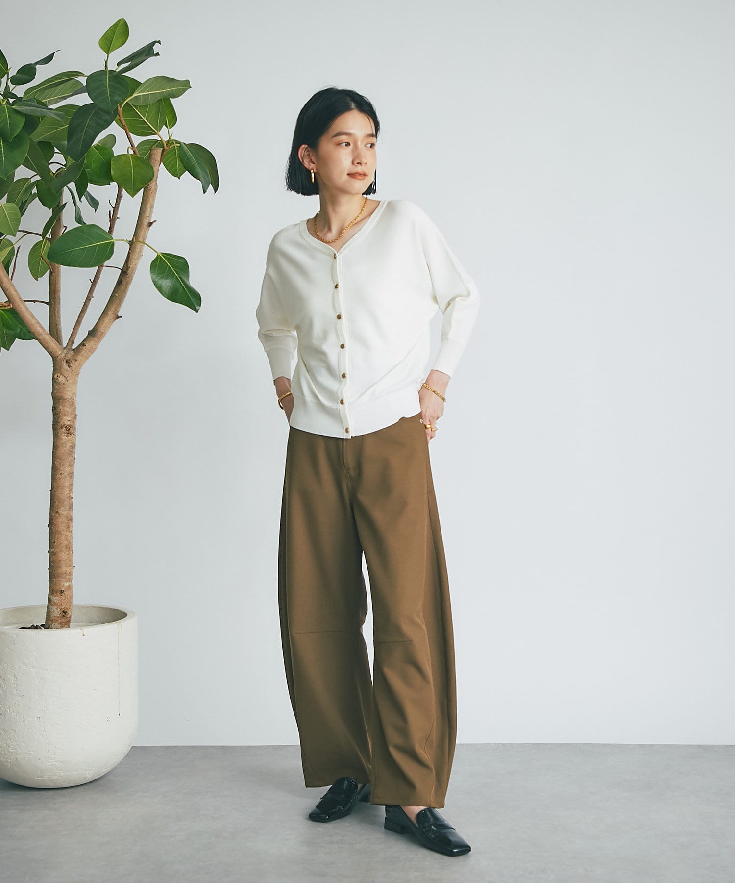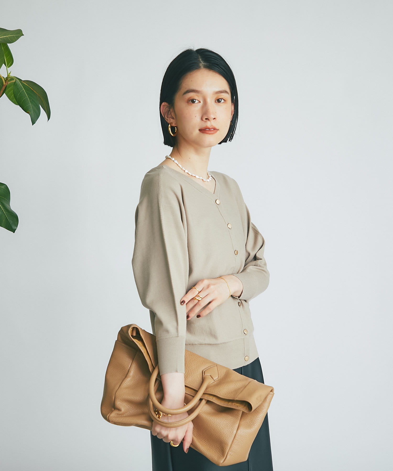 シンプルなデザインですが、ゴールドのボタンがアクセサリーのように女性らしい華やかさをプラスします。
