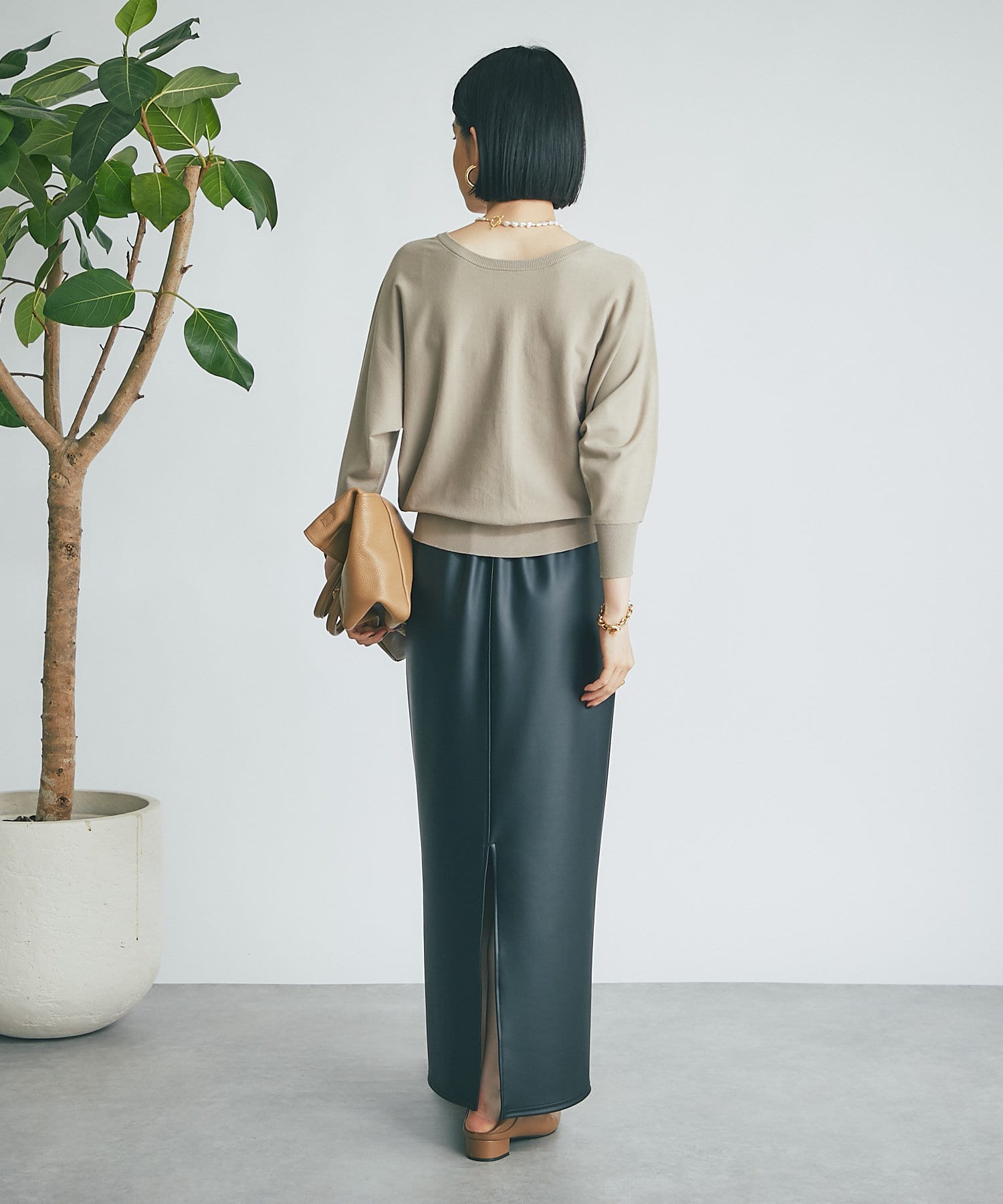 袖はドルマンスリーブで、腕周りのラインを拾いづらいデザイン。