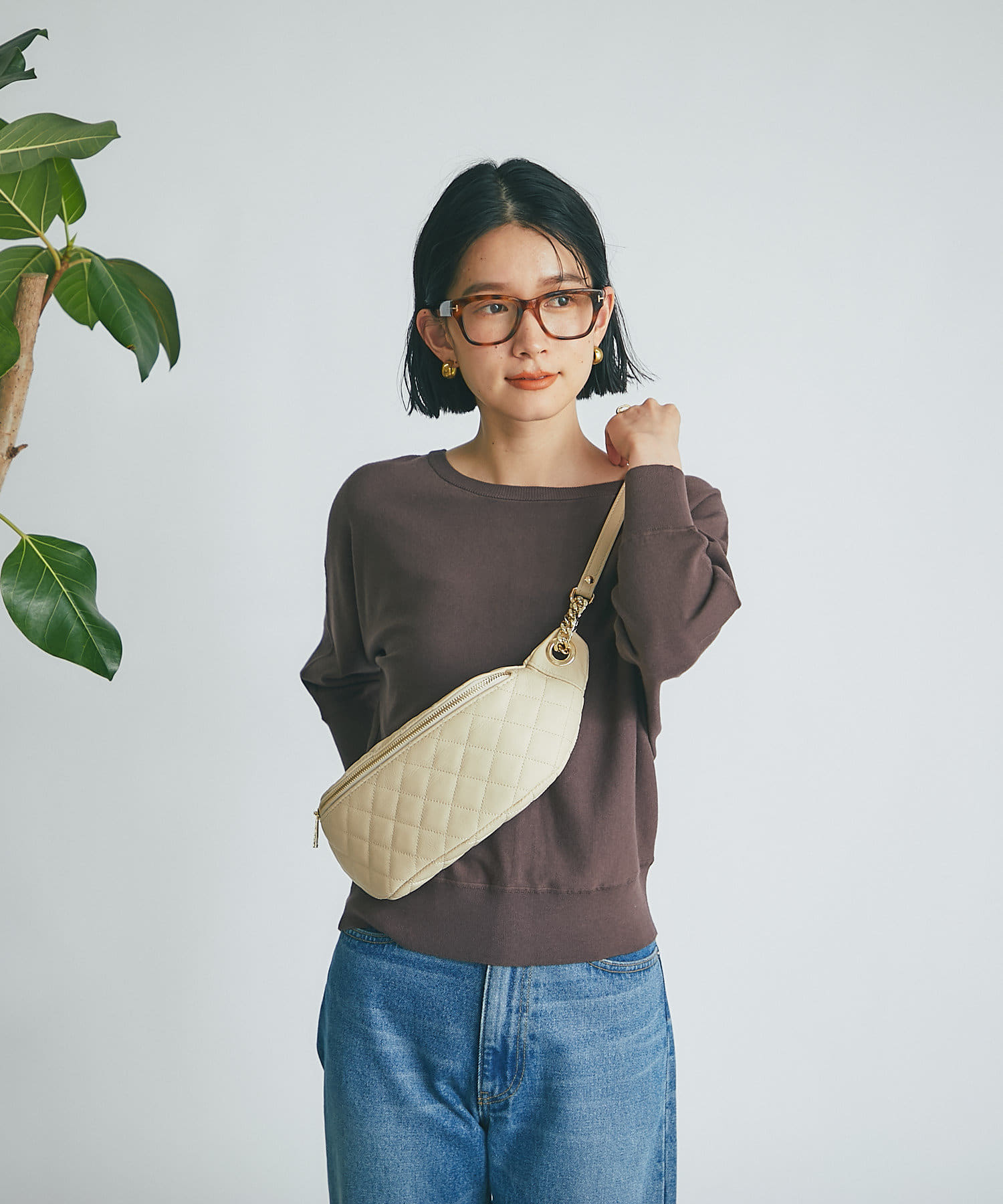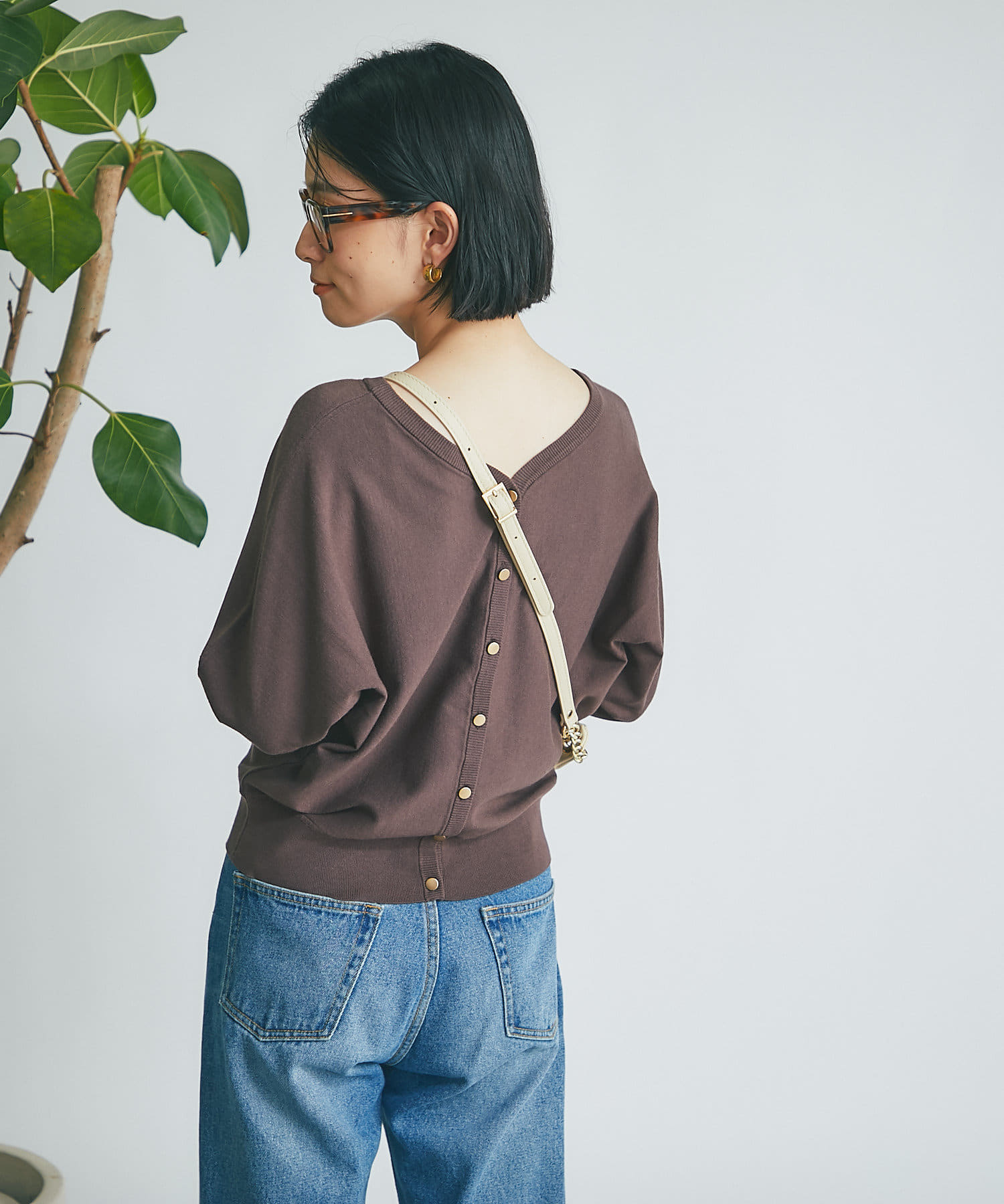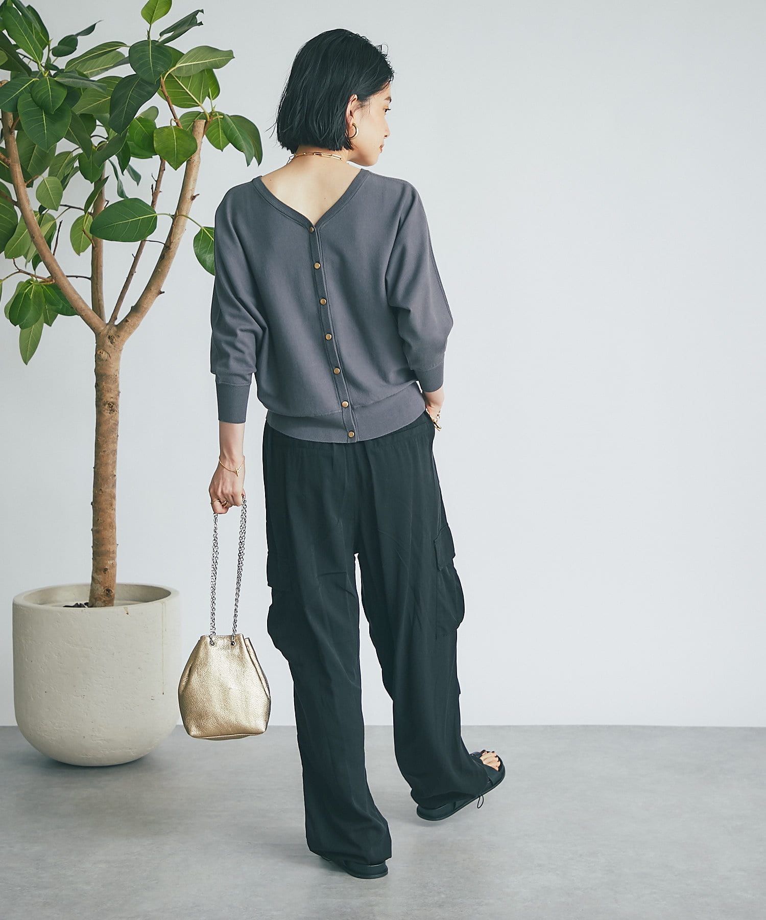 柄スカートの時はボタンを後ろにしてシンプルな印象にしたり、反対に女性らしい印象をプラスしたい日はボタンを前にしたりとその日の気分でお使いください。
