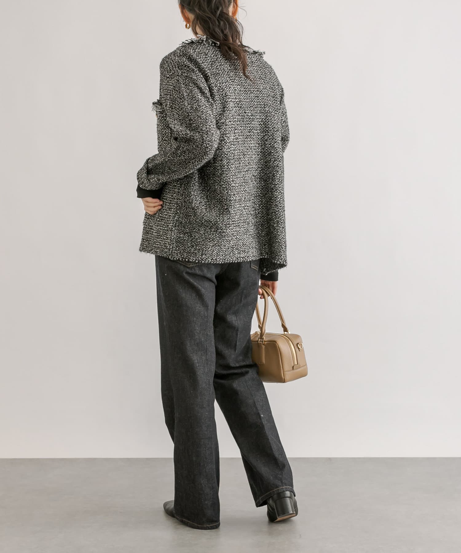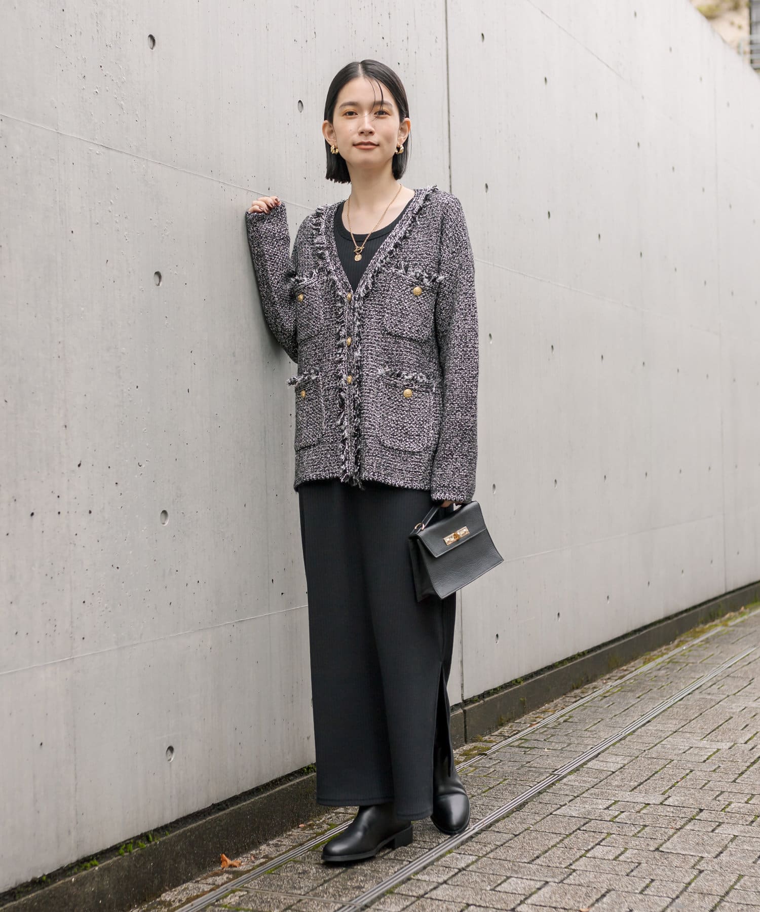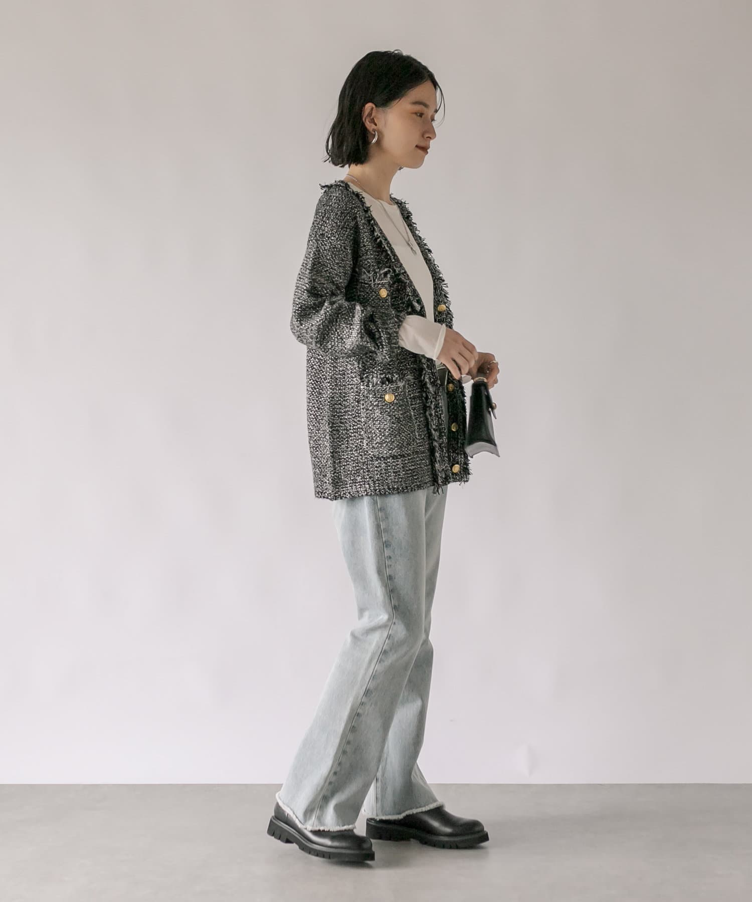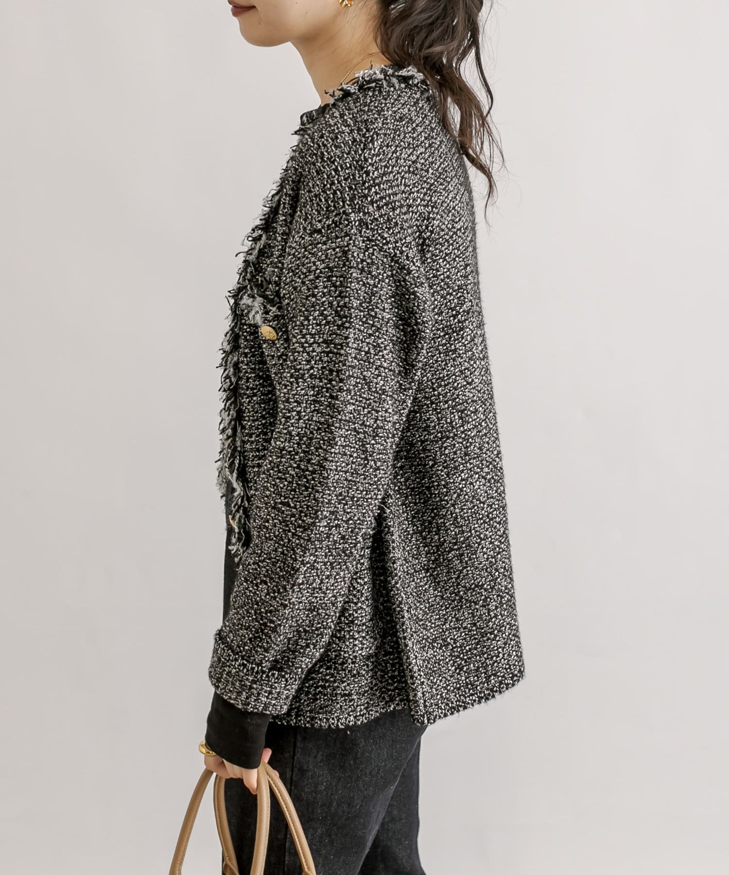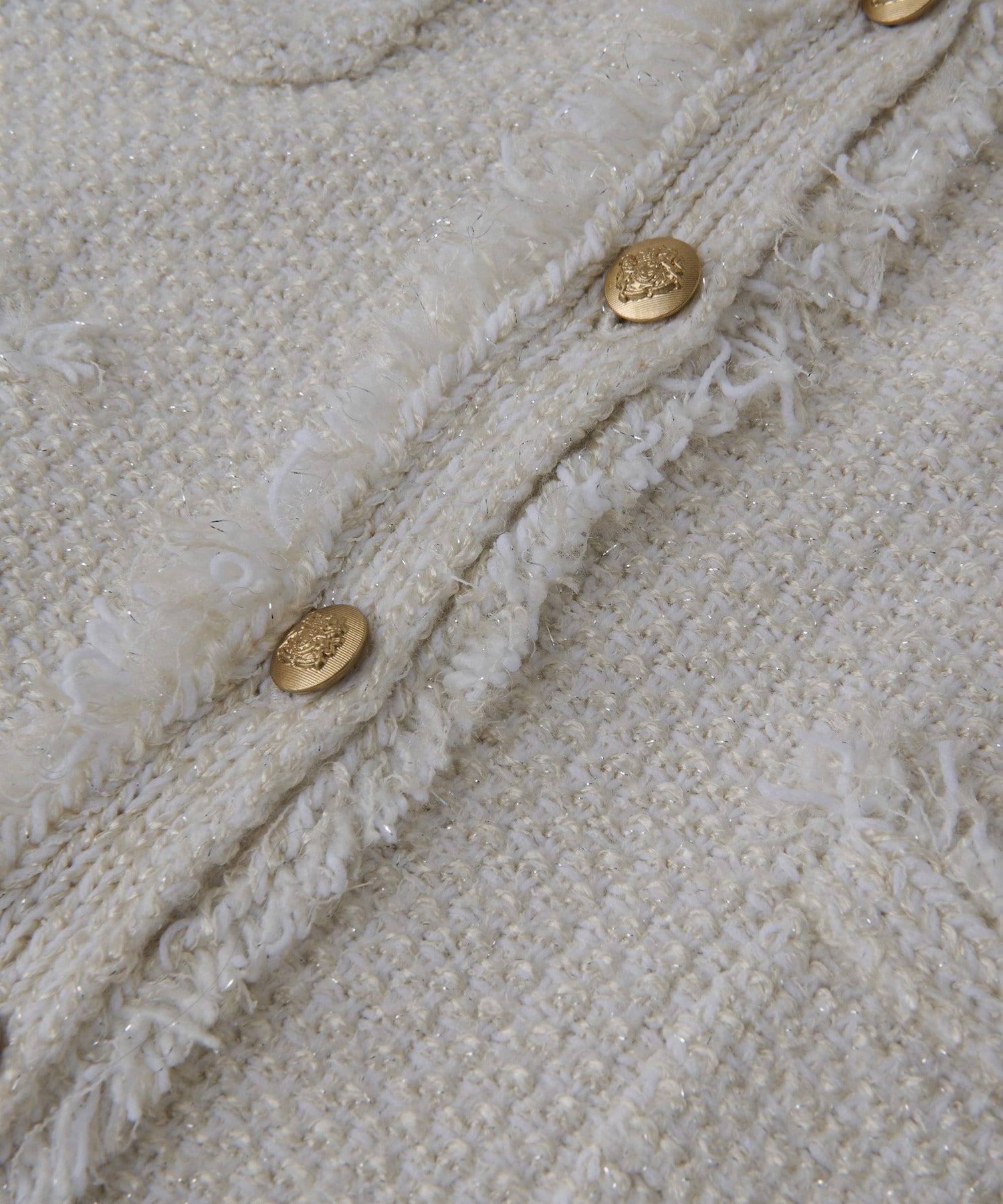 金ボタンとツイード生地の風合いが高級感のある1枚です。