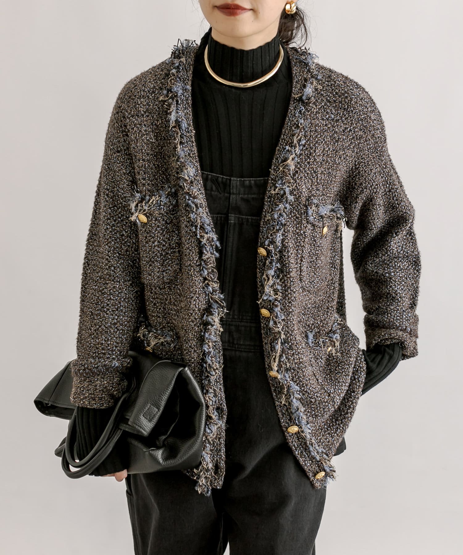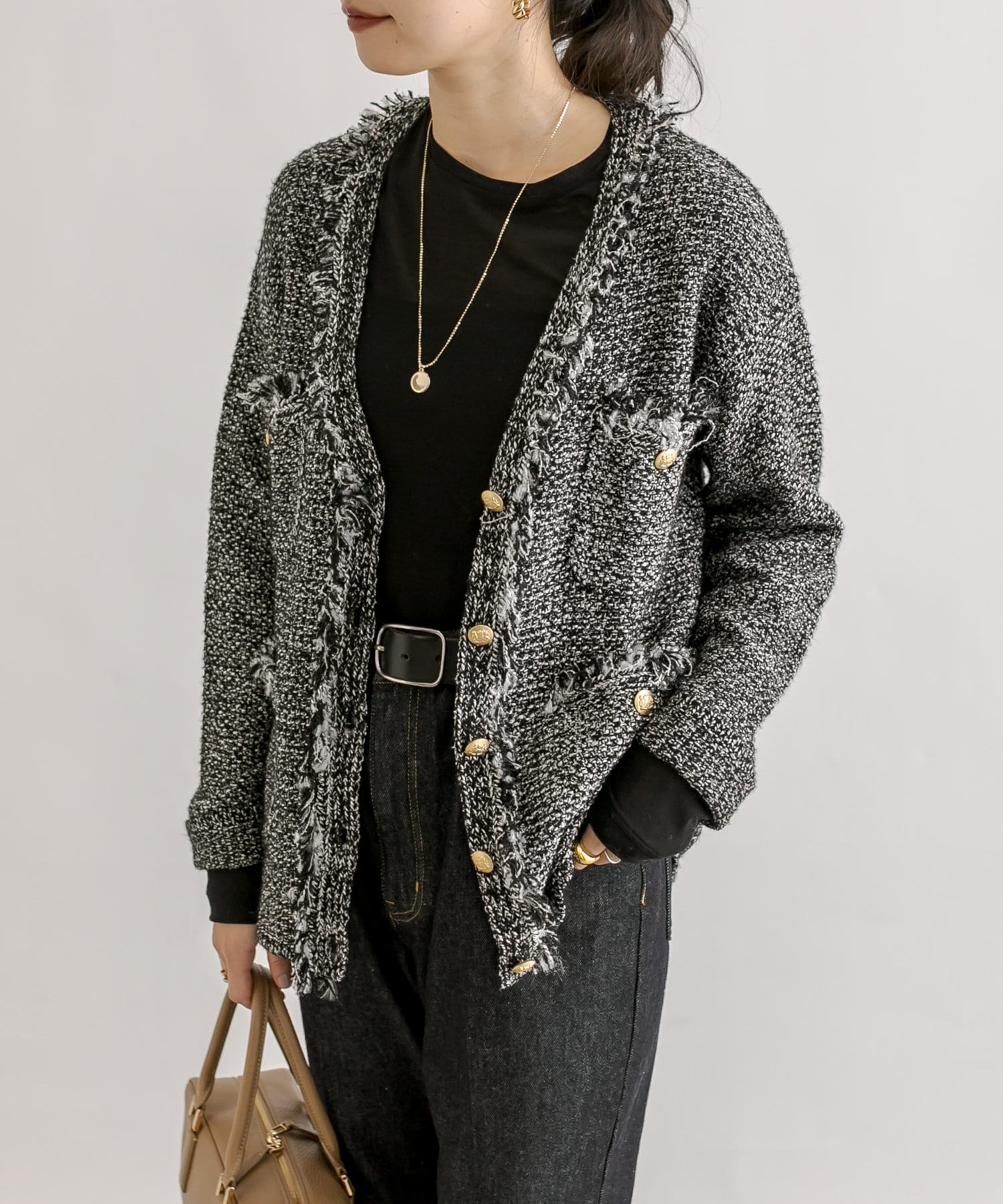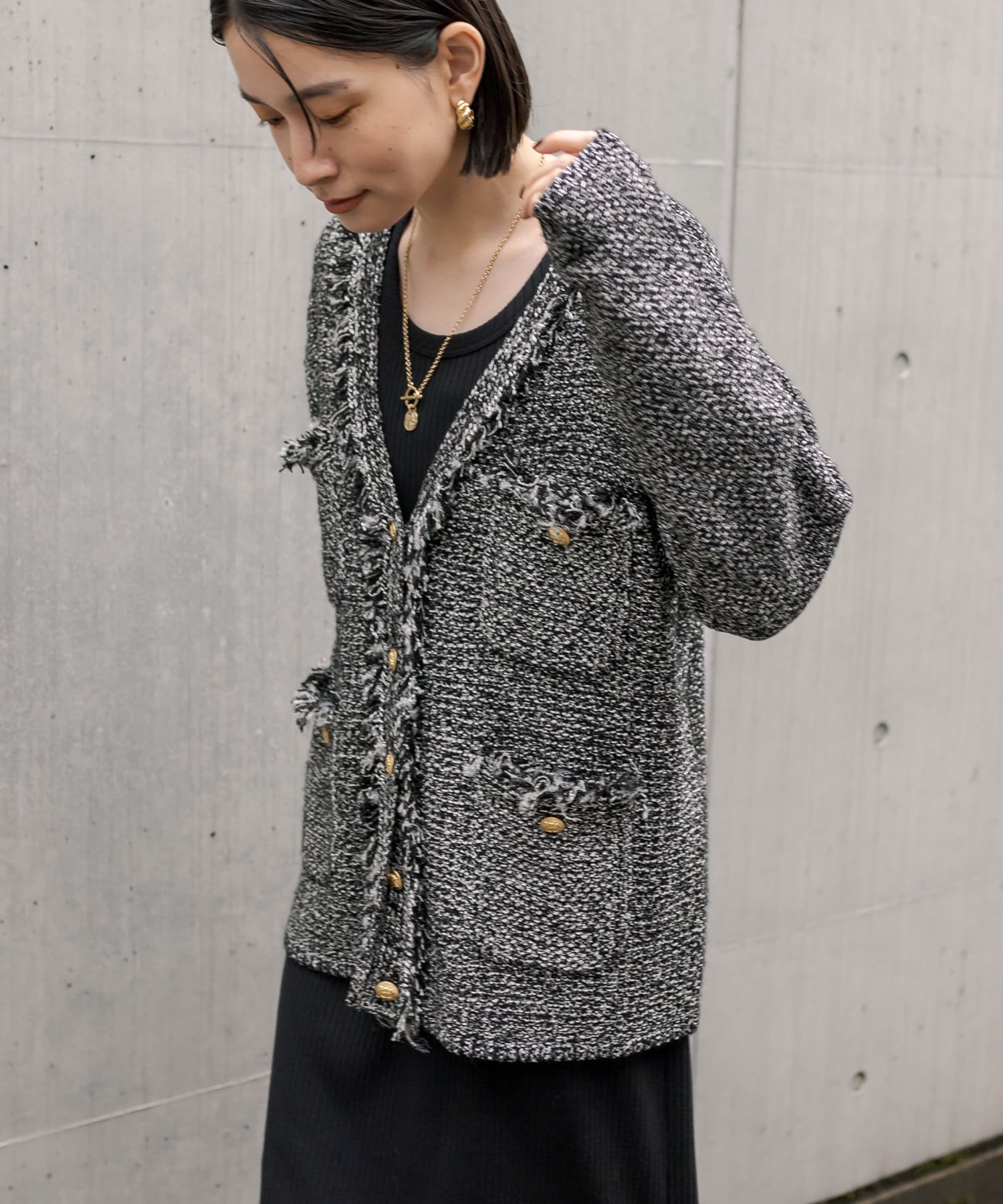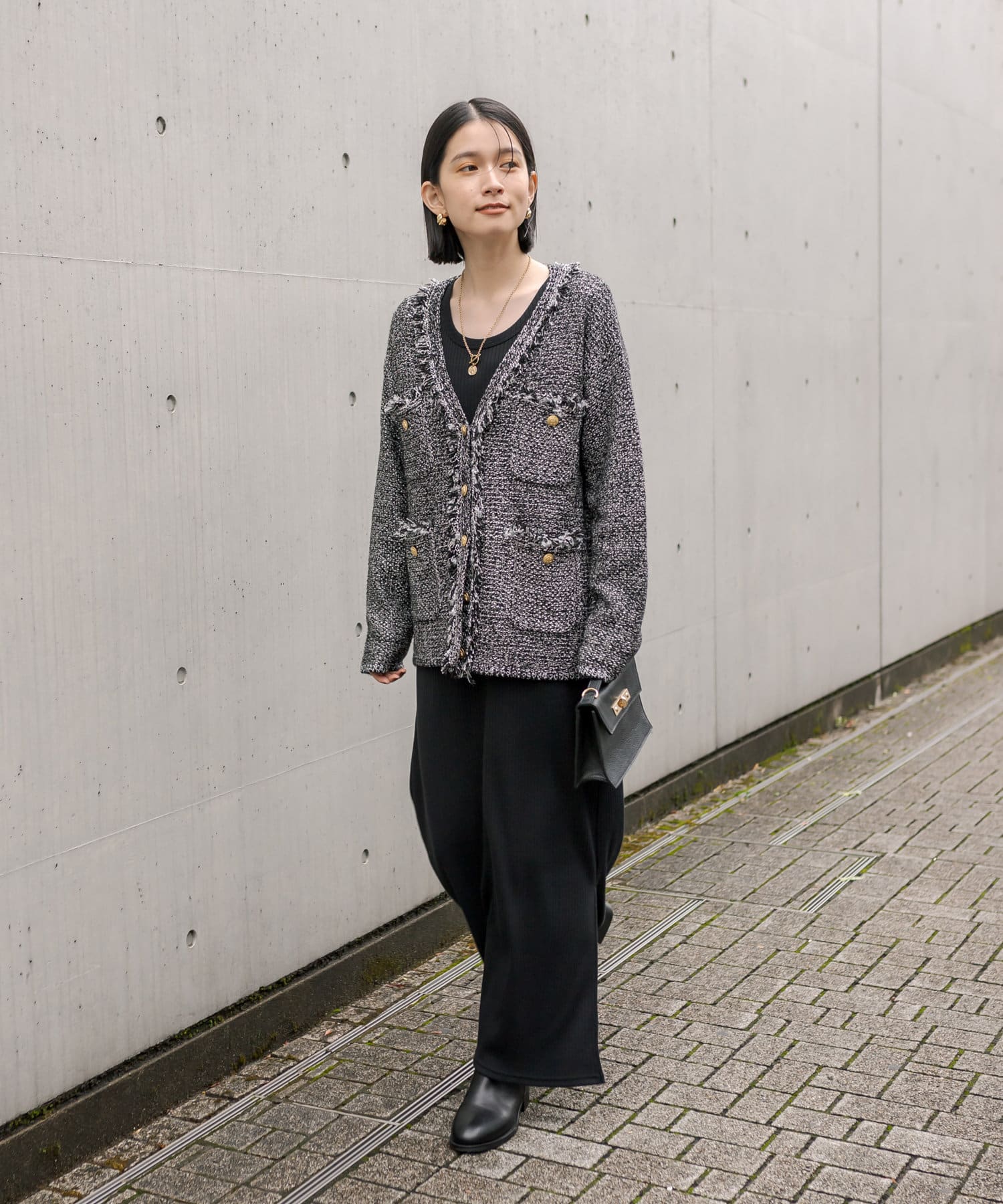 金ボタンとツイード生地の風合いが高級感のある1枚です。