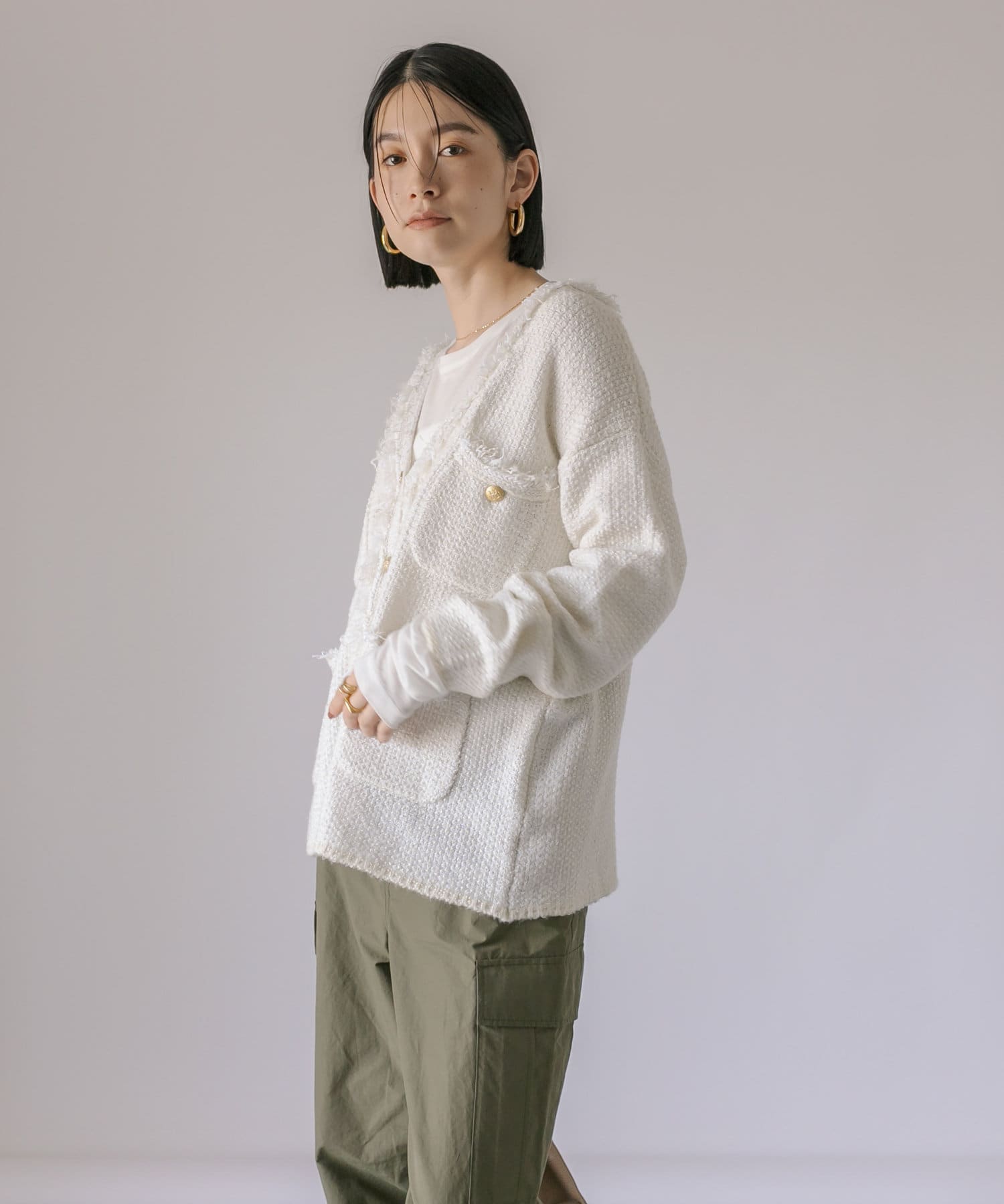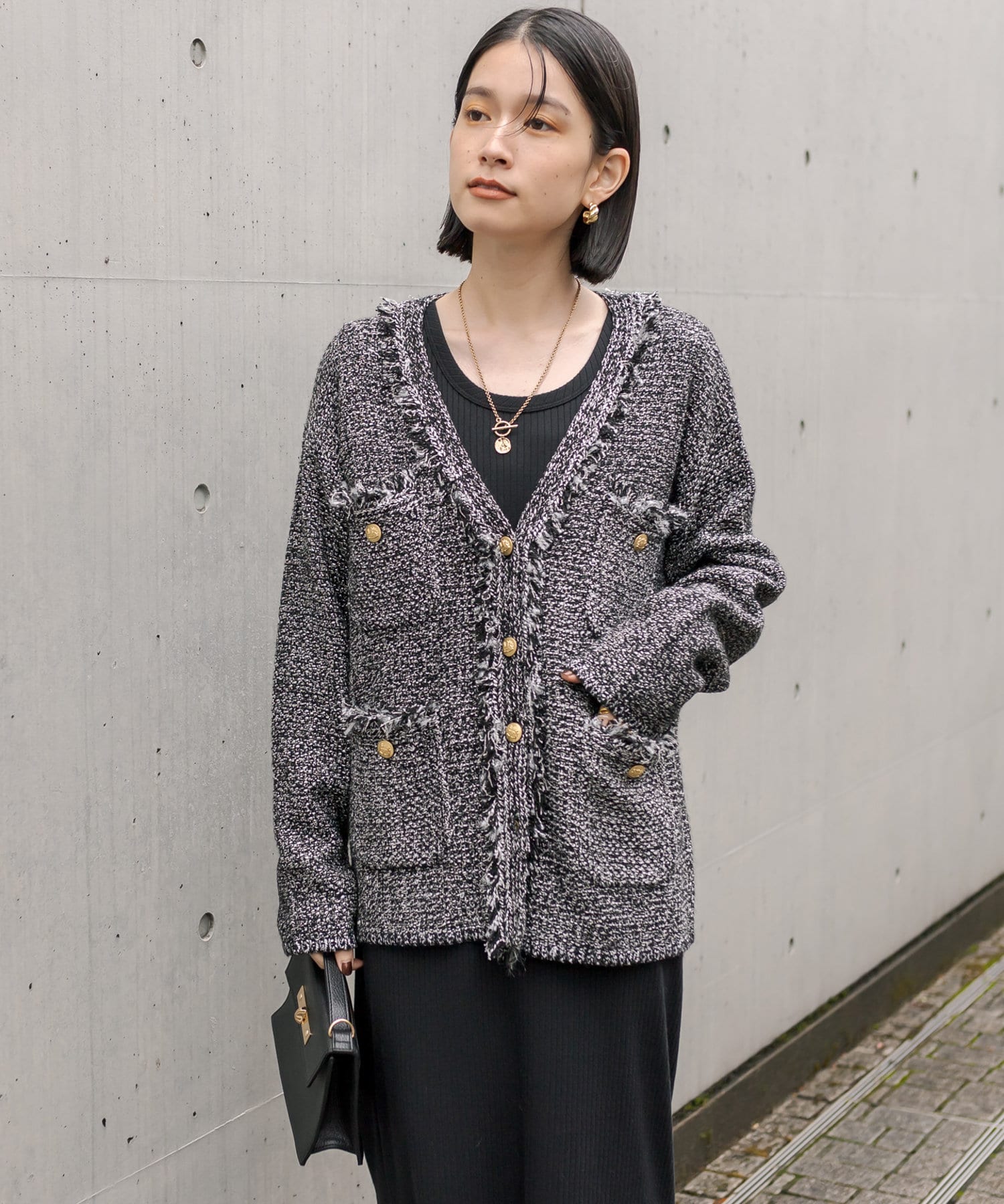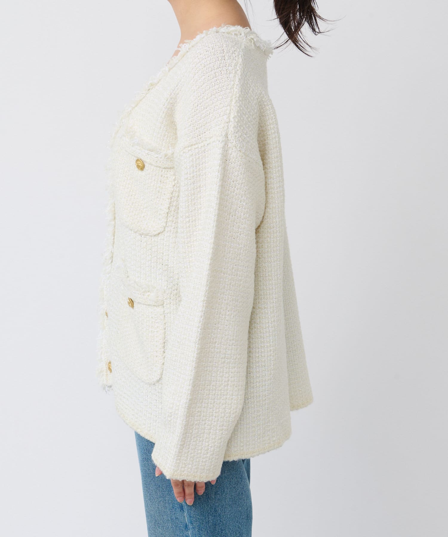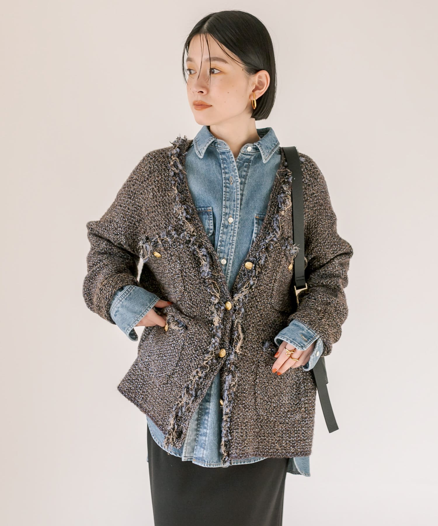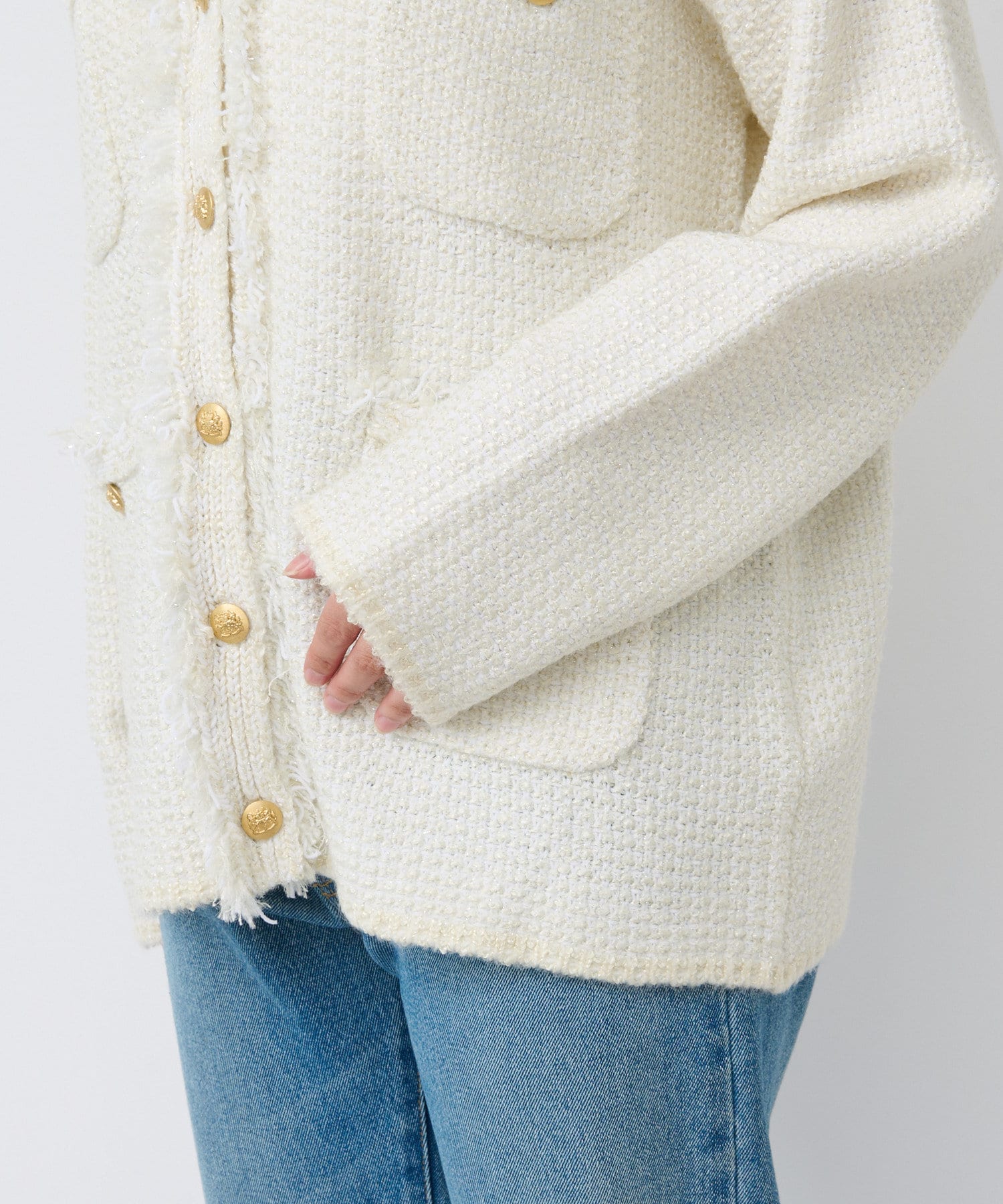 金ボタンとツイード生地の風合いが高級感のある1枚です。