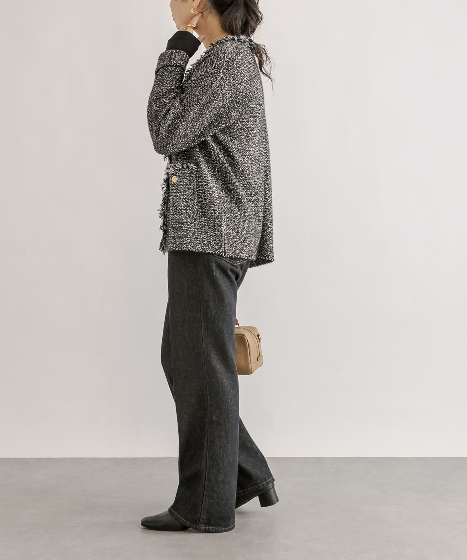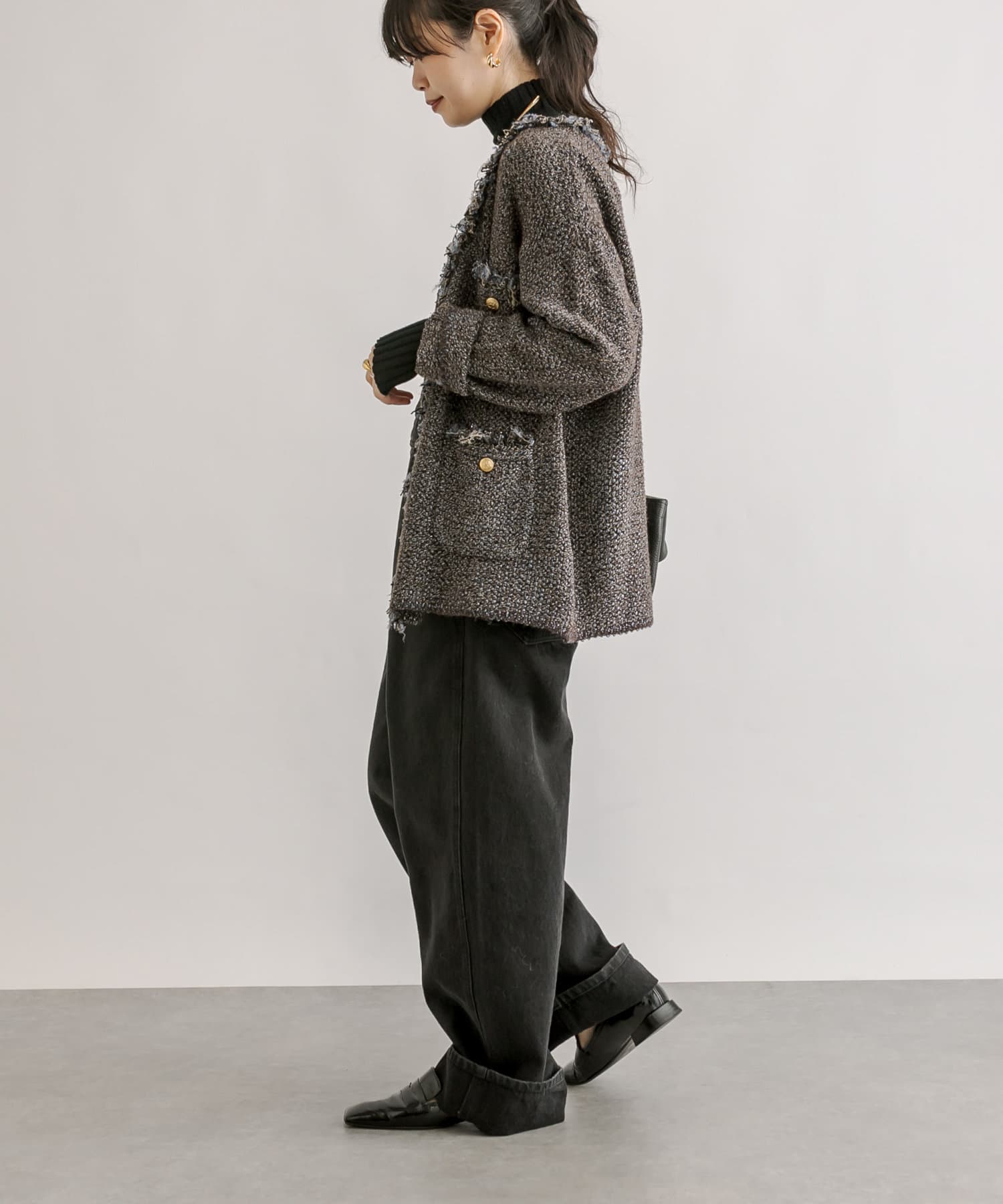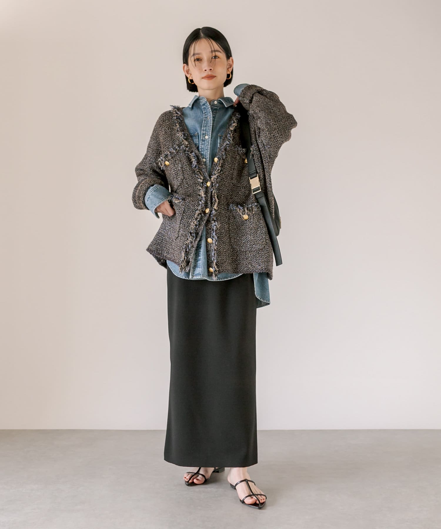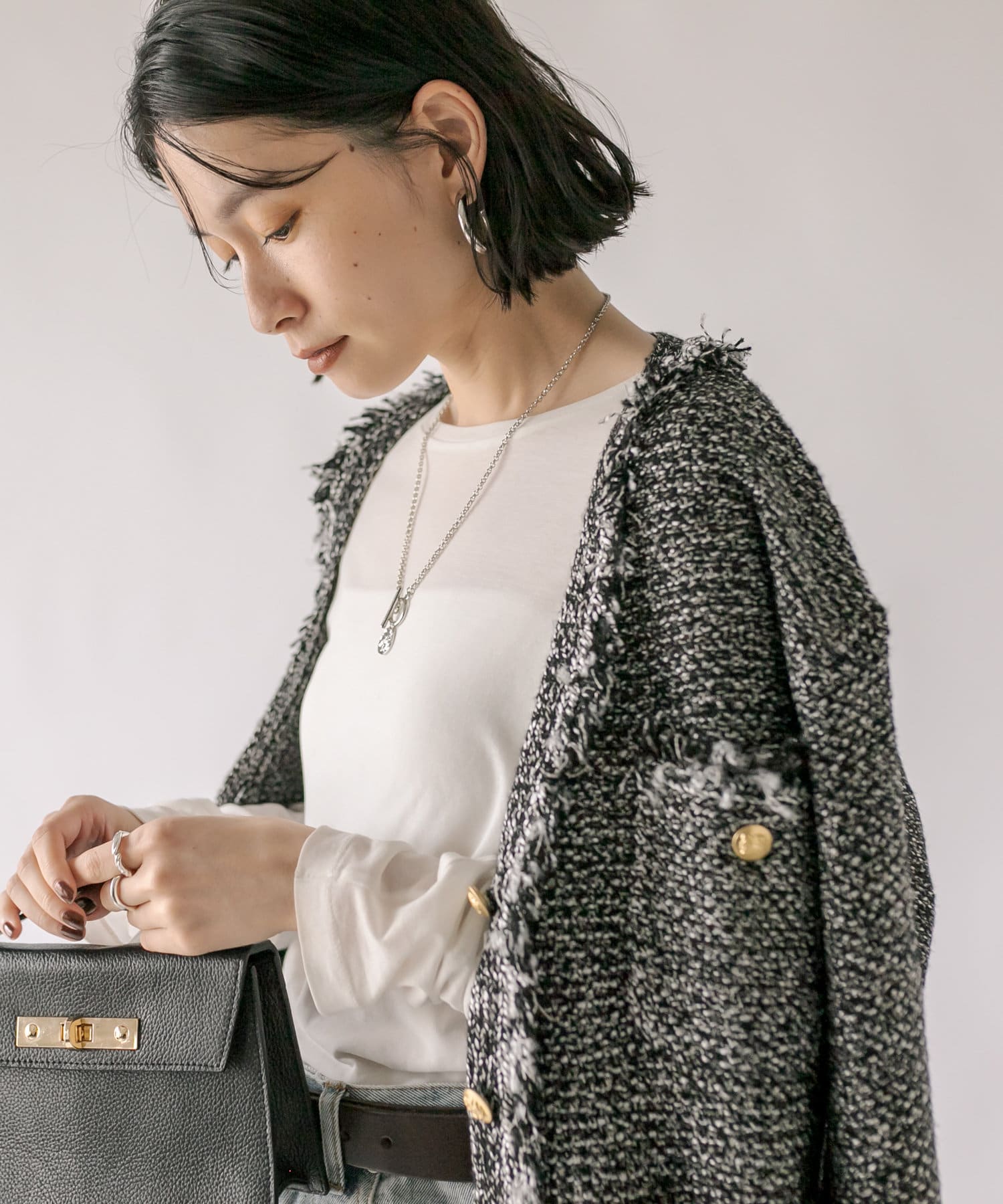 金ボタンとツイード生地の風合いが高級感のある1枚です。