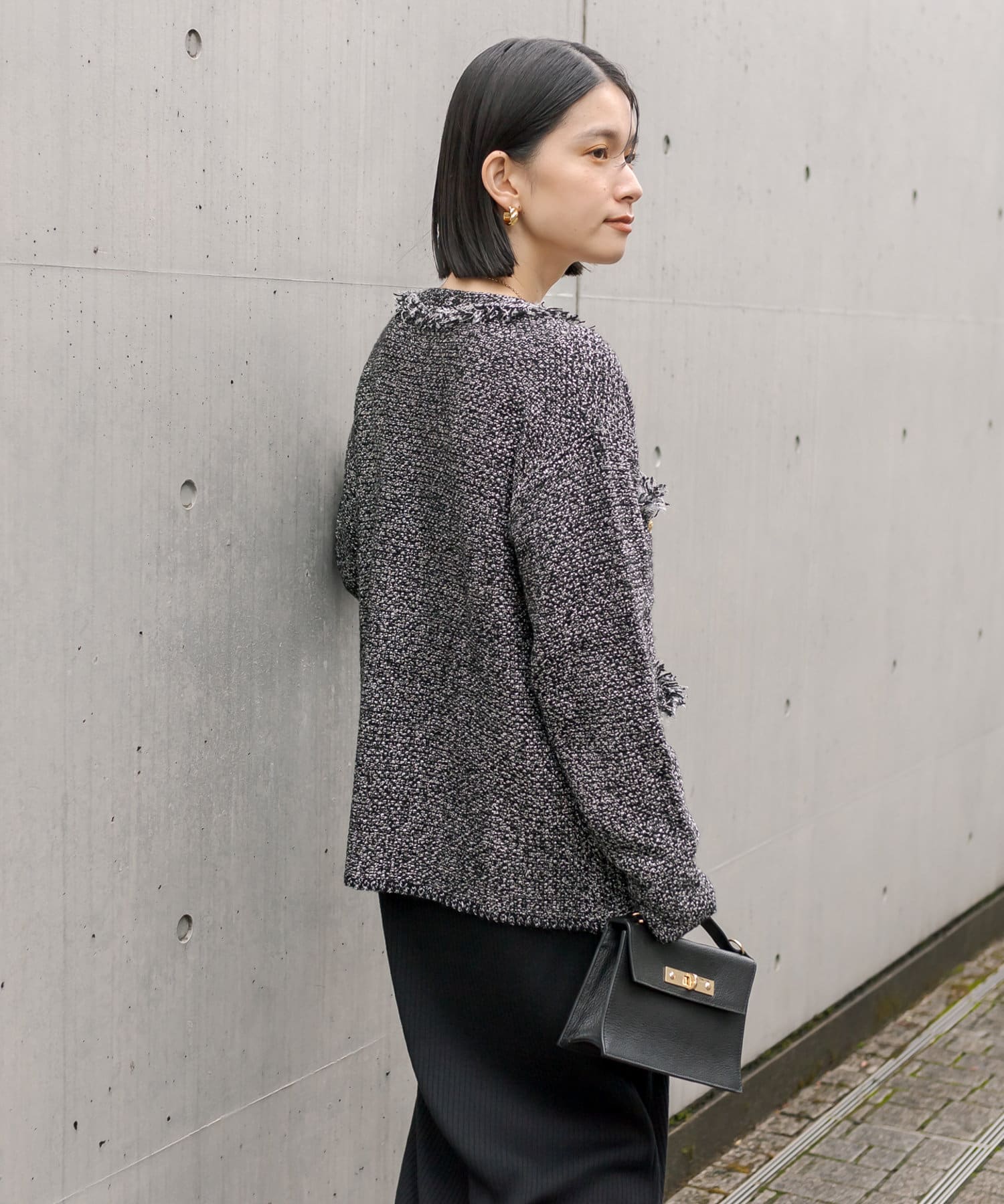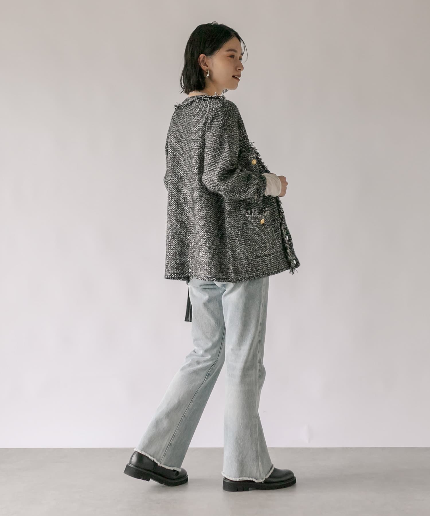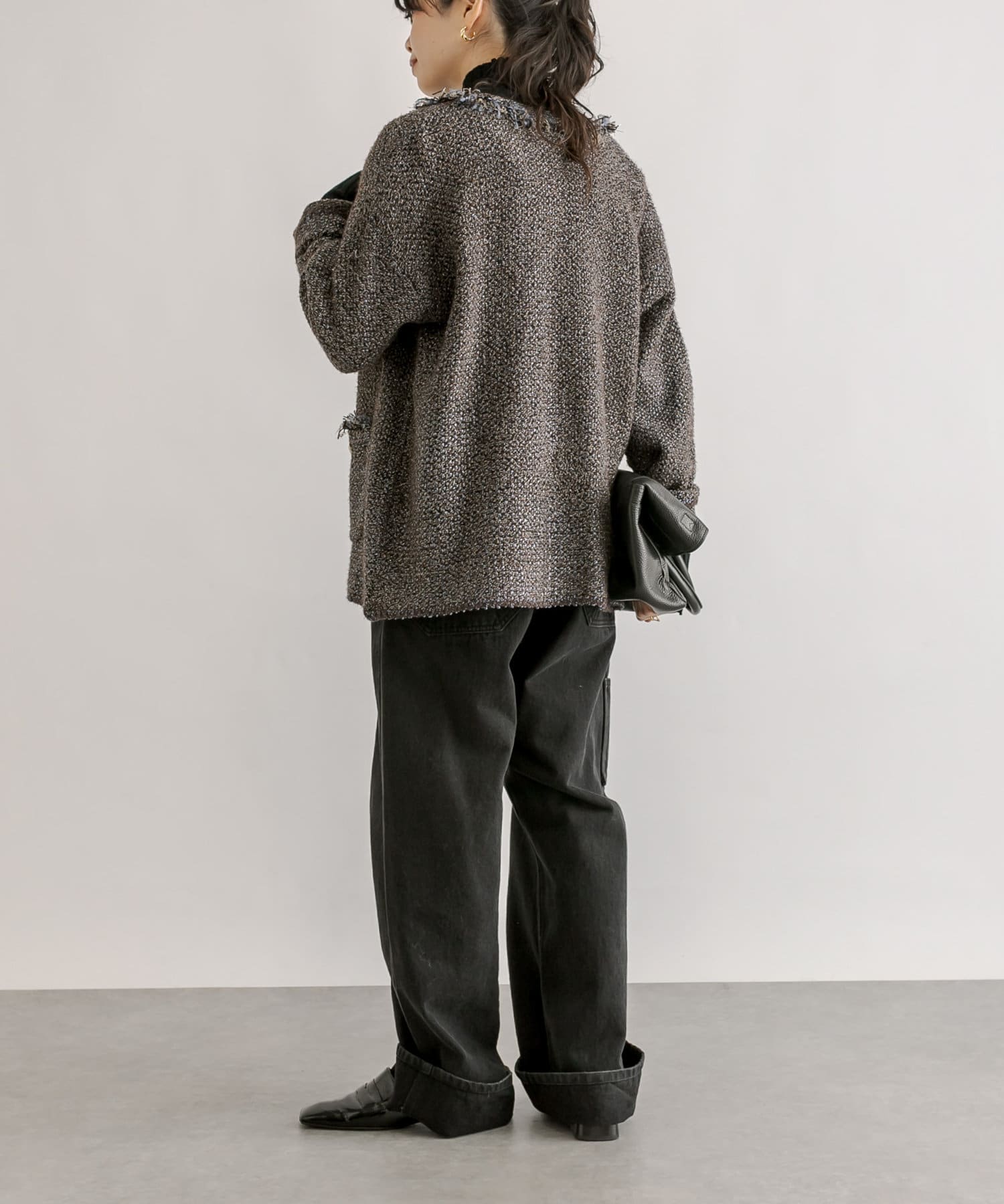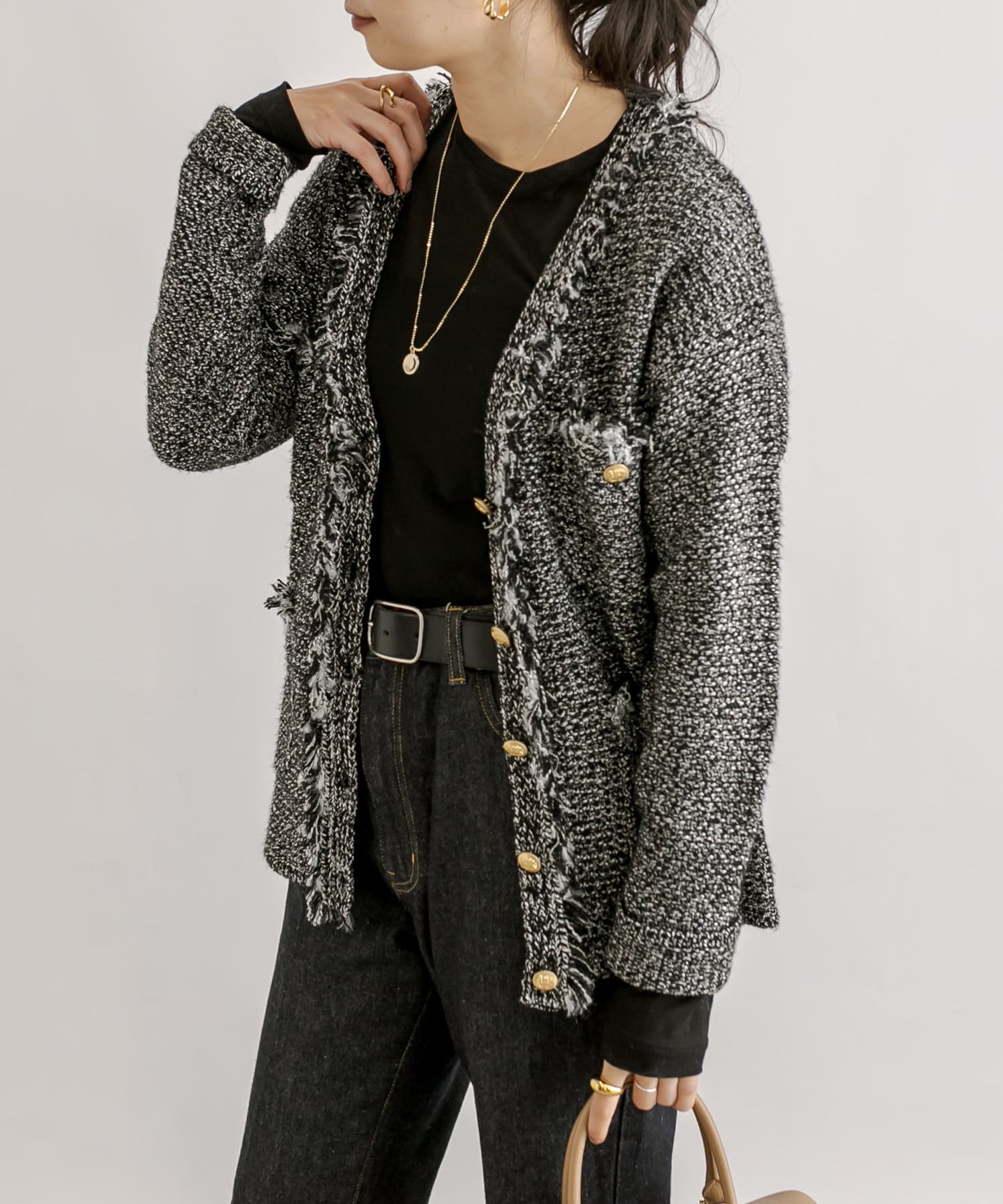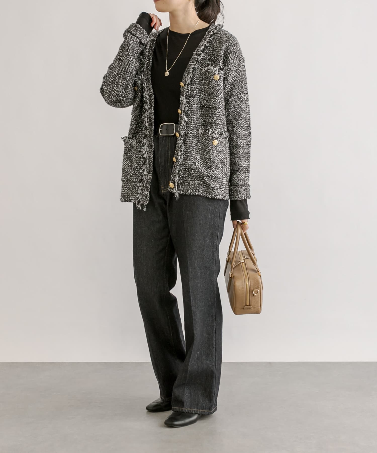 金ボタンとツイード生地の風合いが高級感のある1枚です。