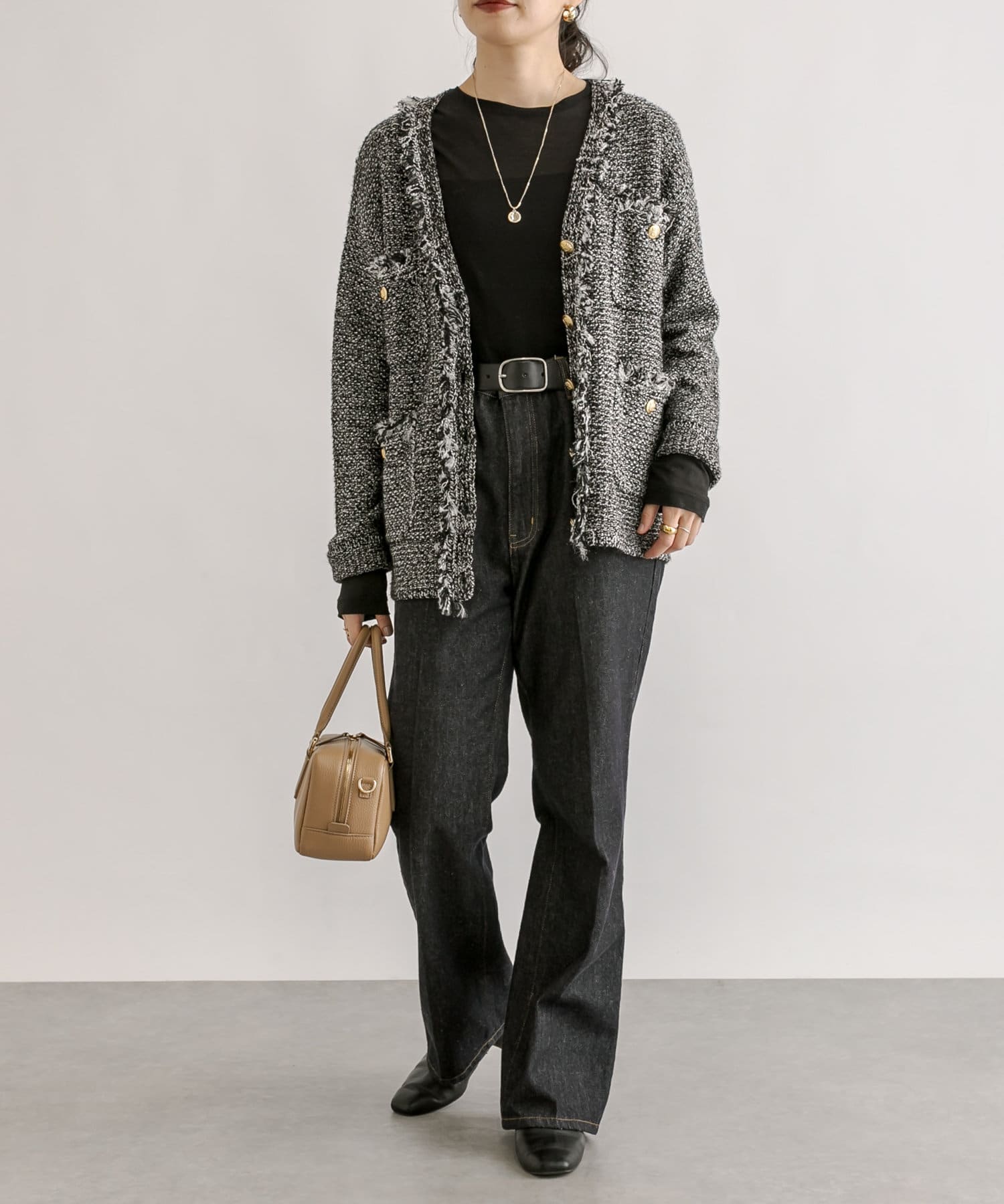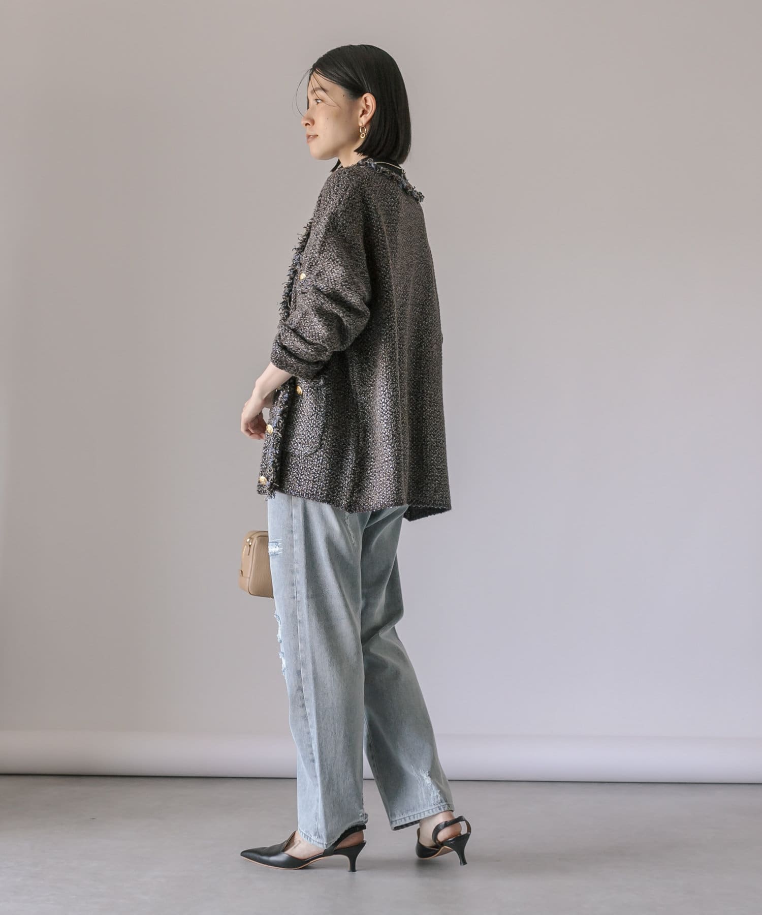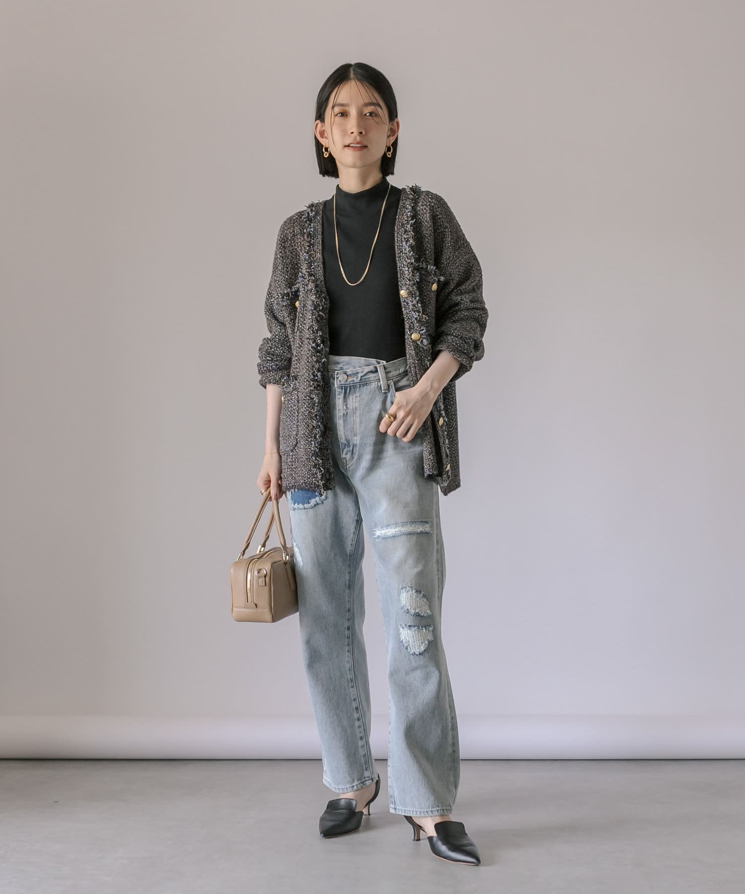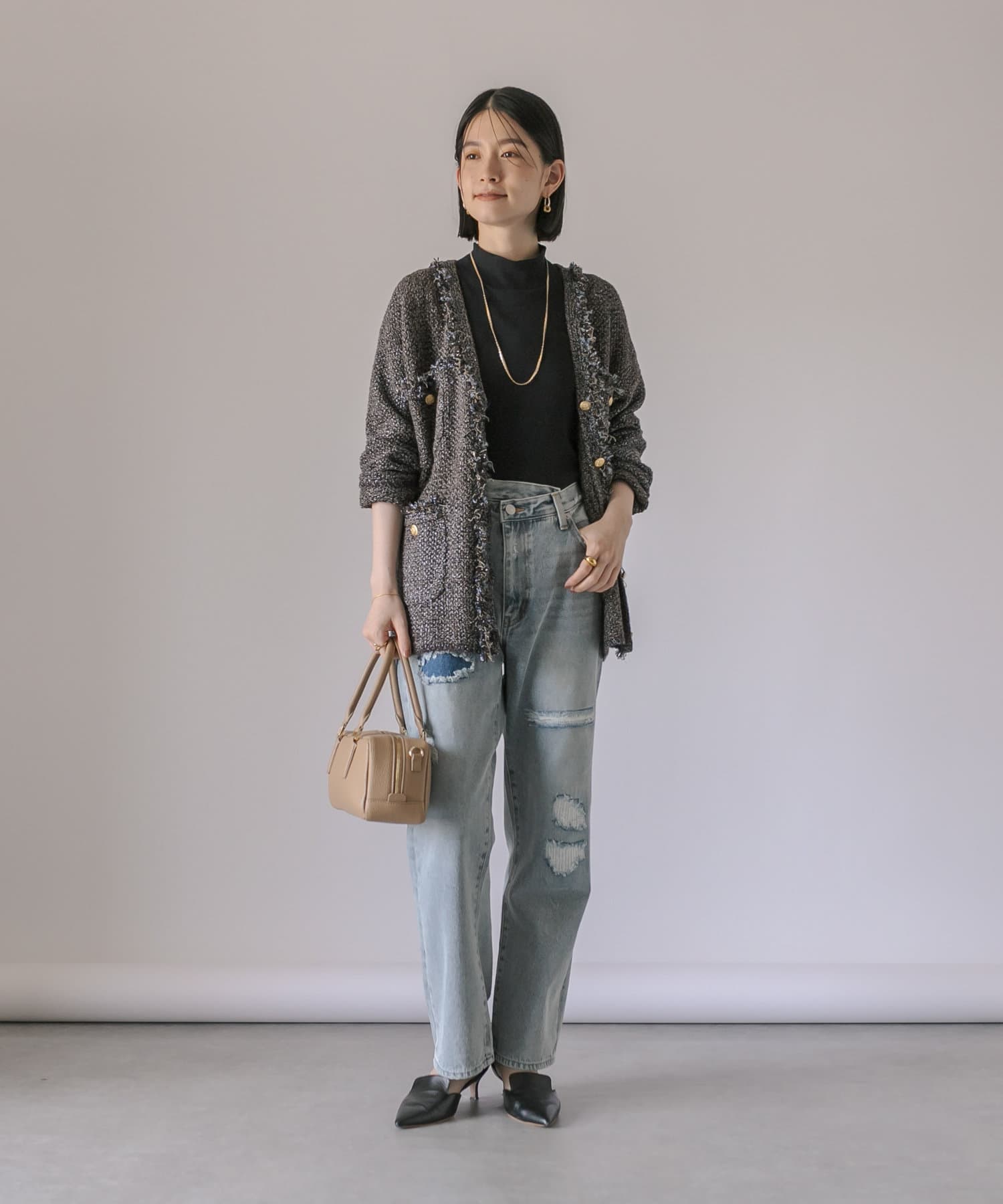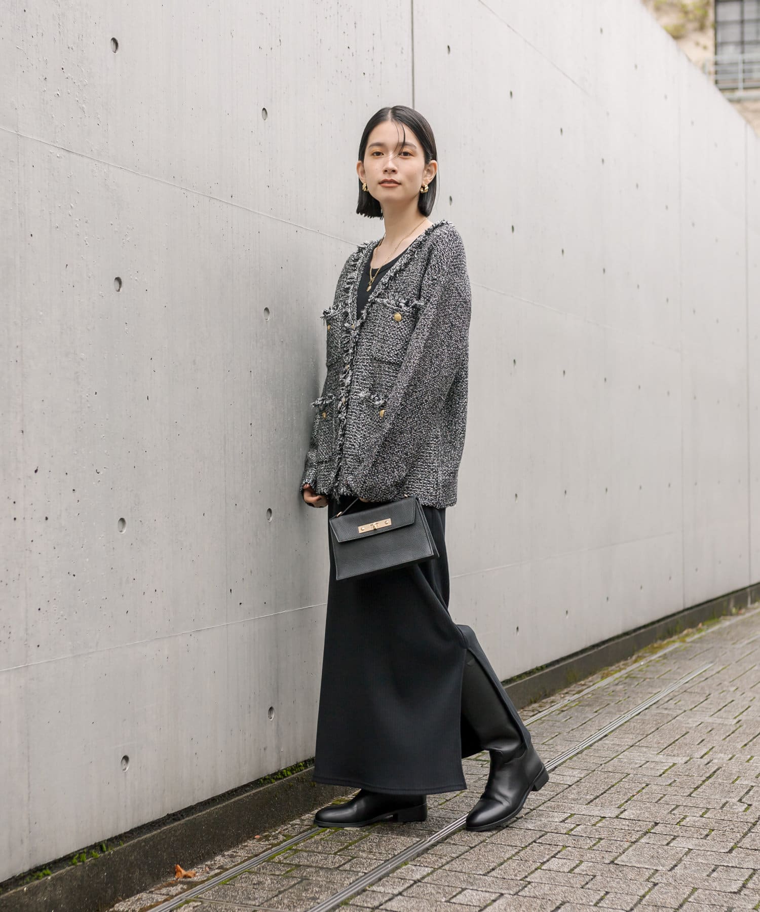 金ボタンとツイード生地の風合いが高級感のある1枚です。