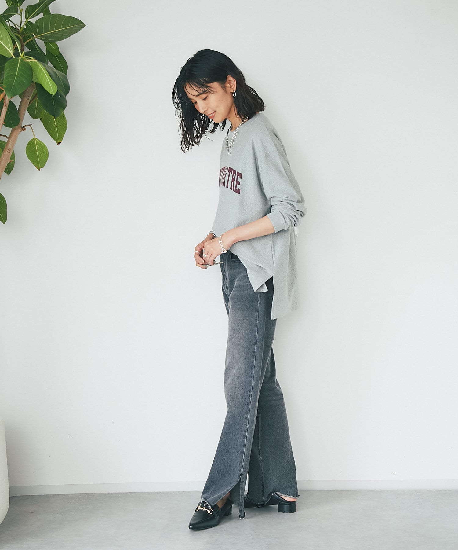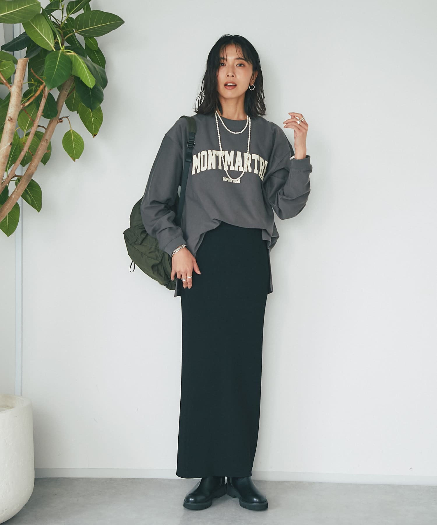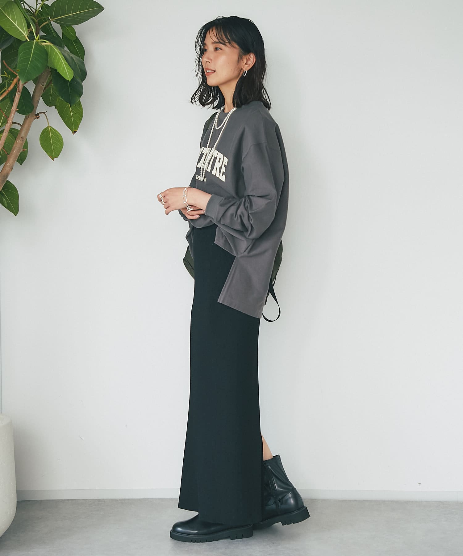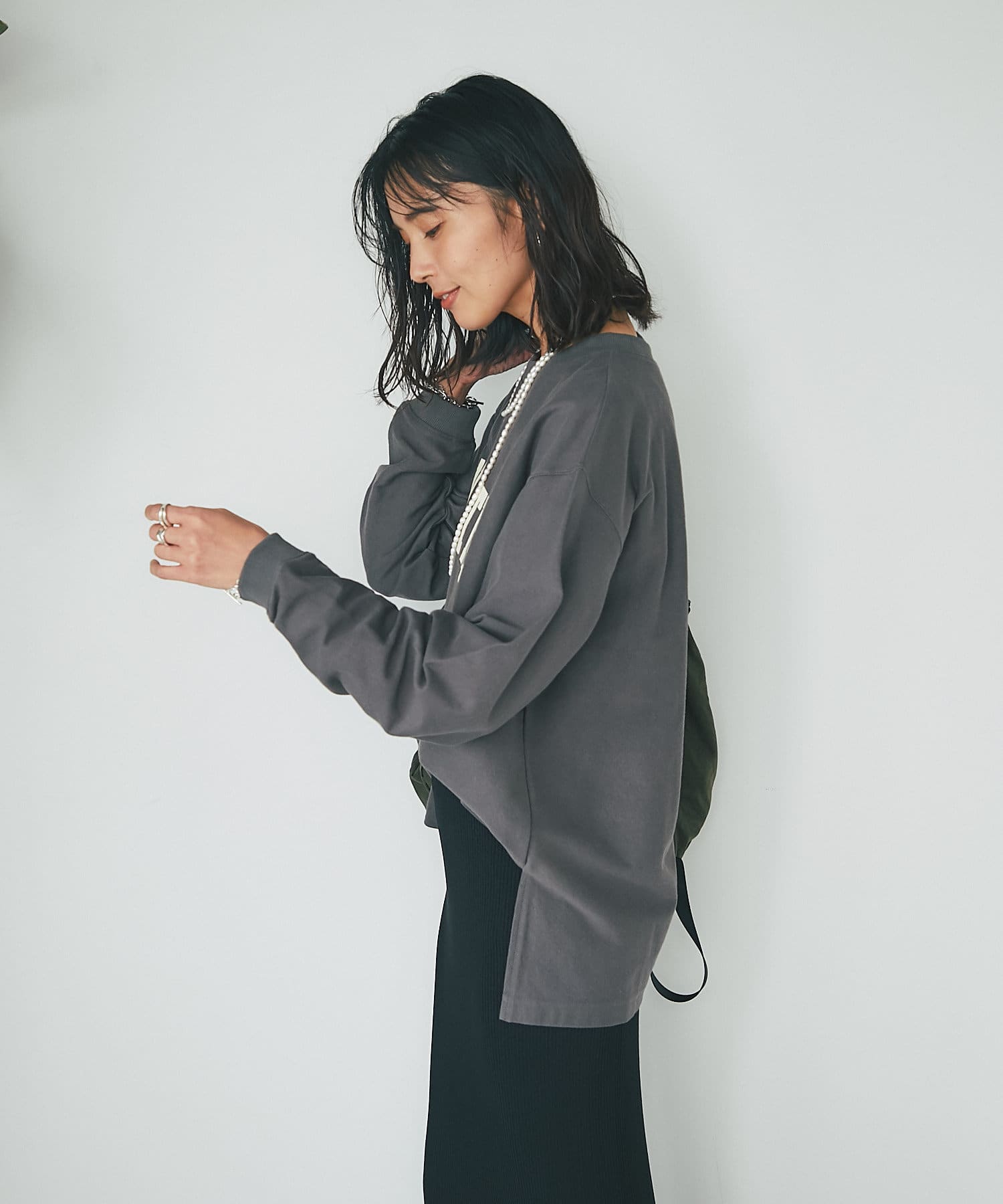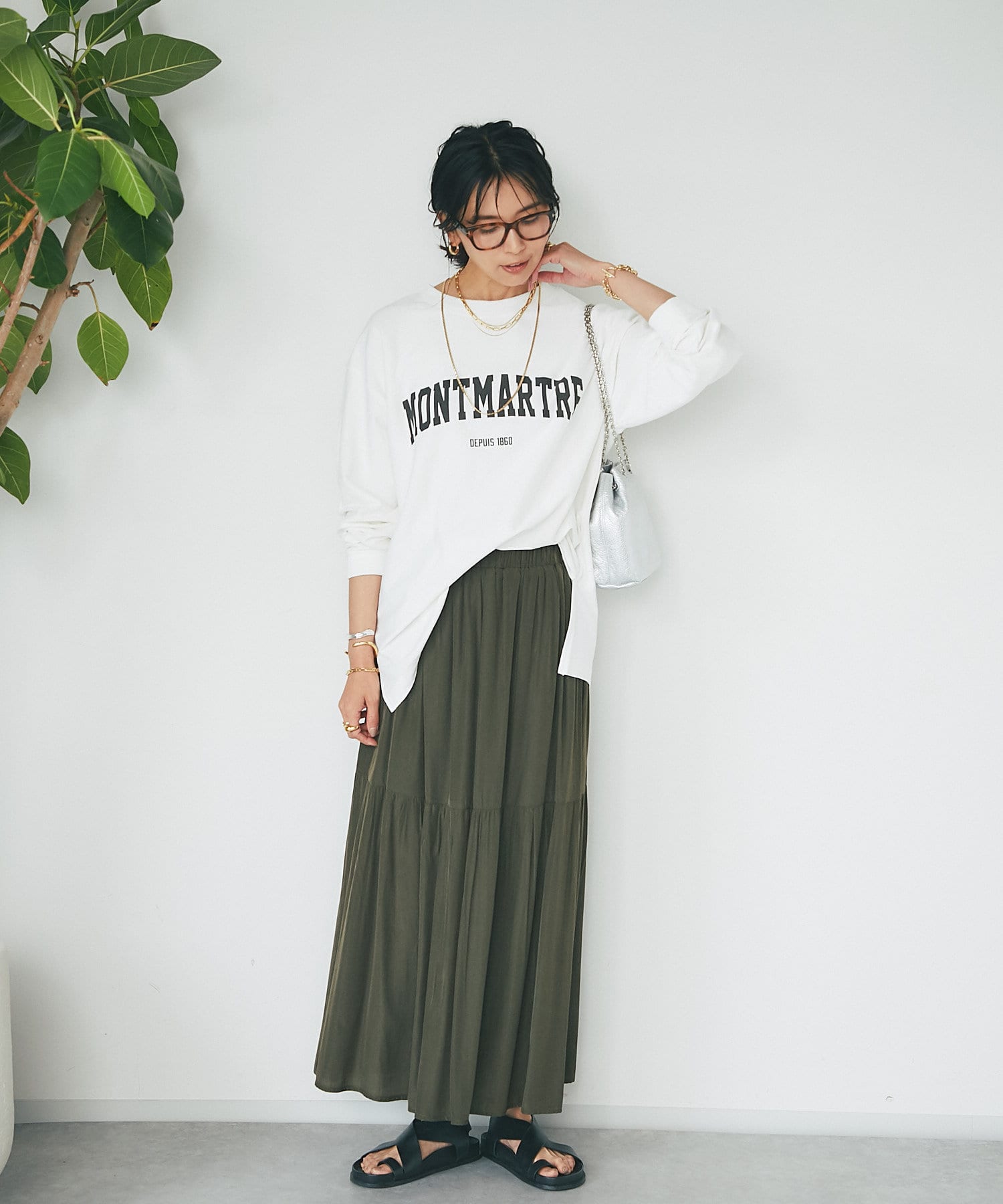 ゆったりとしたサイズ感のカジュアルなロングTシャツは、レディライクなアイテムも甘くなりすぎず着れる便利なアイテム。