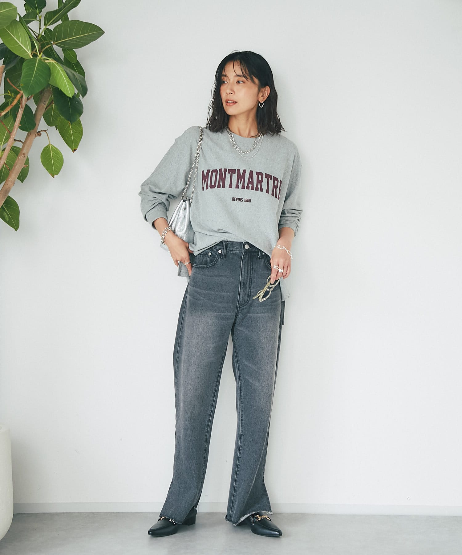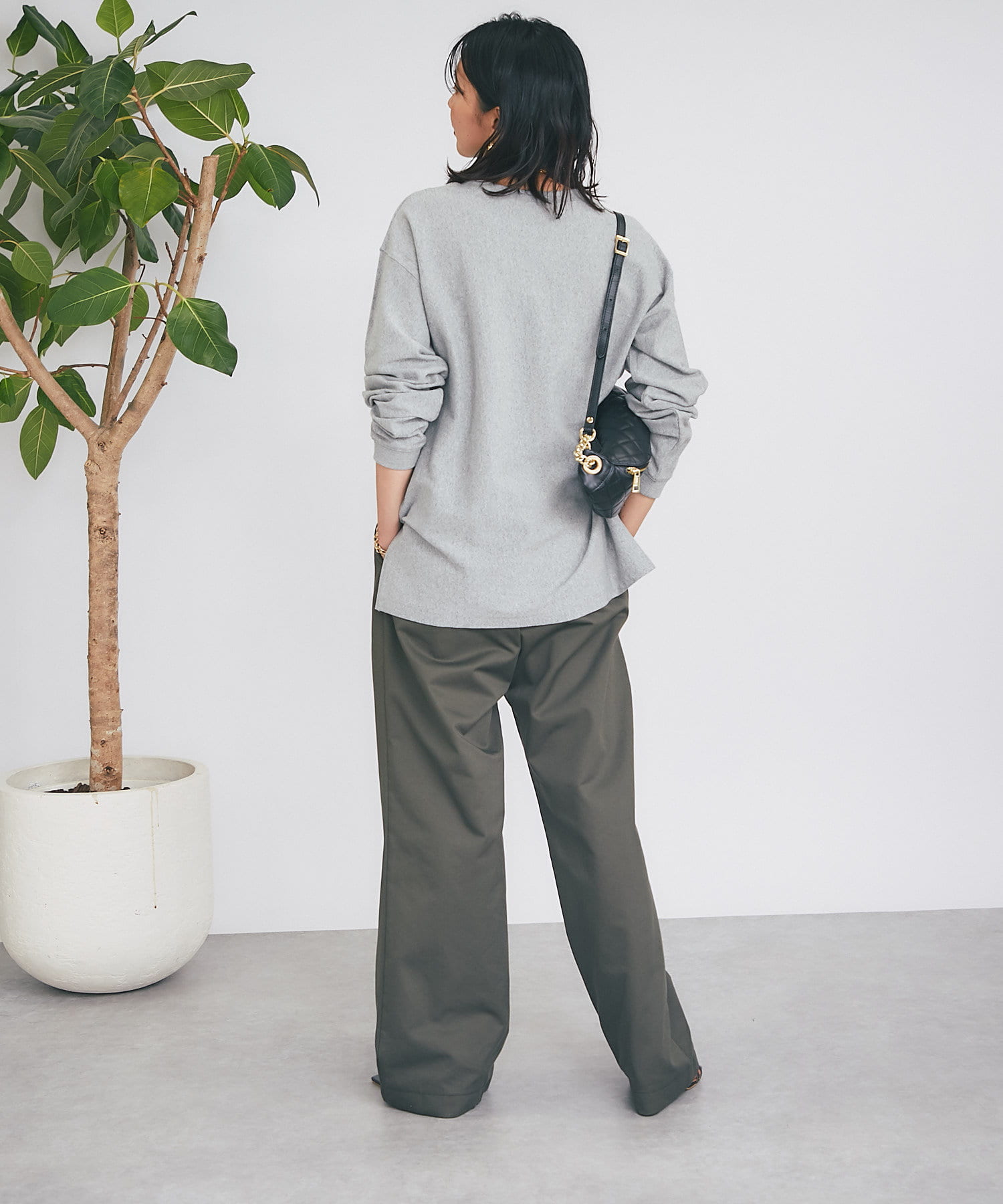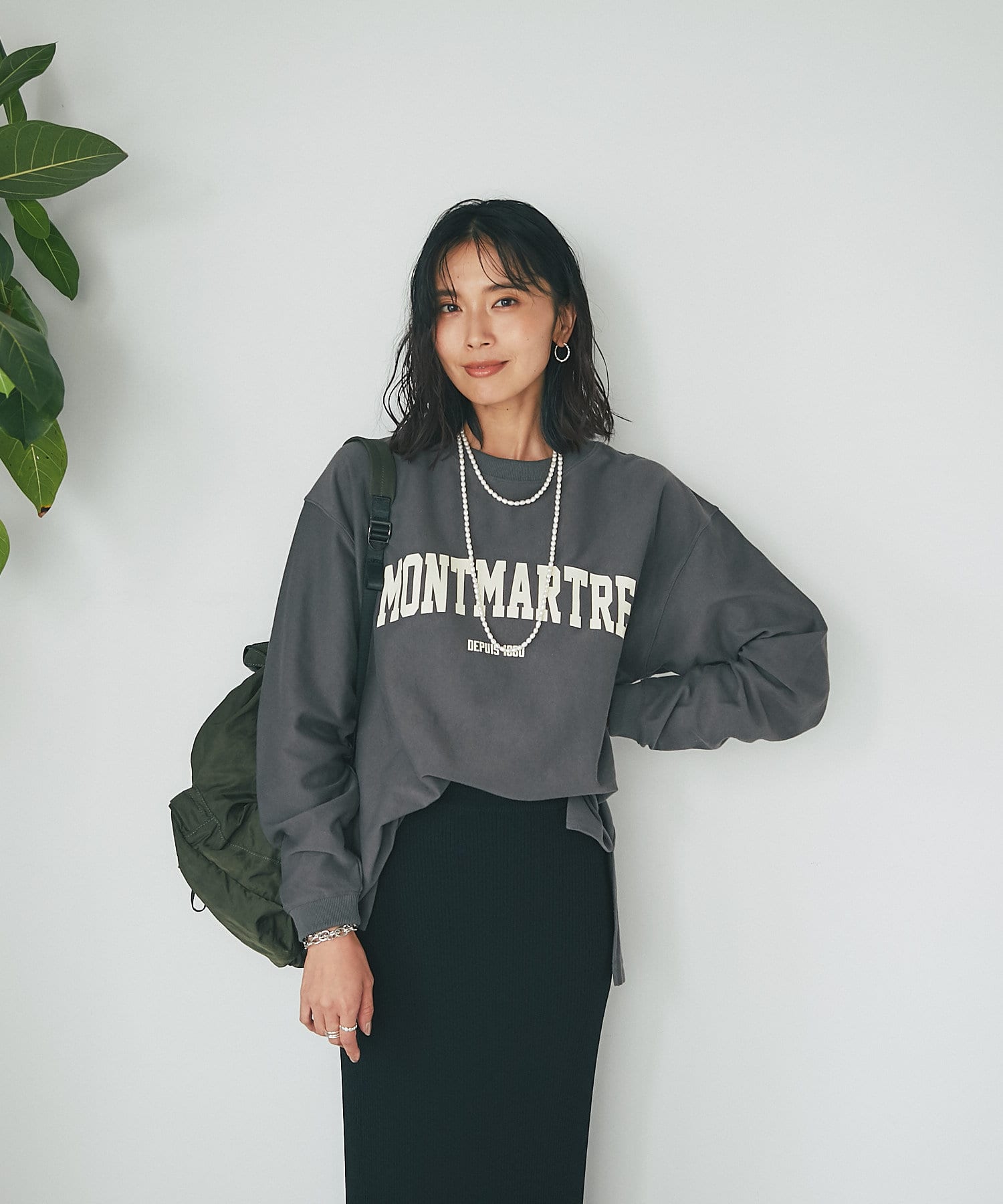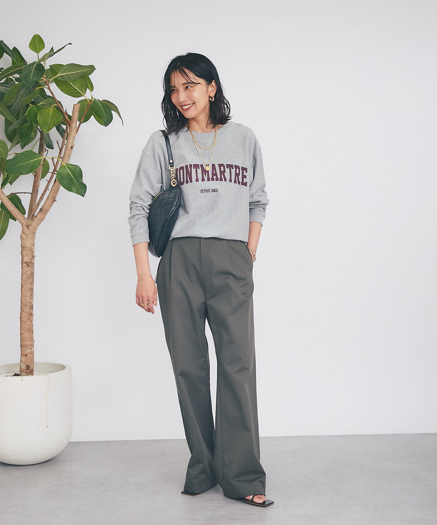 ゆったりとしたサイズ感のカジュアルなロングTシャツは、レディライクなアイテムも甘くなりすぎず着れる便利なアイテム。