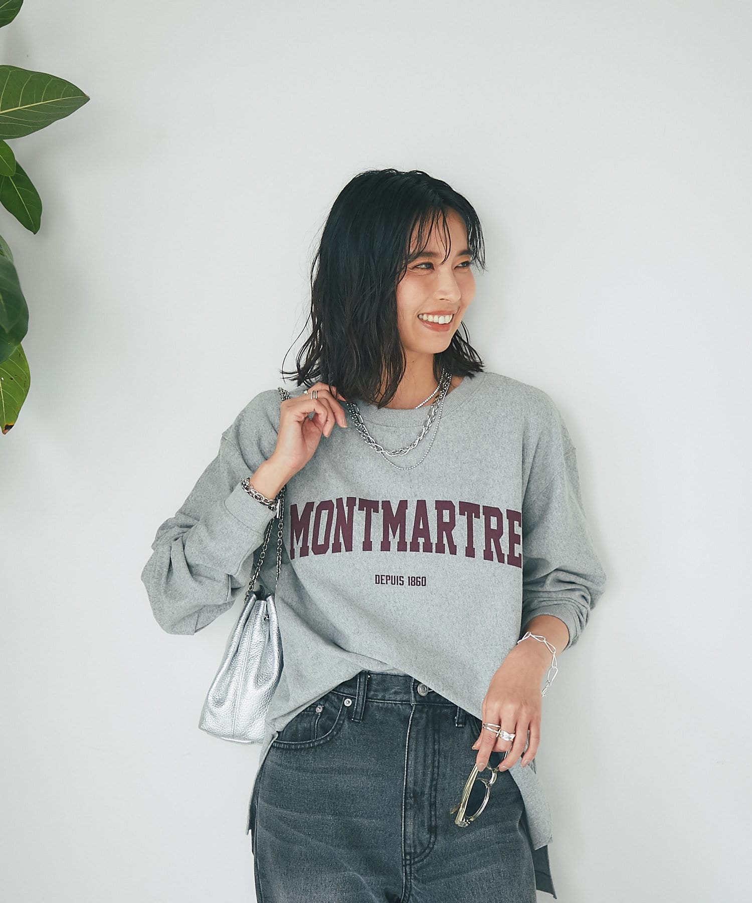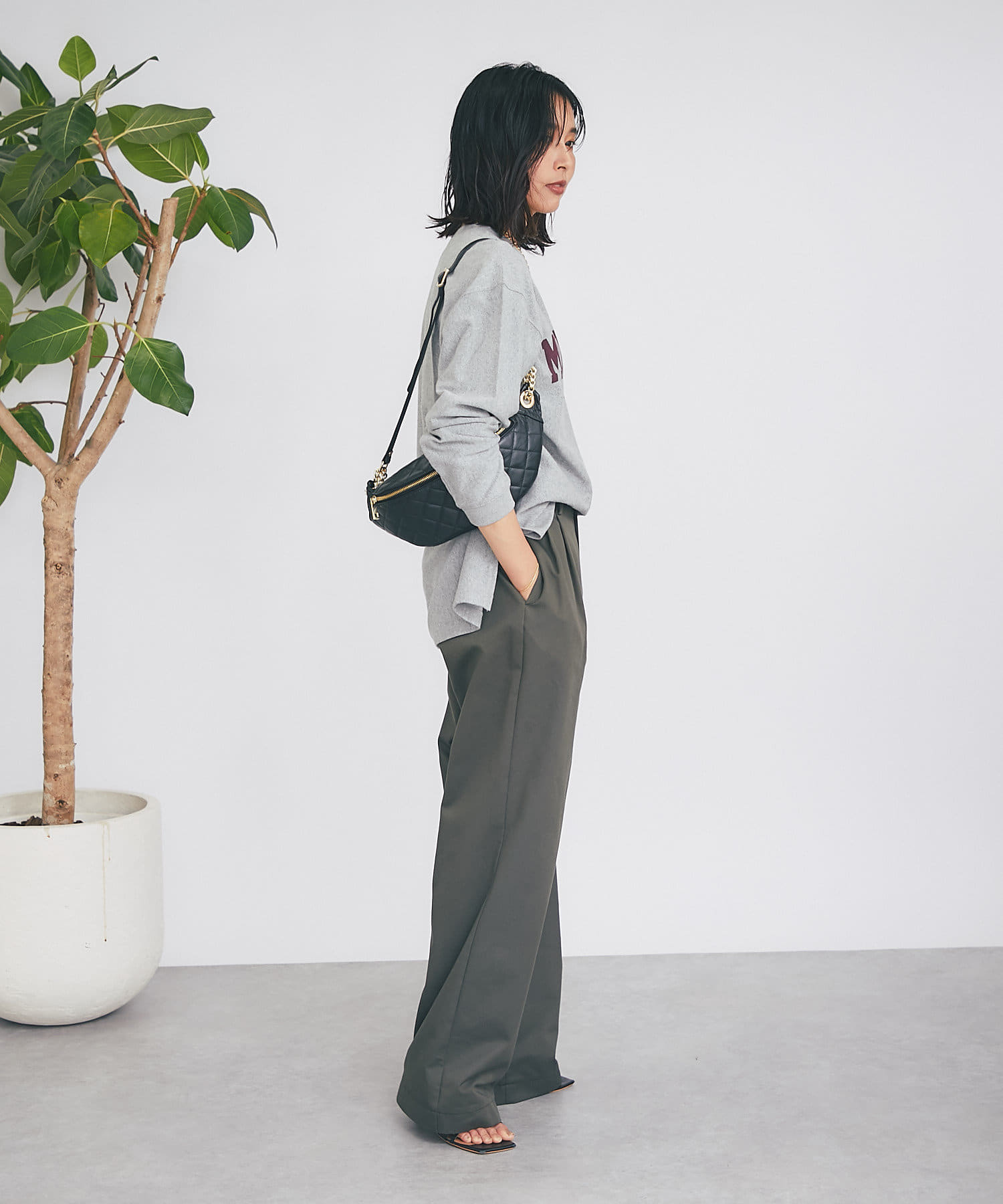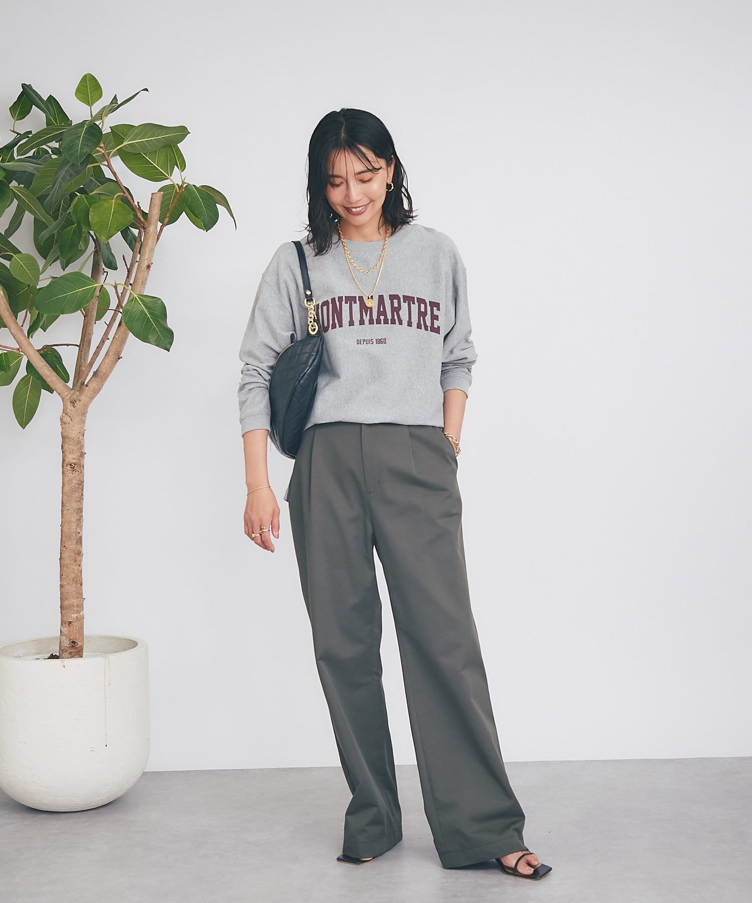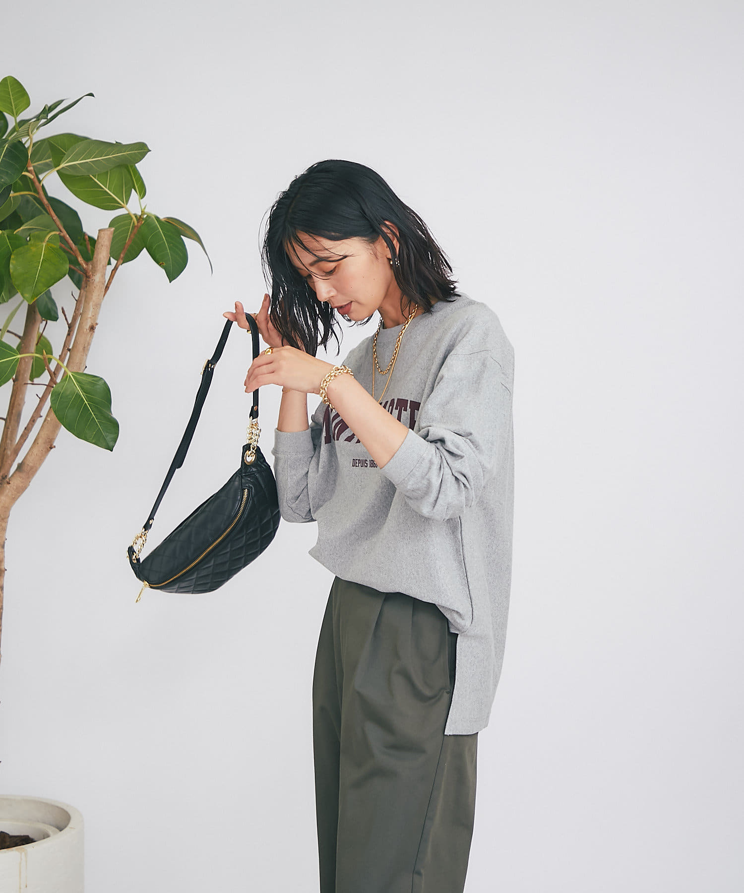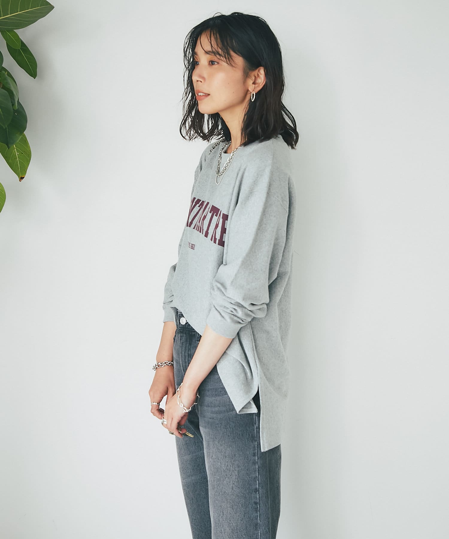 ゆったりとしたサイズ感のカジュアルなロングTシャツは、レディライクなアイテムも甘くなりすぎず着れる便利なアイテム。