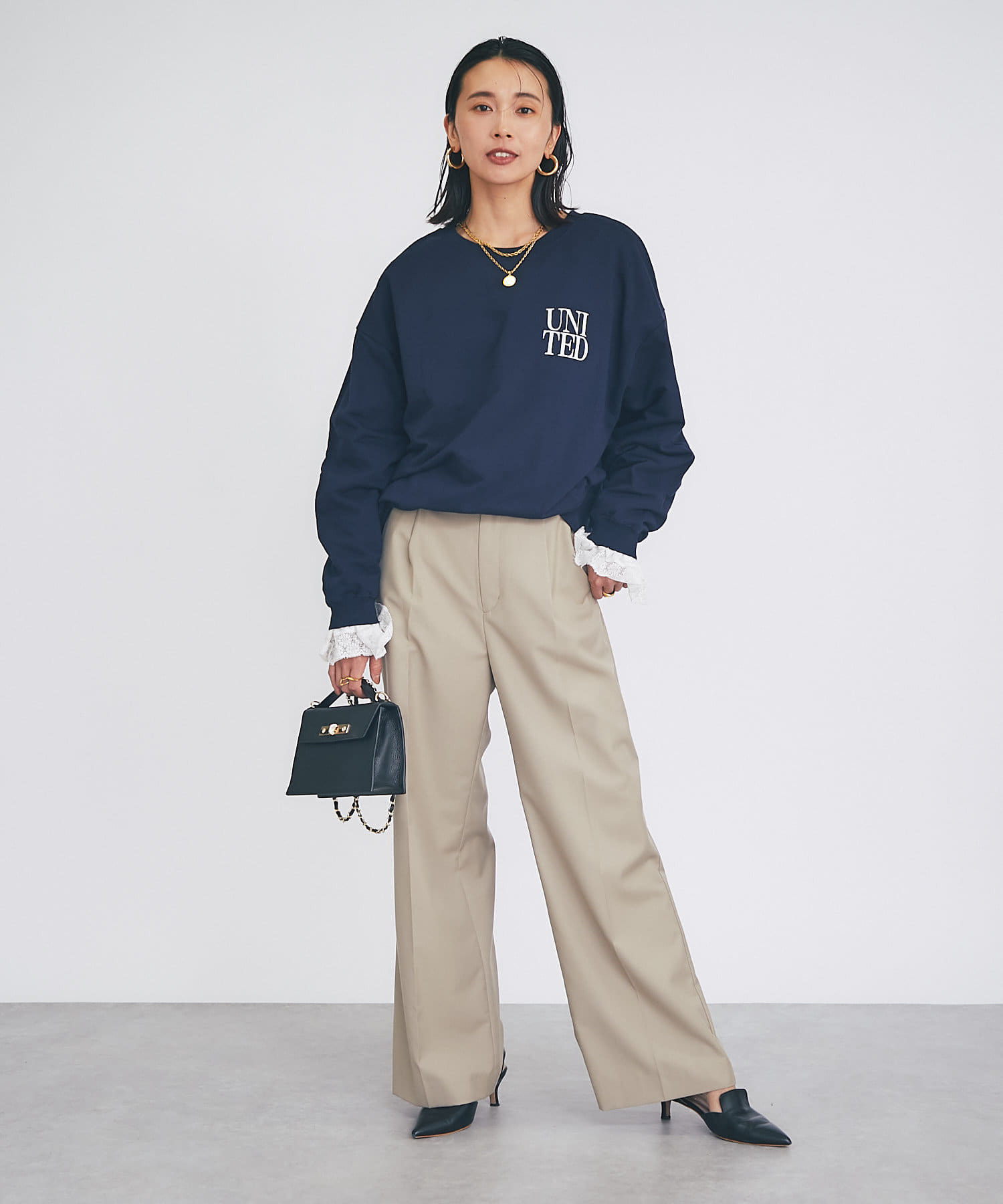デニムなどはもちろん、女性らしい雰囲気のスカートやワンピースなどに合わせても素敵です。