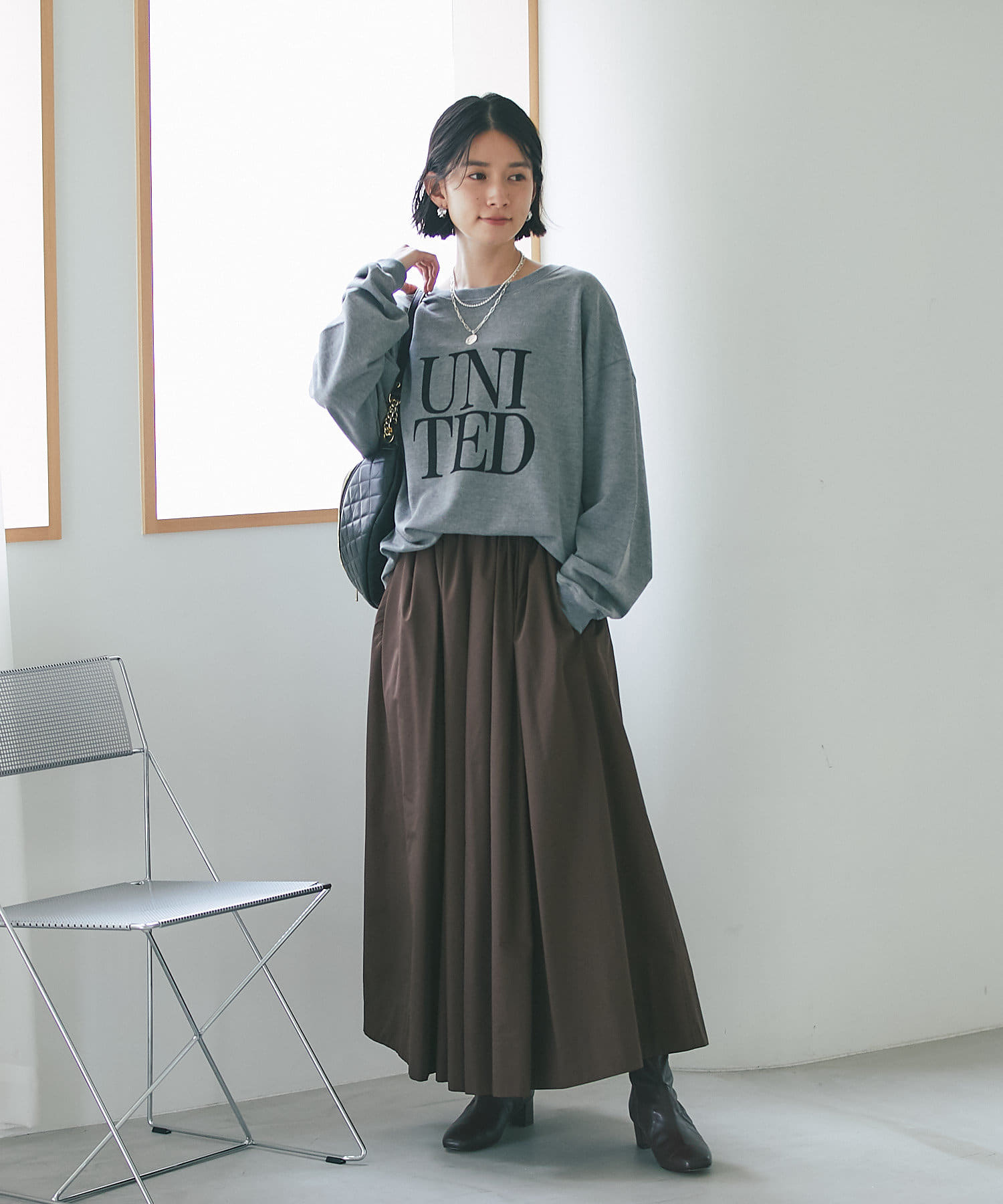ドレッシーな艶なあるアイテムやブーツなどでモードな着こなしにも◎