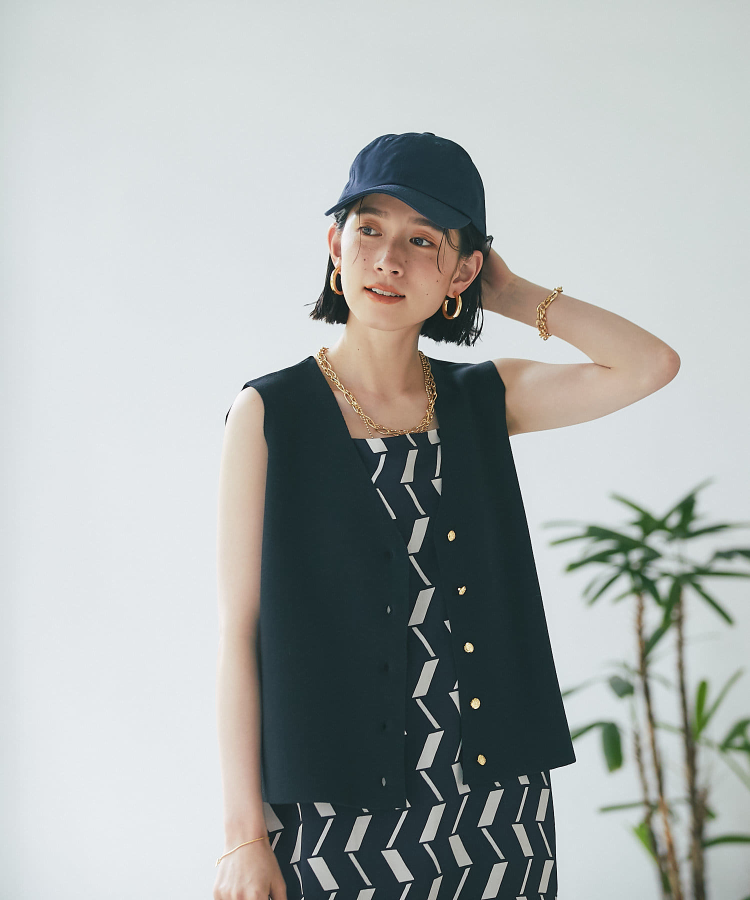 すっきりとしたシルエットでキレイめにも着れるニットベスト。