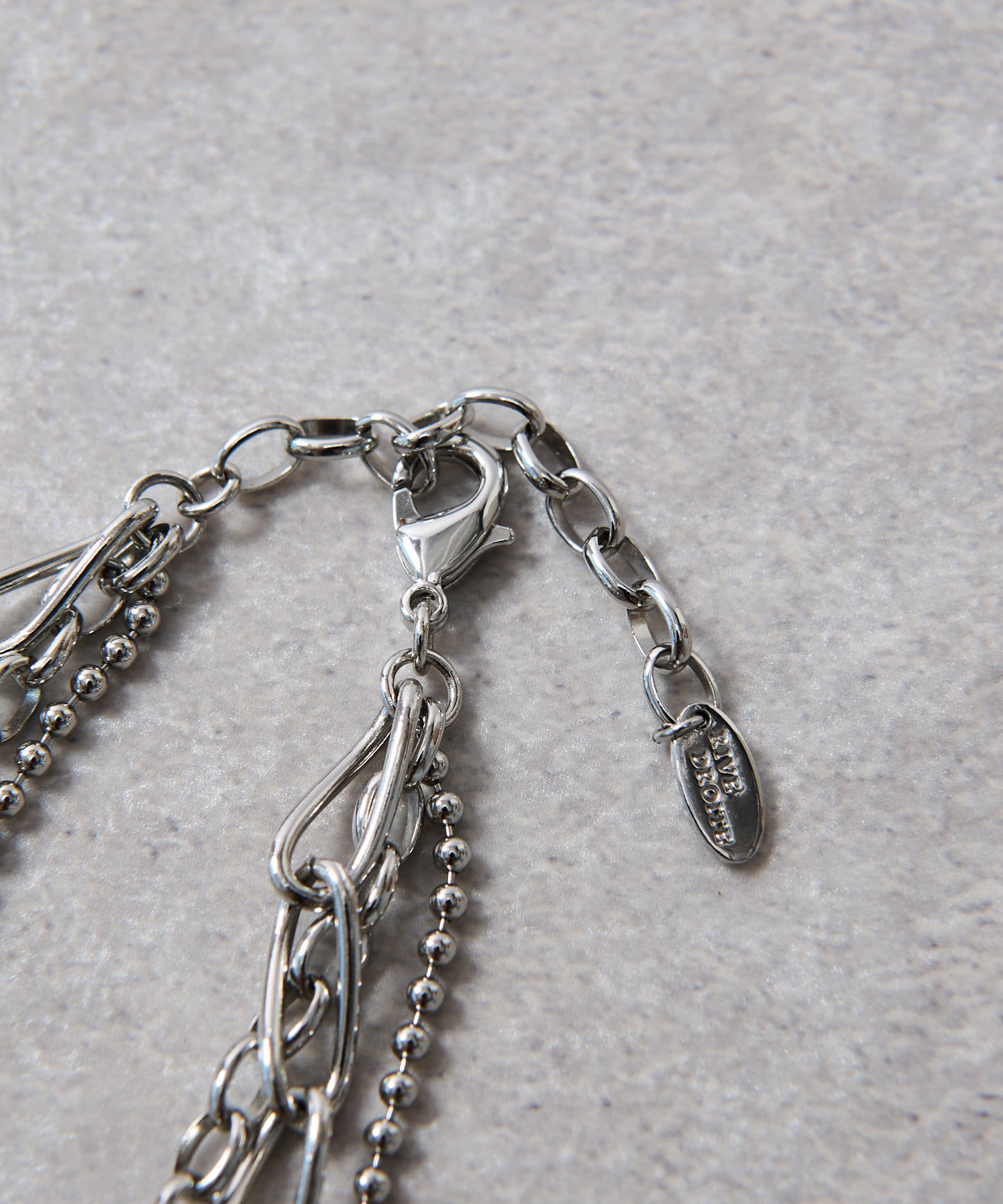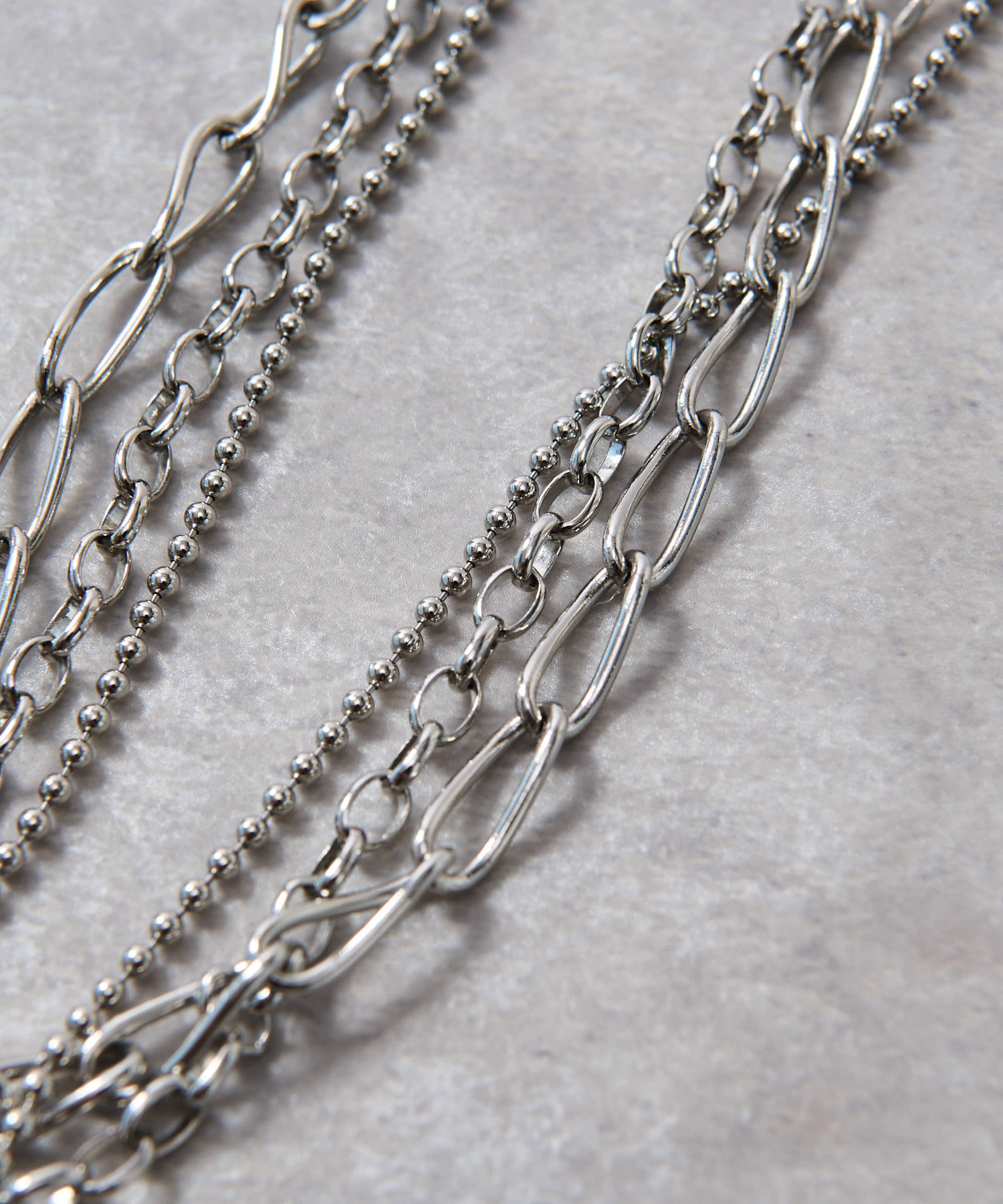 • 太さの異なる3つのチェーンを、じゃらっと重ね付けしたようなネックレス。
