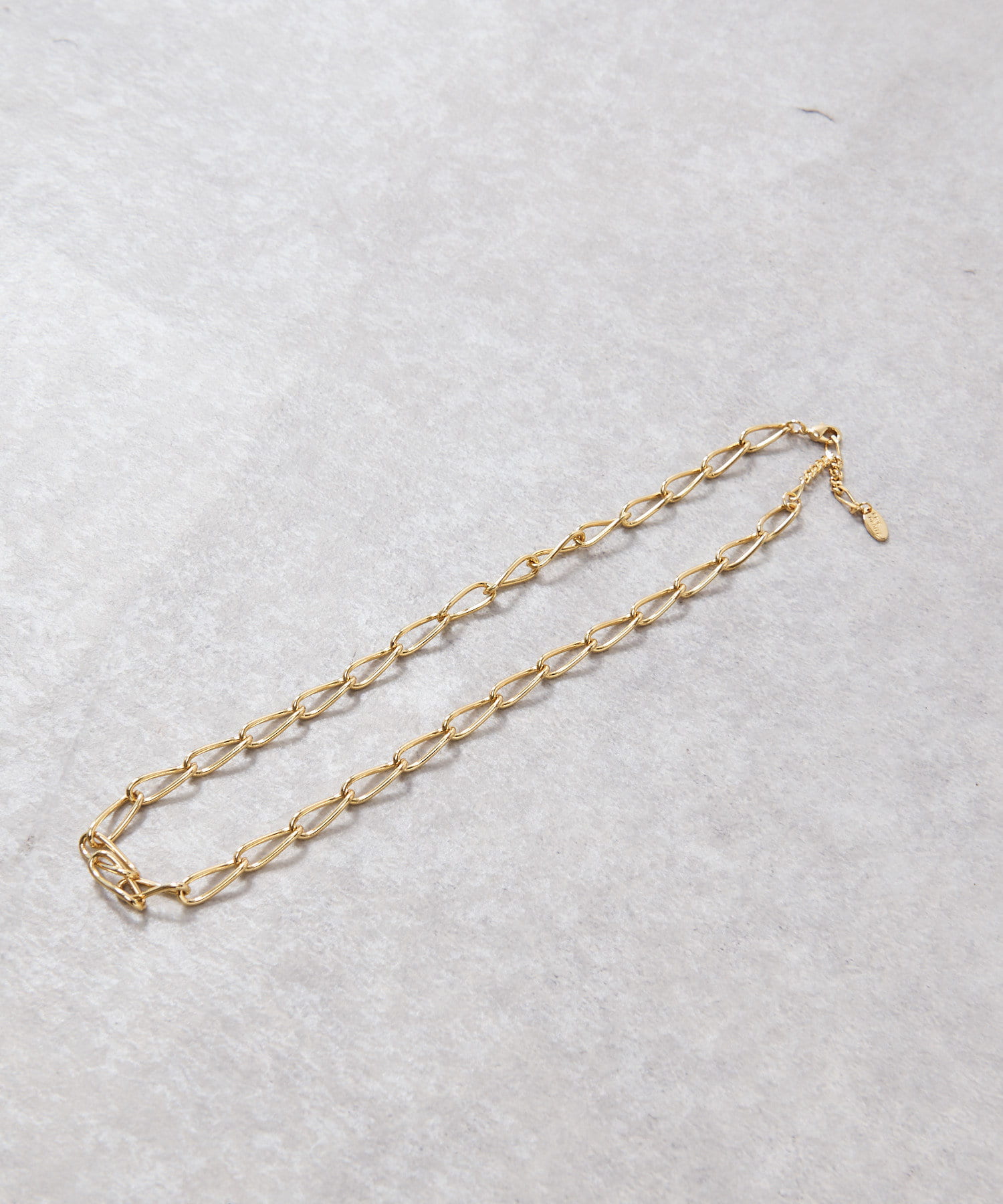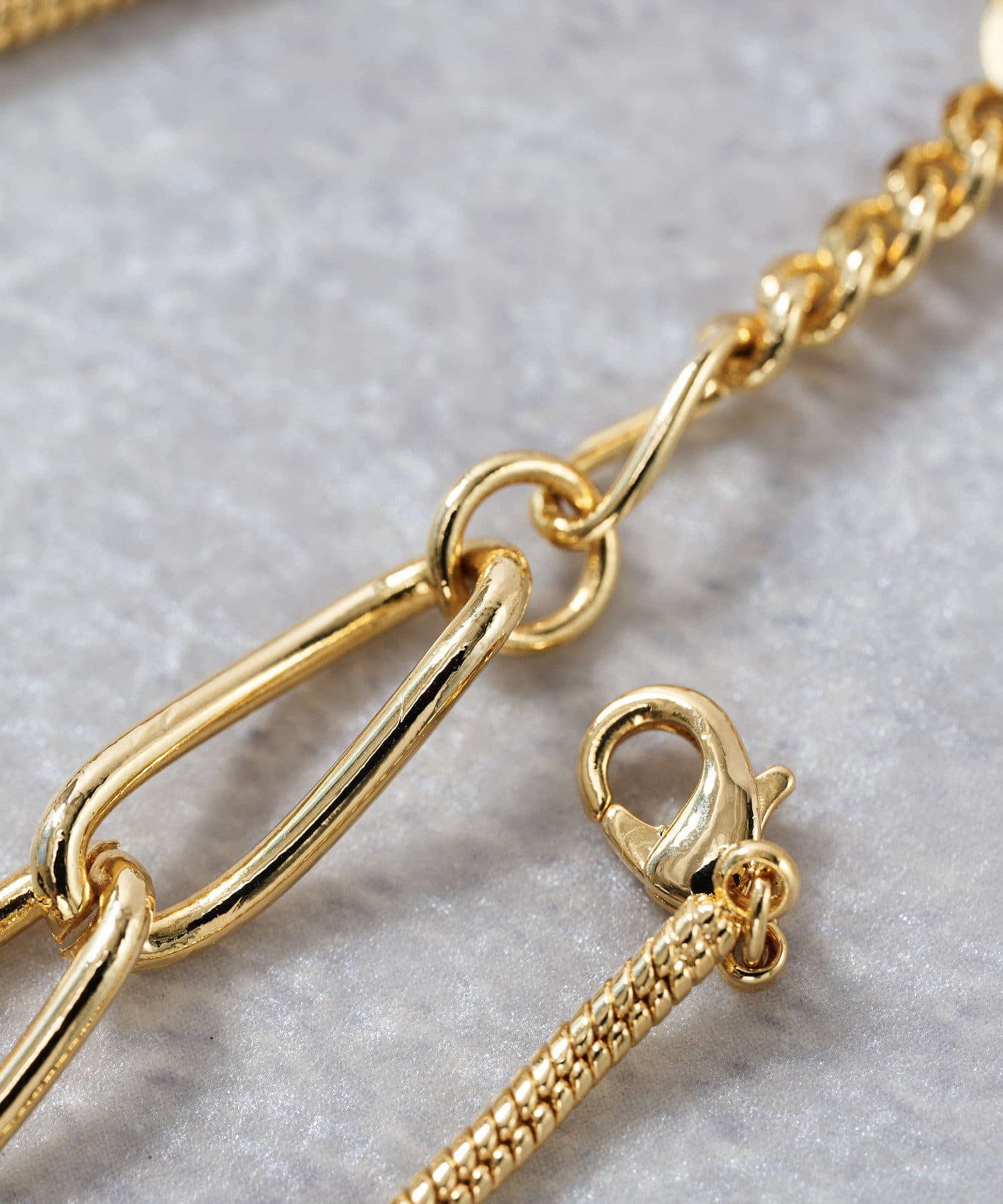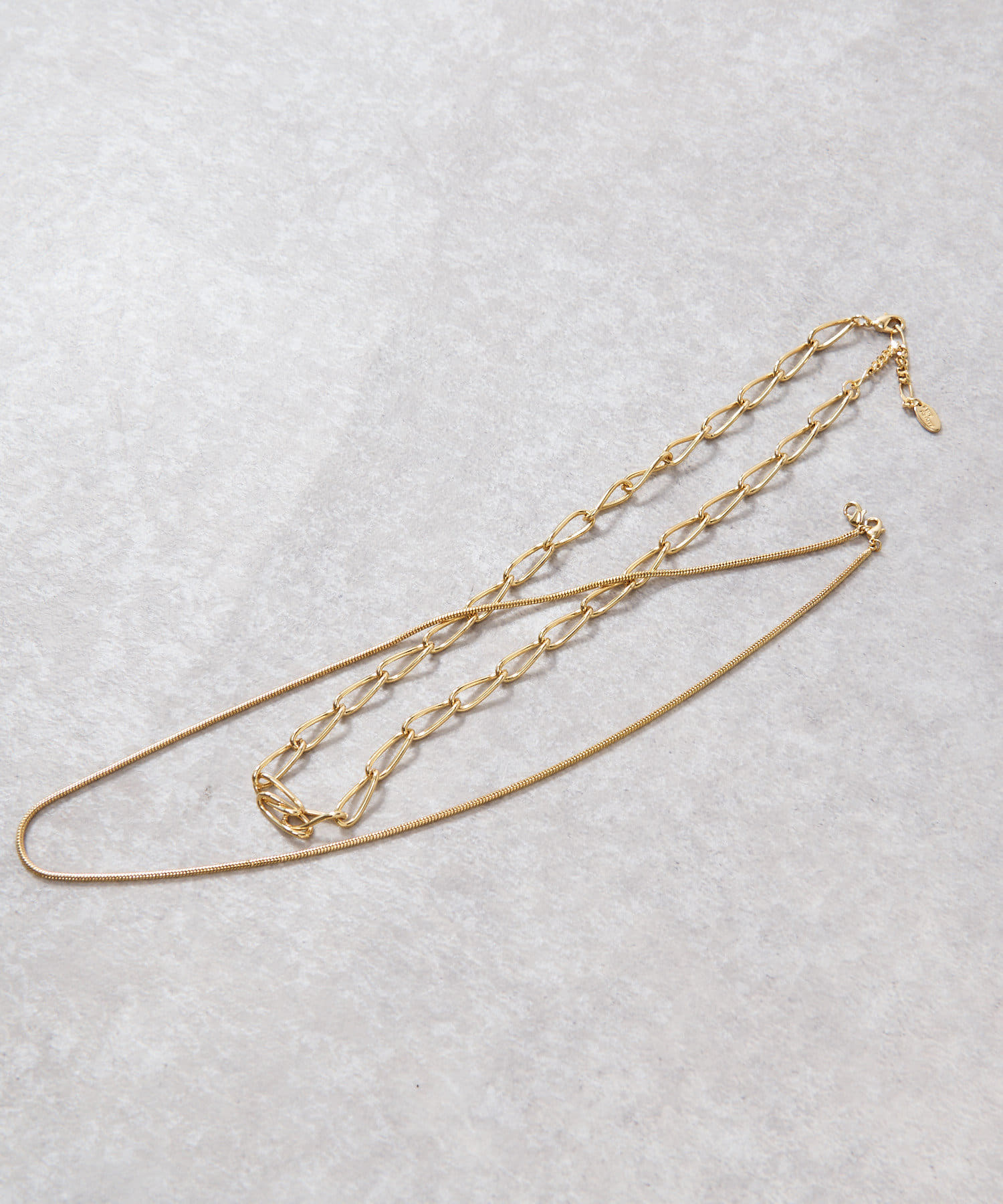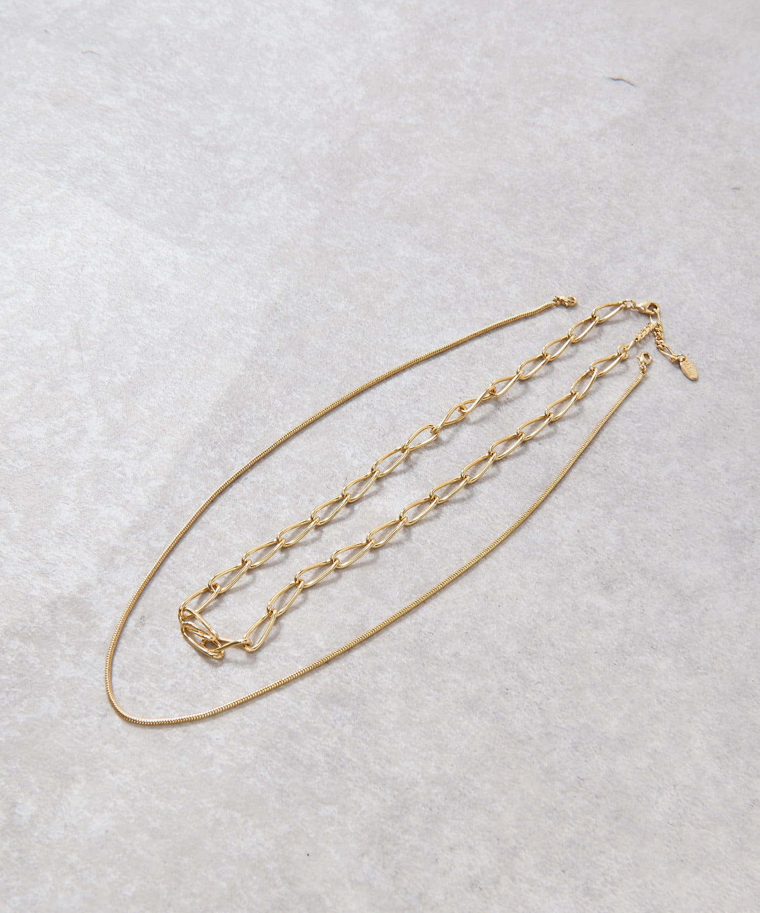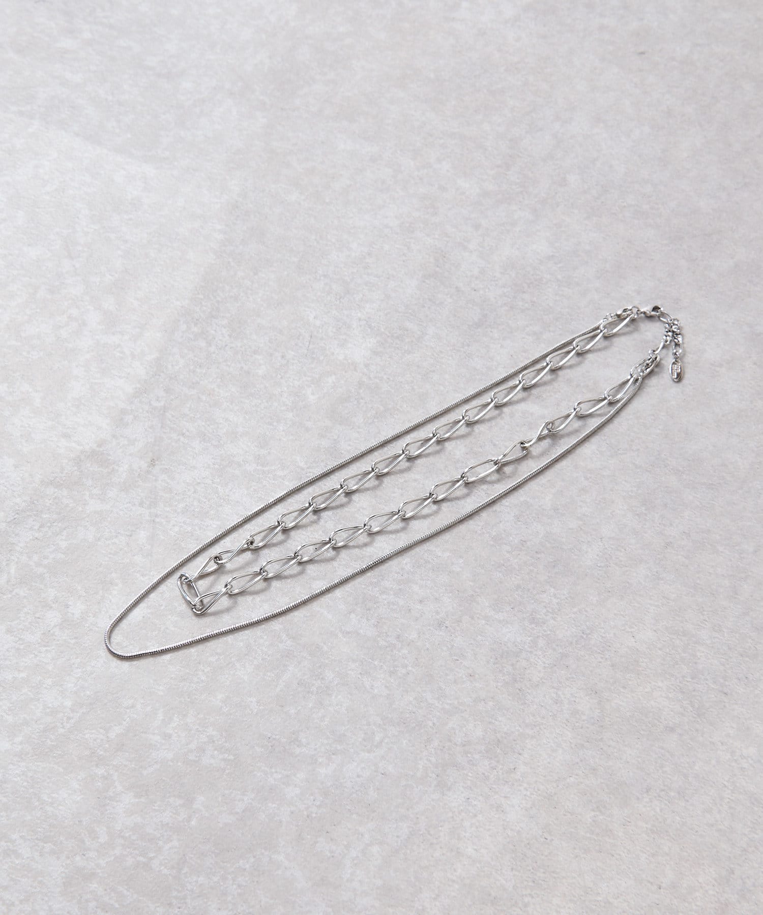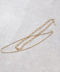 デザインの異なる2つのチェーンを重ね付けしたようなネックレス。