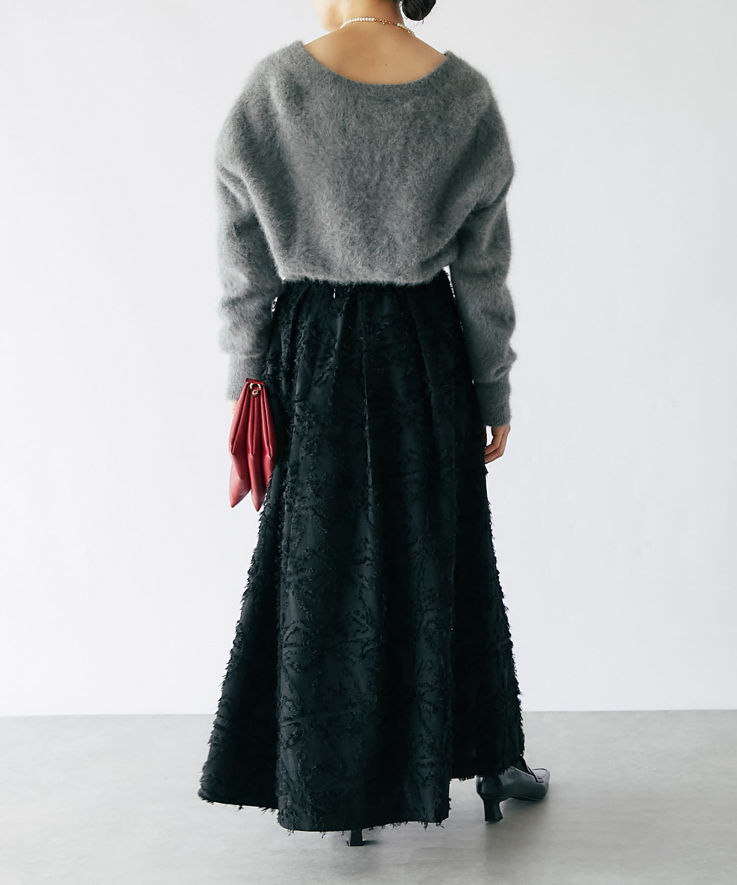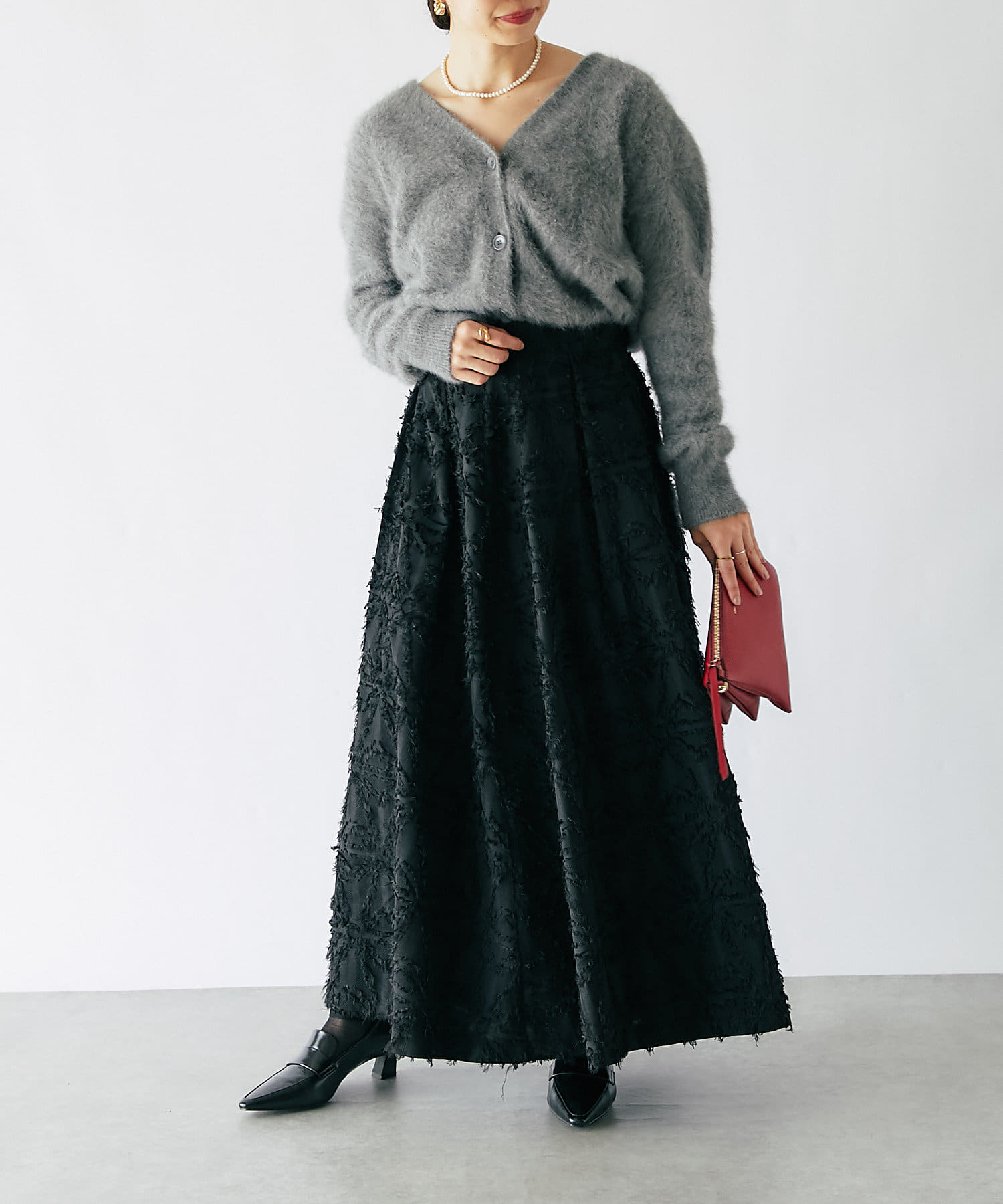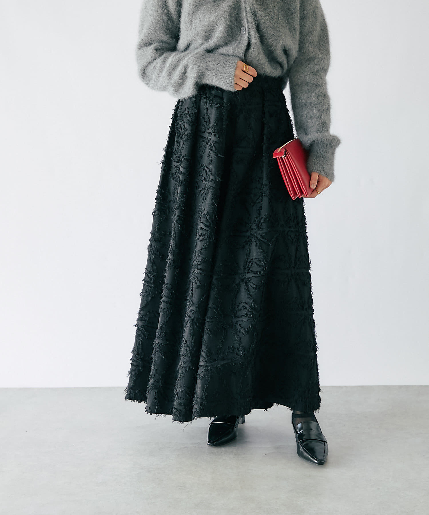 ジャガード生地を使ったフレアスカートは、美しい陰影が風合い豊かで、上質感のある一枚です。
