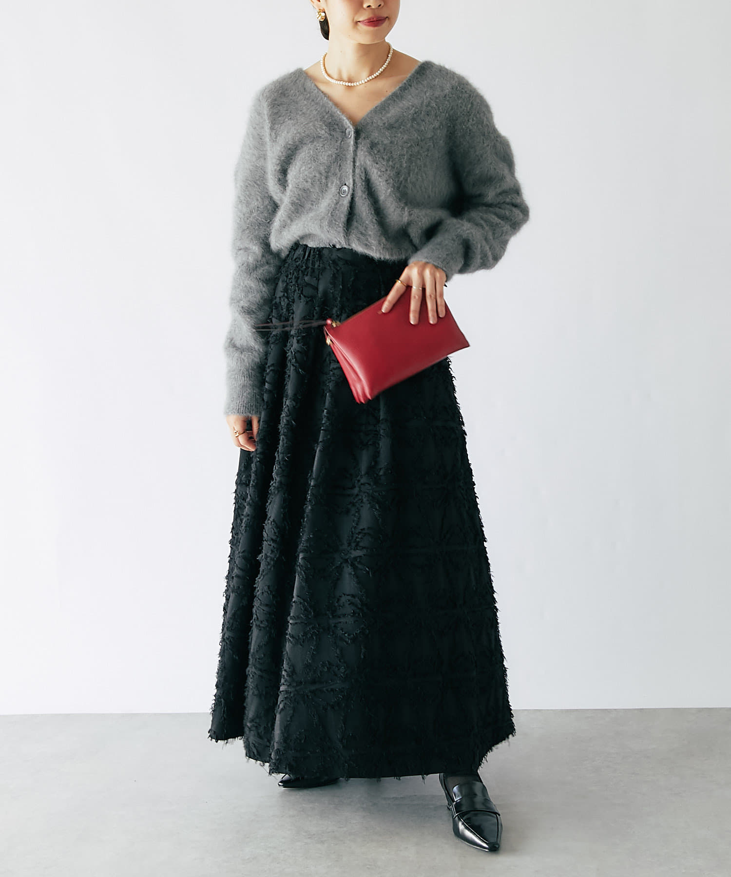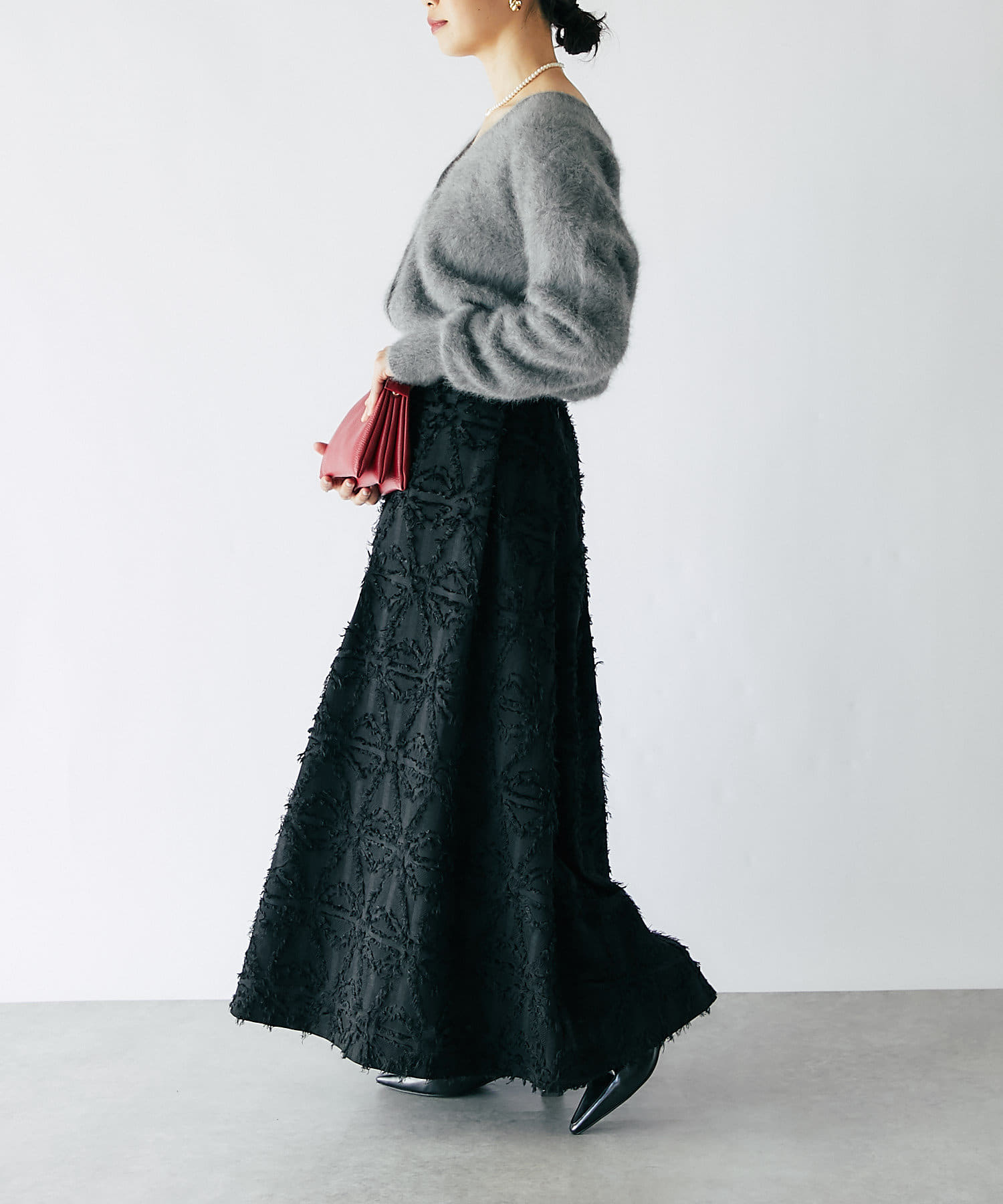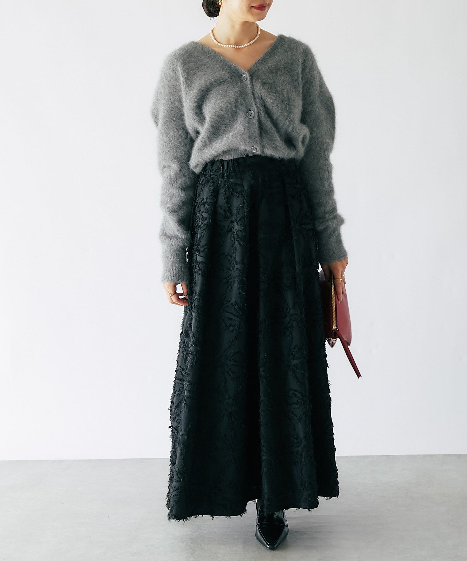 ジャガード生地を使ったフレアスカートは、美しい陰影が風合い豊かで、上質感のある一枚です。